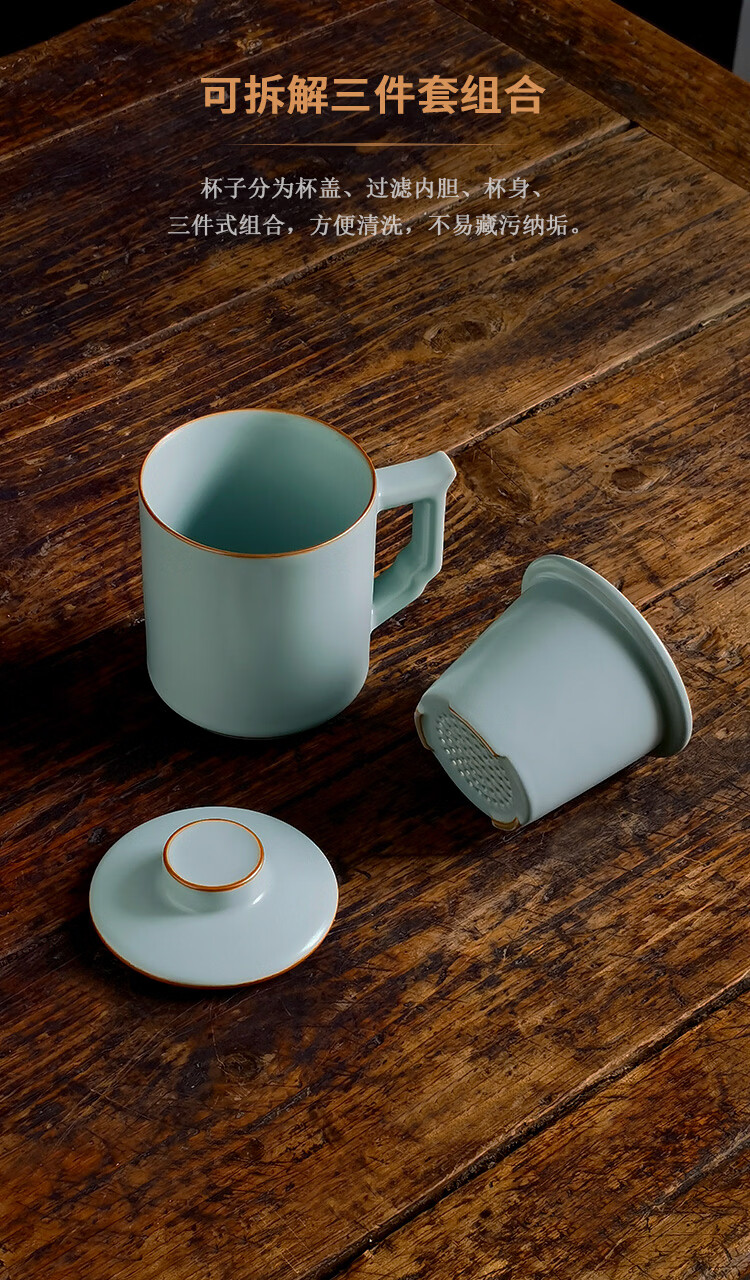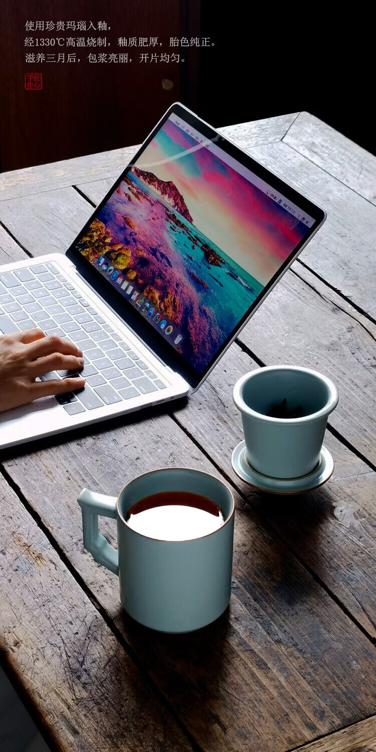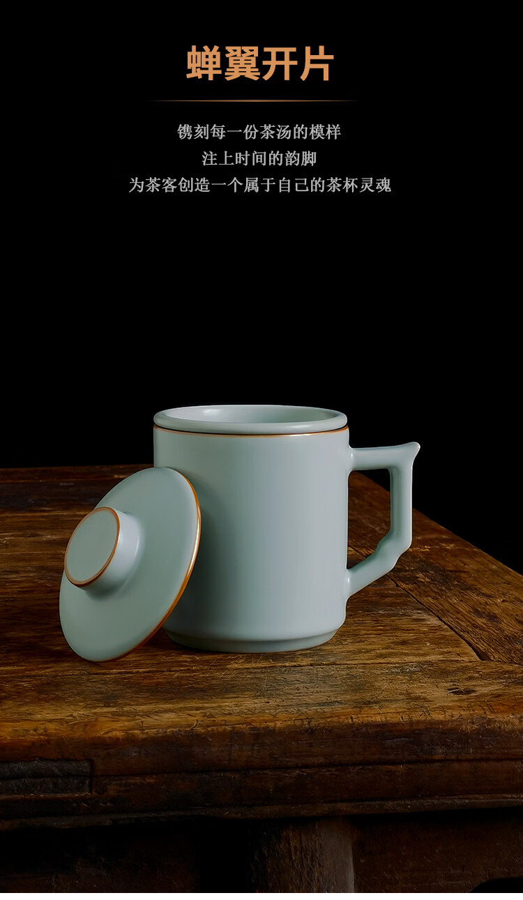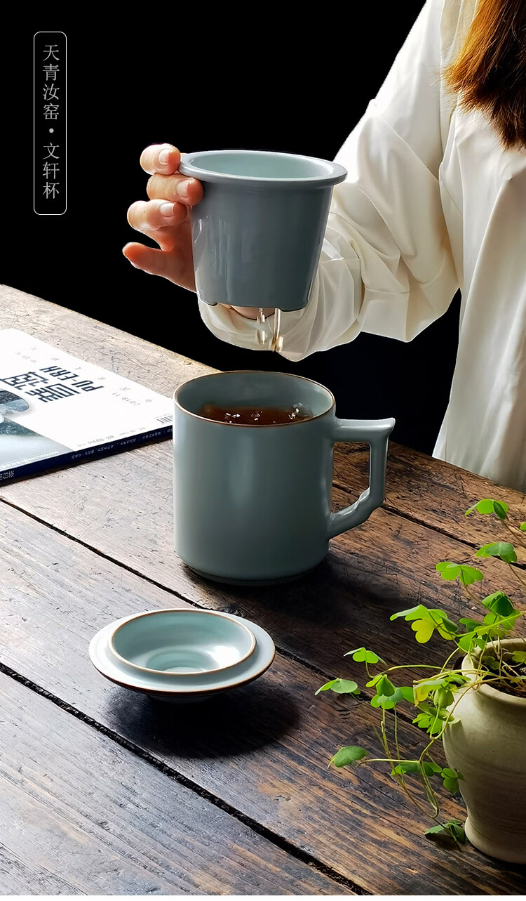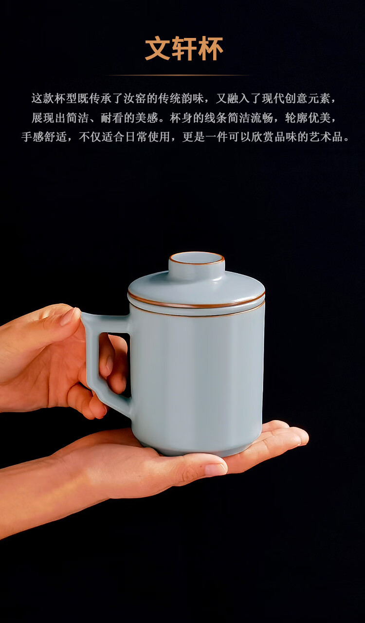 青禾窑汝窑马克杯开片可养陶瓷茶杯大容量带盖过滤茶水分离杯家用办公杯 天青汝窑文轩杯(395ml 安全包装)
