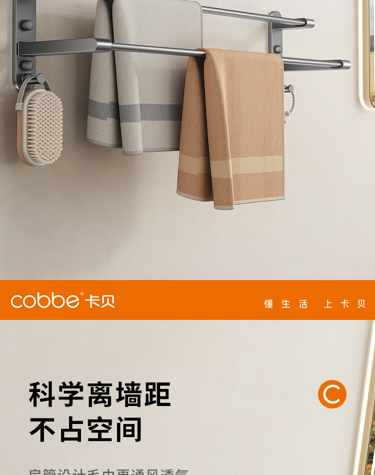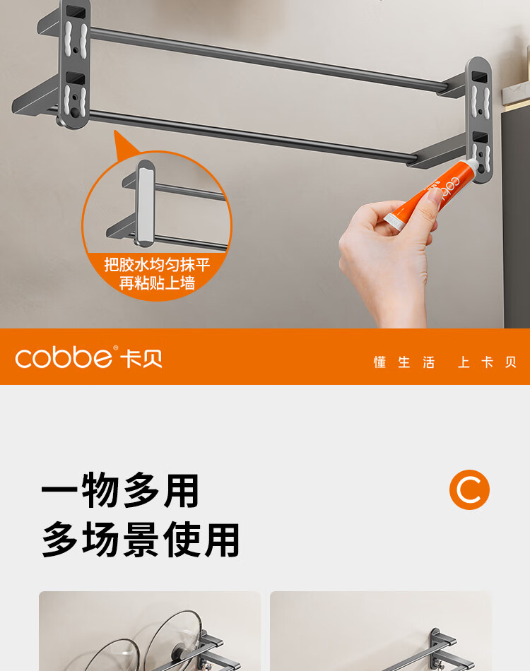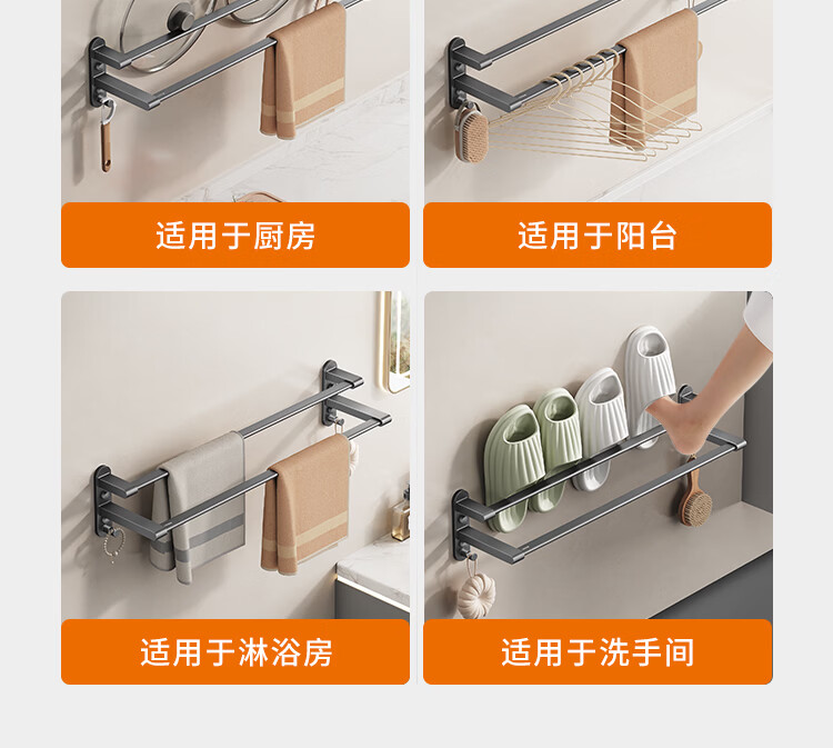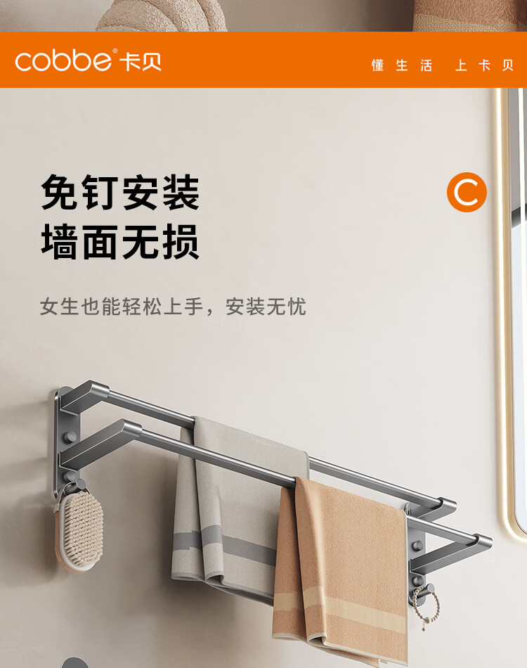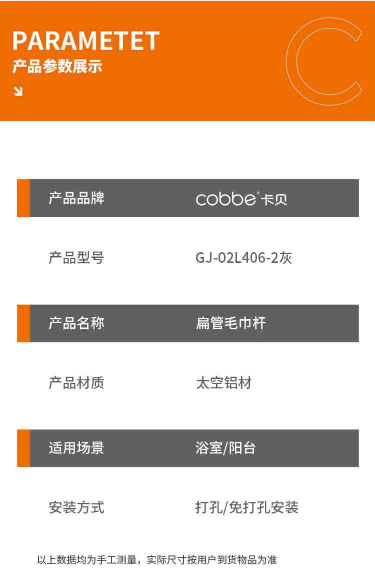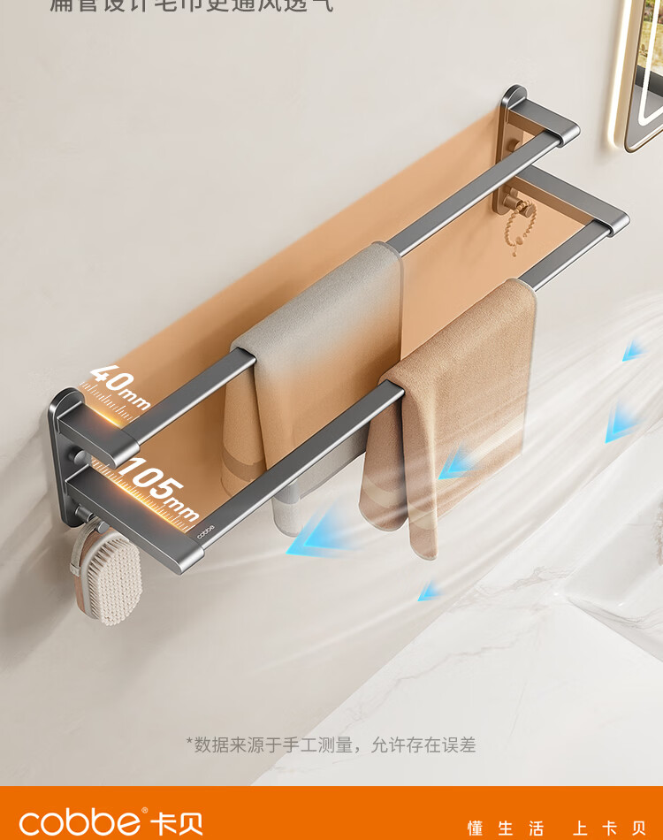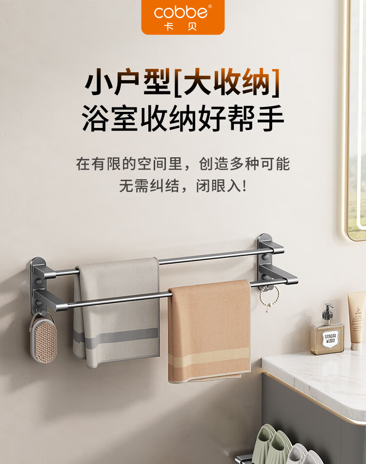 卡贝(cobbe)浴室毛巾杆 免打孔小户型扁管毛巾架 卫生间收纳挂架 太空铝挂杆 【打孔/免钉】枪灰-70cm单杆
