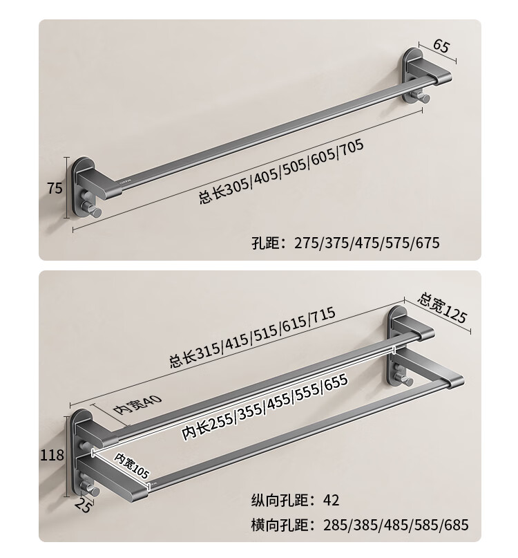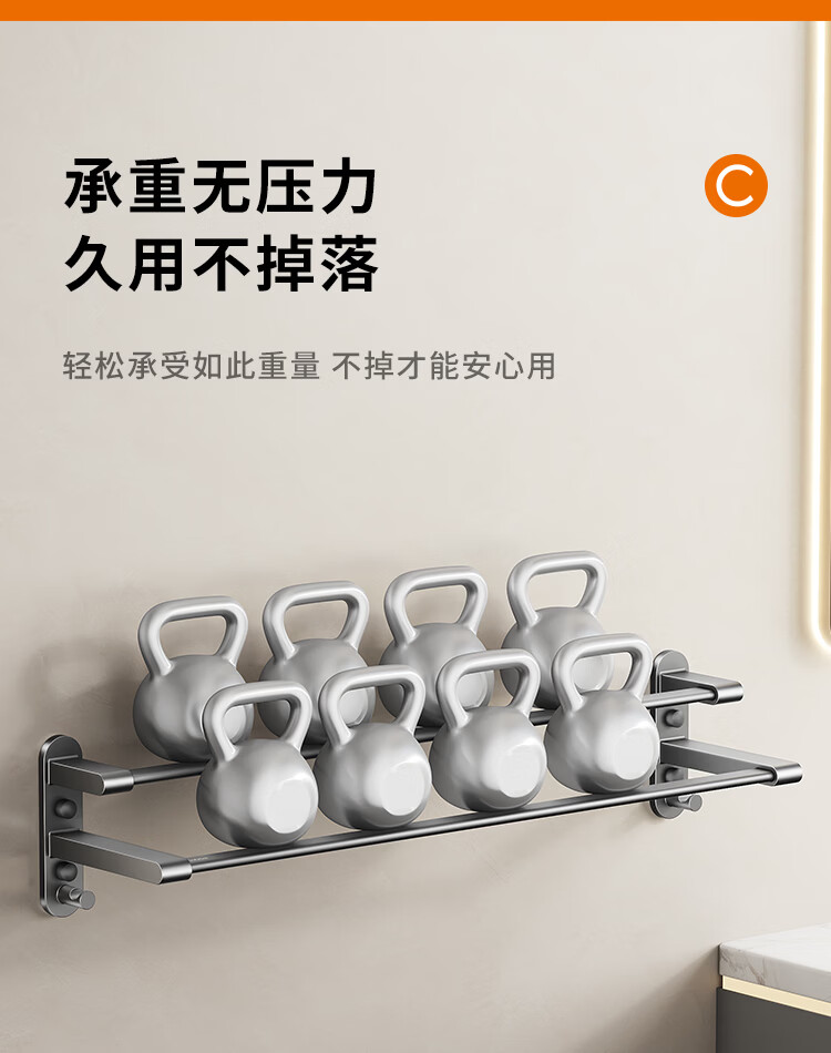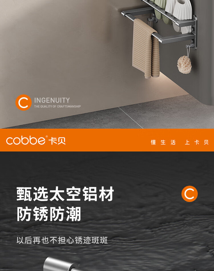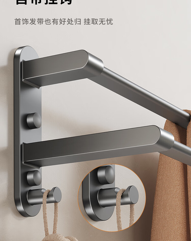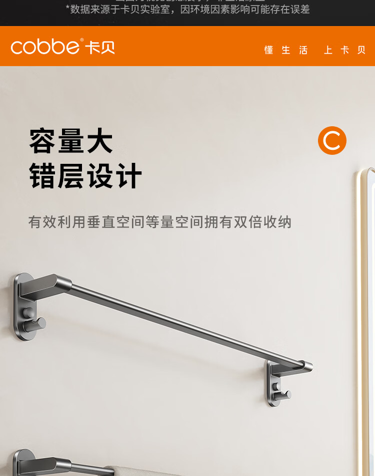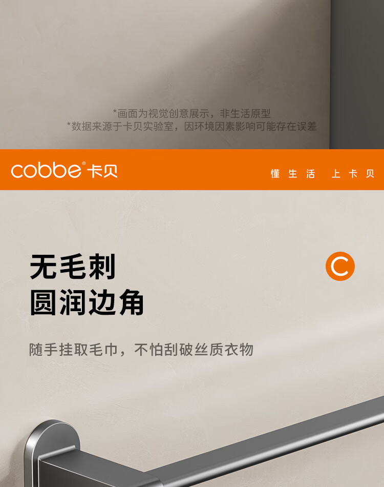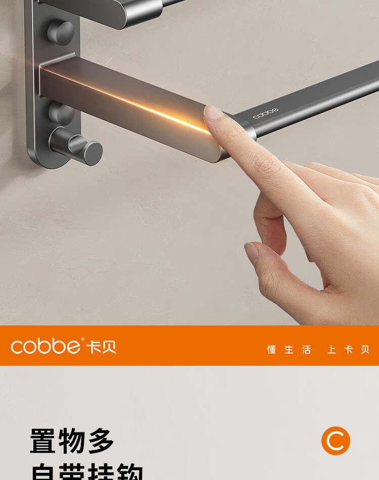 卡贝(cobbe)浴室毛巾杆 免打孔小户型扁管毛巾架 卫生间收纳挂架 太空铝挂杆 【打孔/免钉】枪灰-70cm单杆