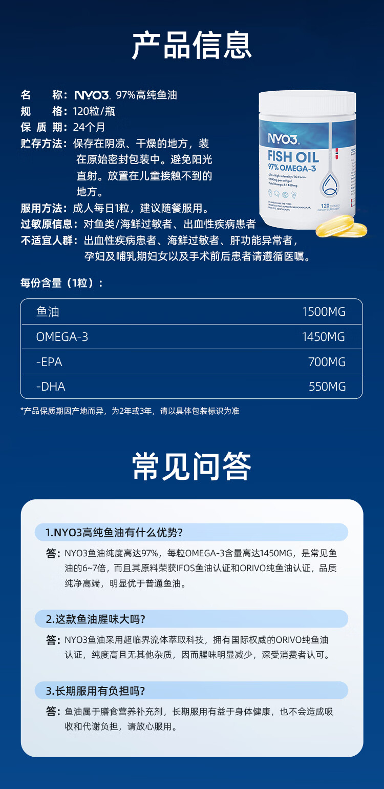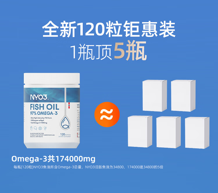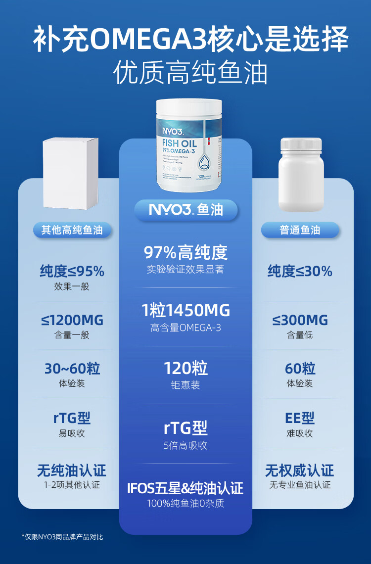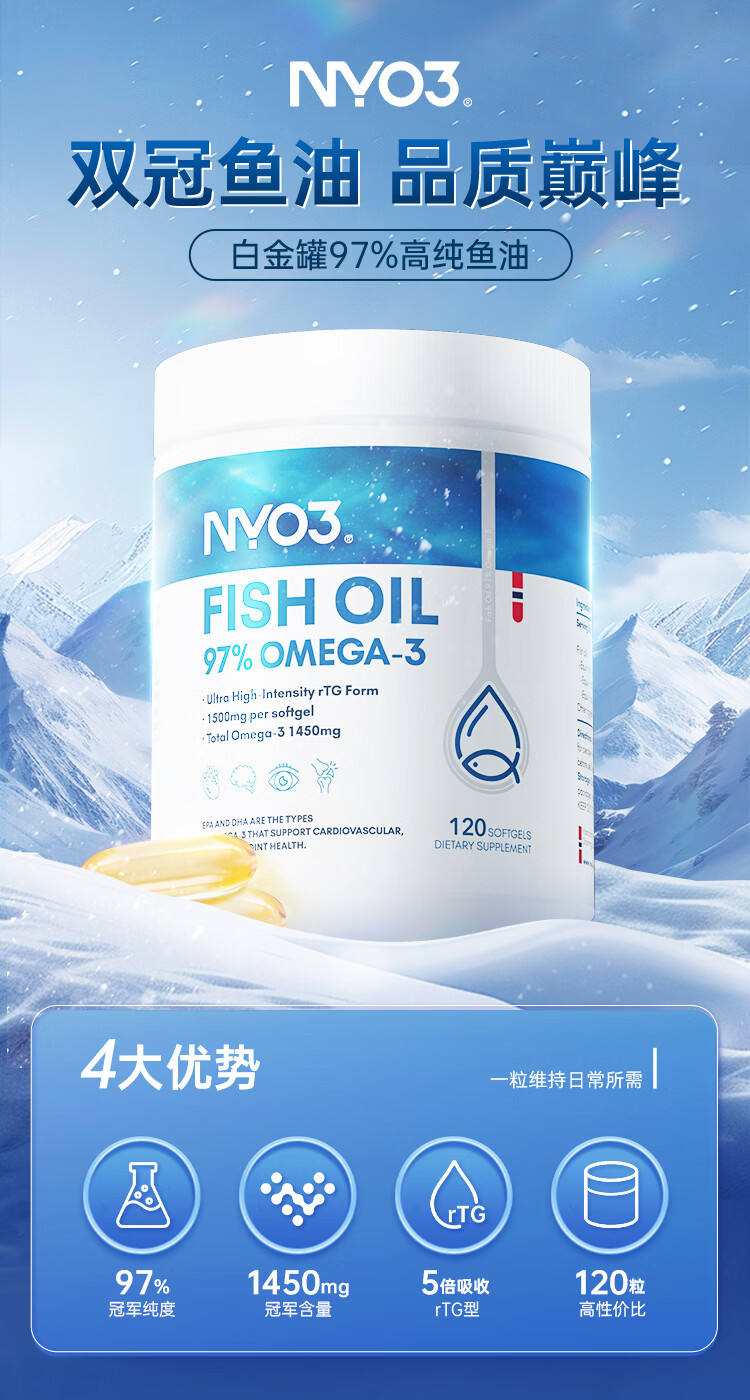 NYO3 97%高纯度rTG结构深海鱼油胶囊 1450mgOmega-3 EPA+DHA 120粒/瓶