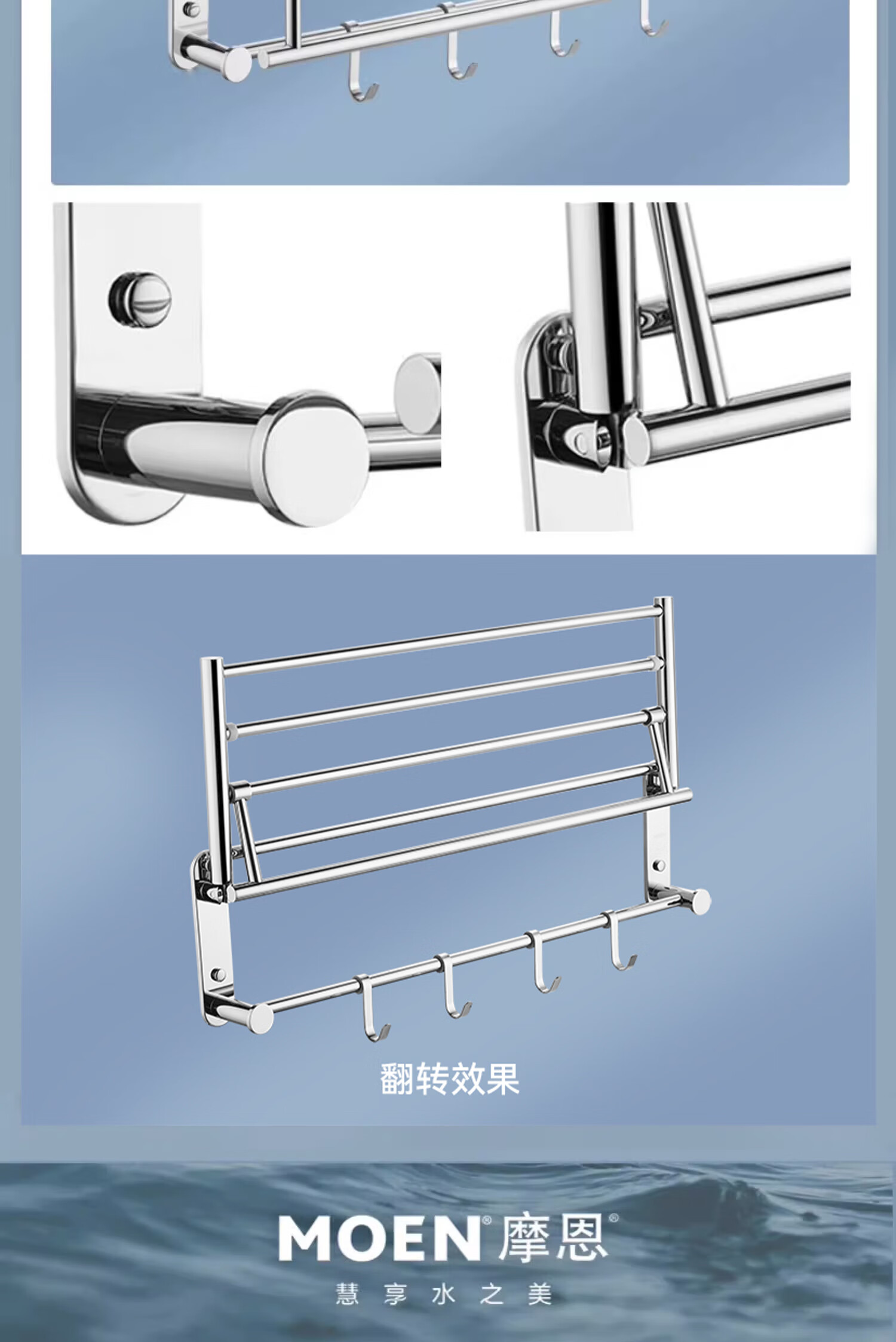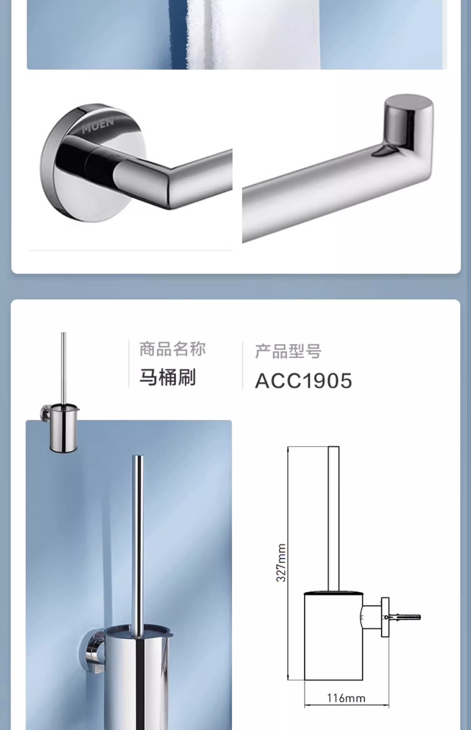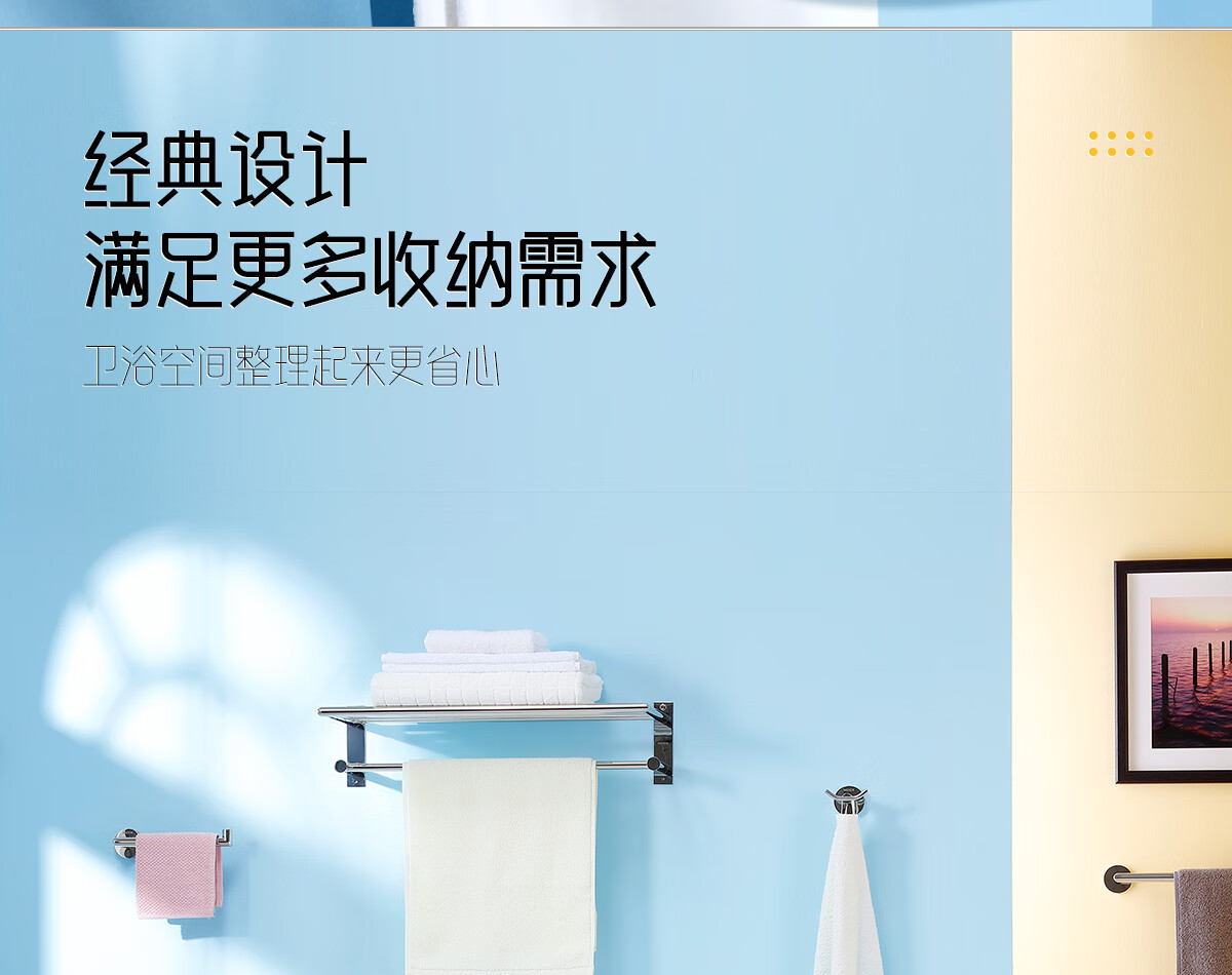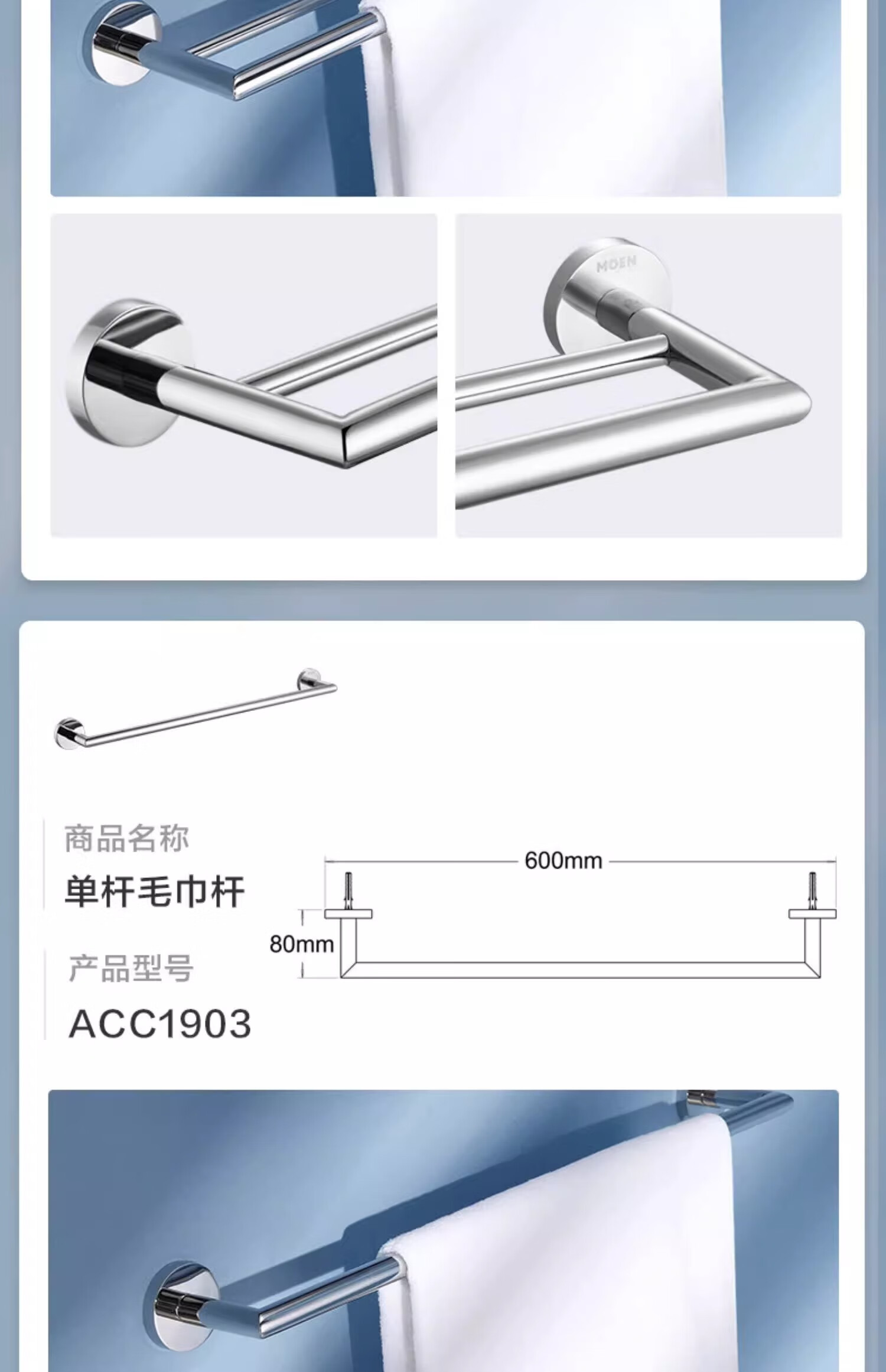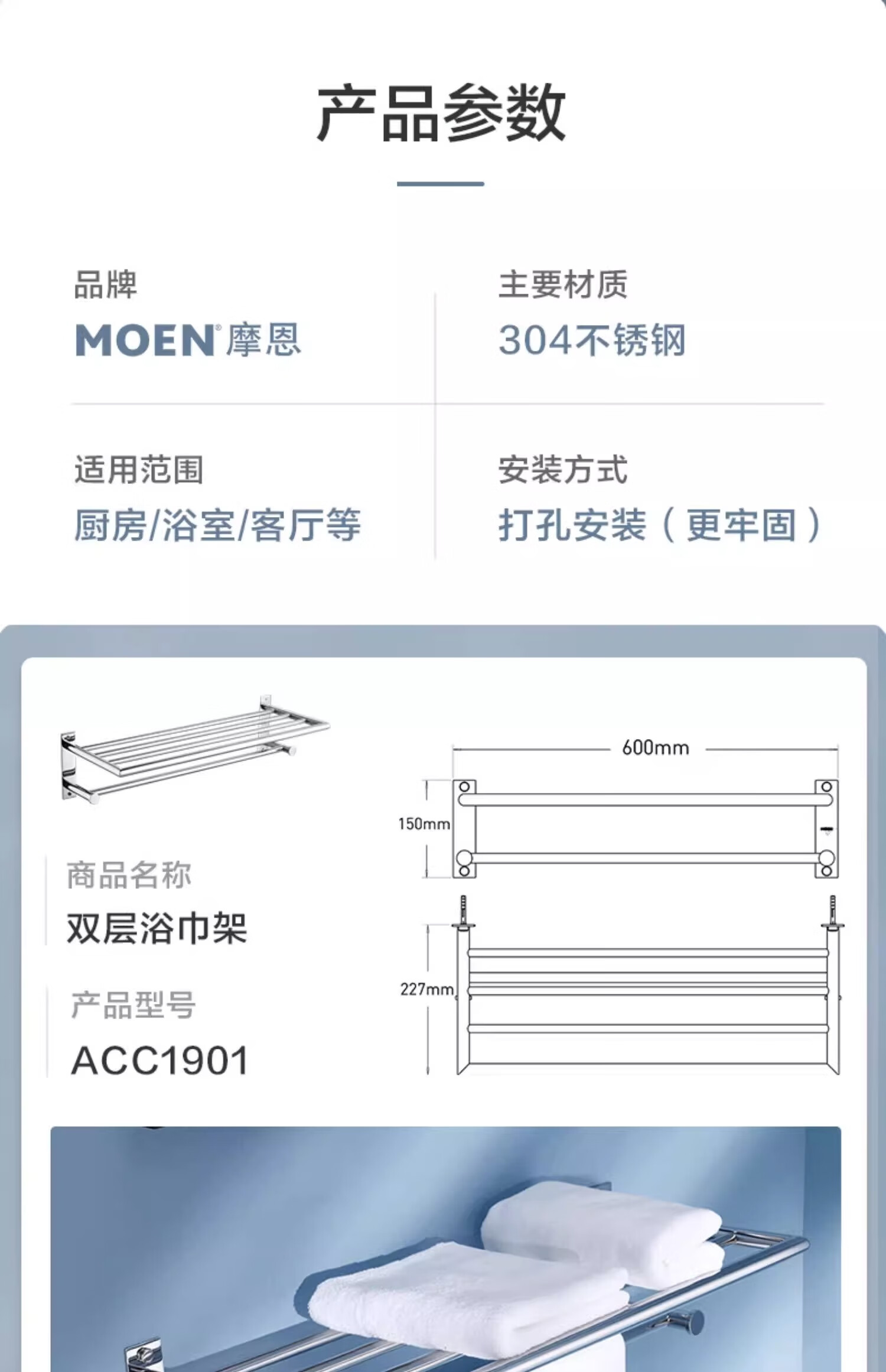 摩恩(MOEN)卫生间不锈钢浴巾架浴室毛巾架置物架卫浴挂件套装1901A 双杆毛巾杆(免钉)