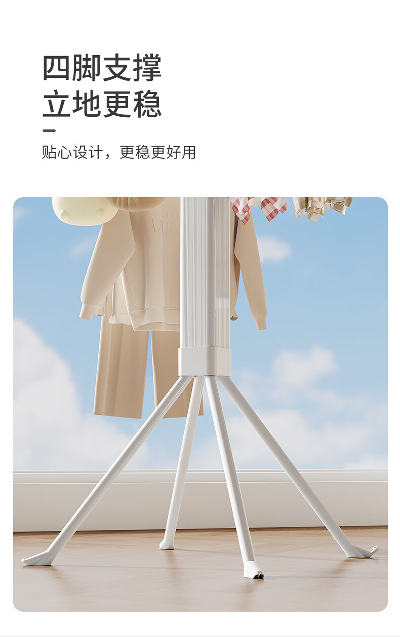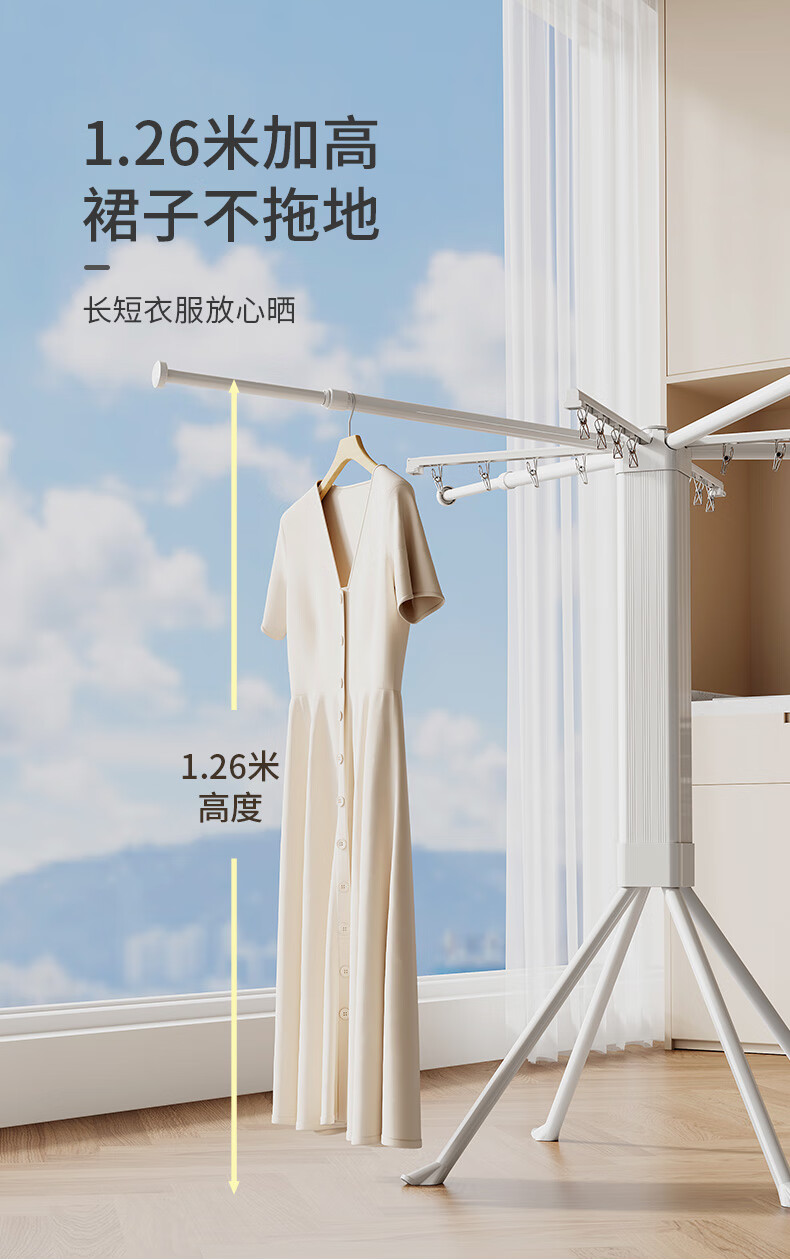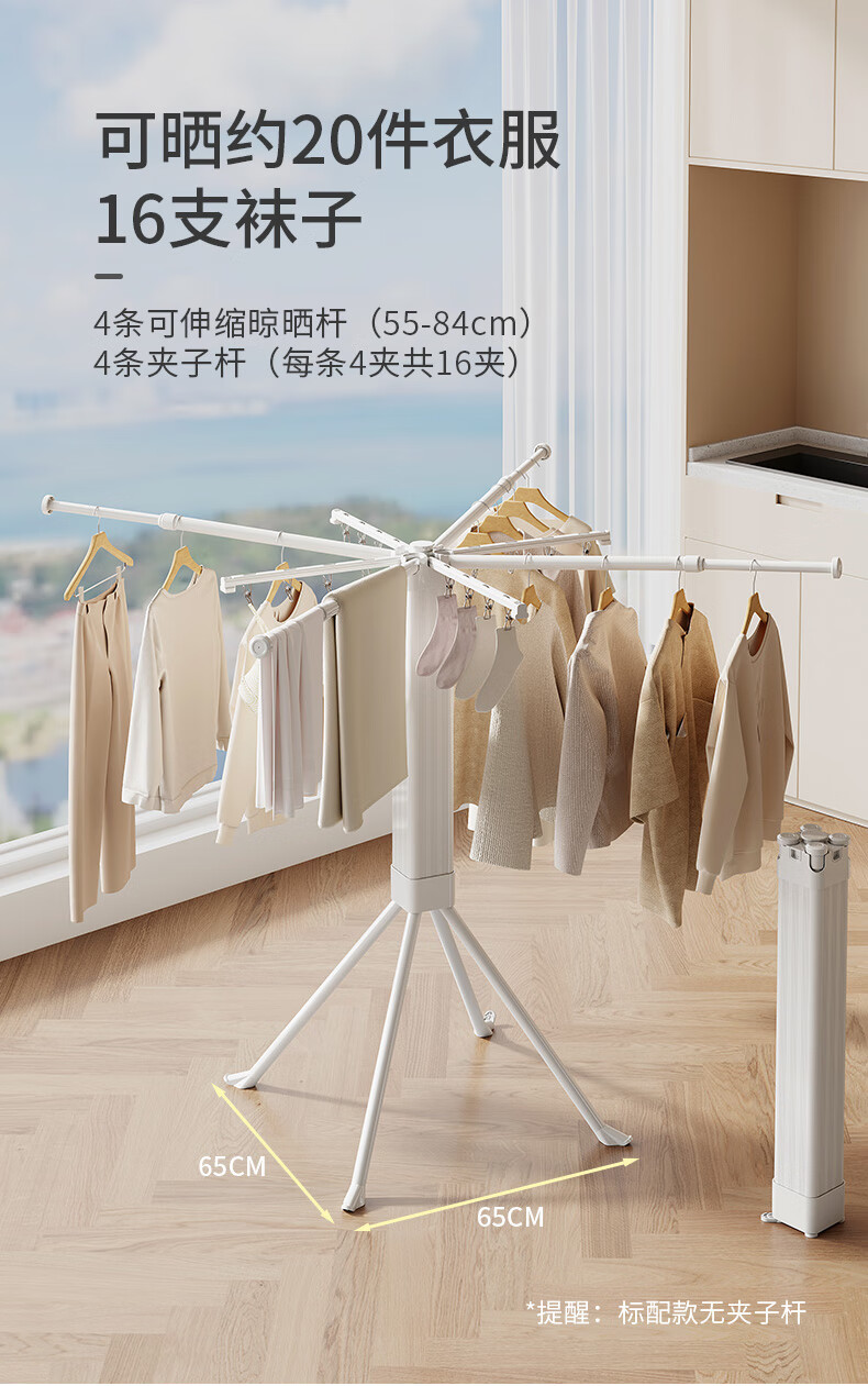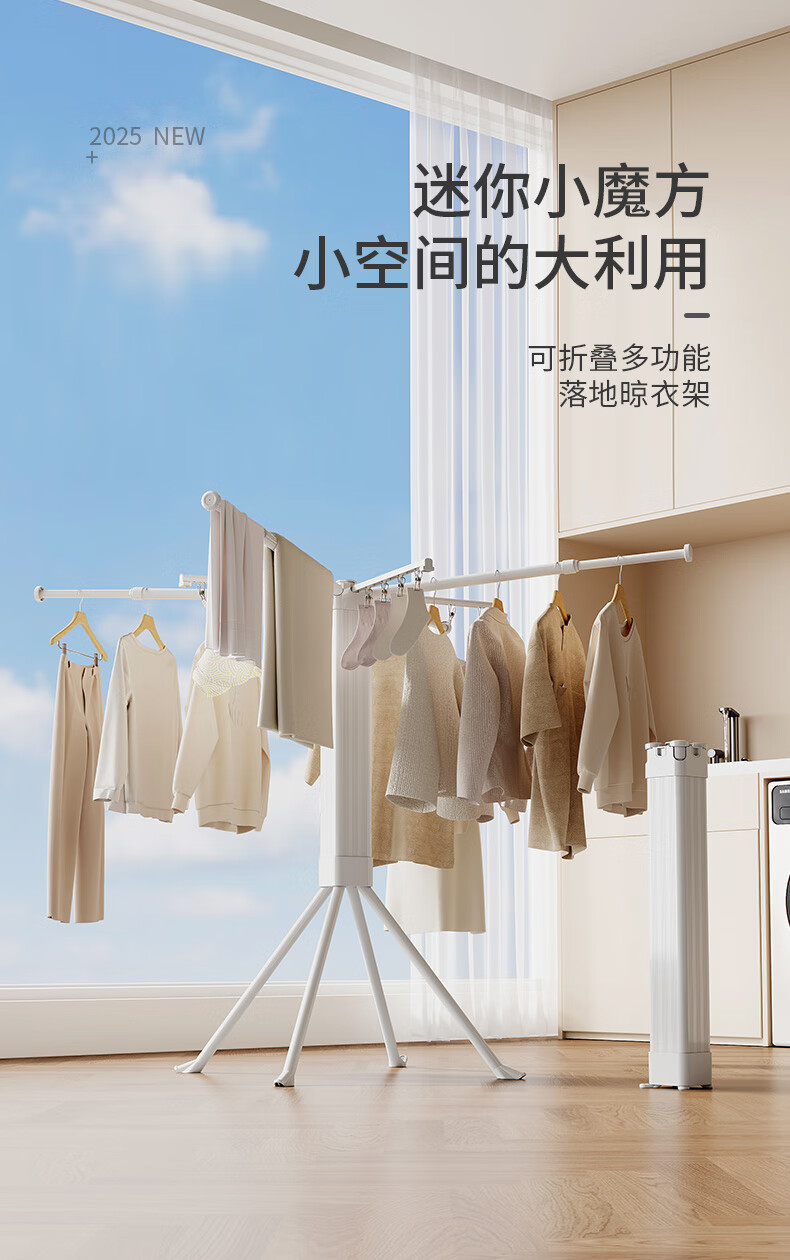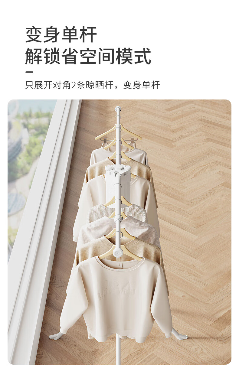 吱凡日本折叠晾衣架室内阳台家用落地隐形伸缩凉衣杆小型多功能晒被子 【标配版】茉莉白-太空铝4杆