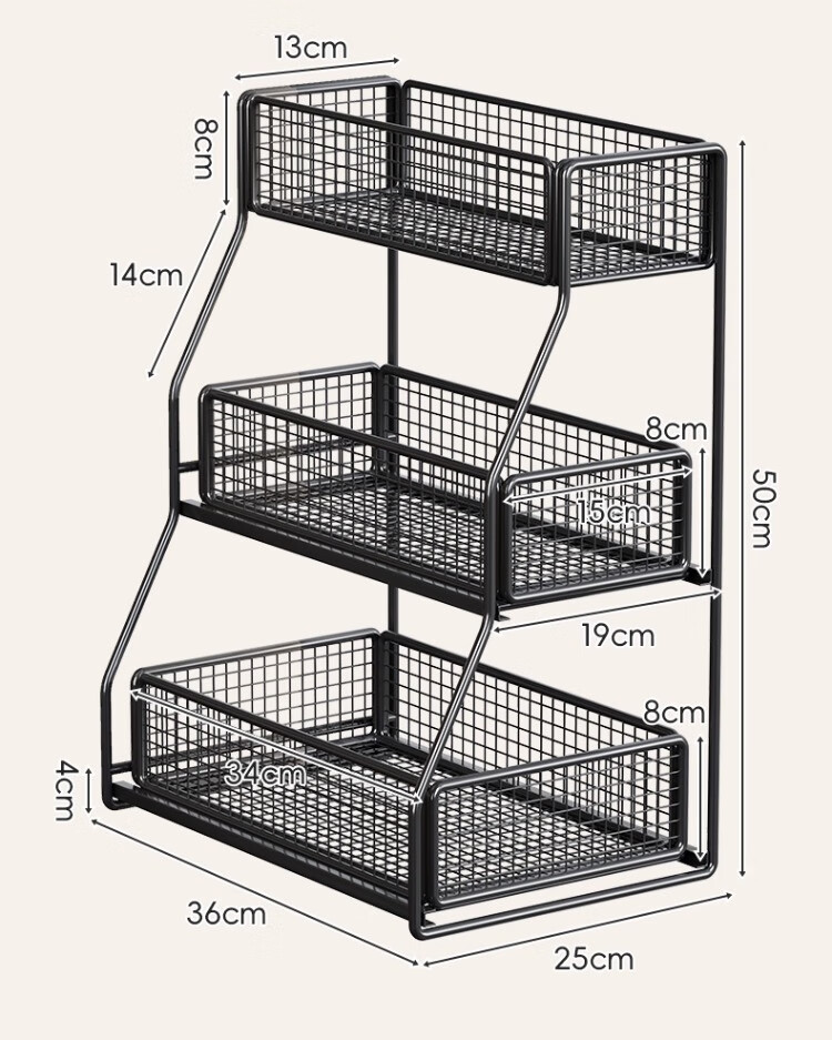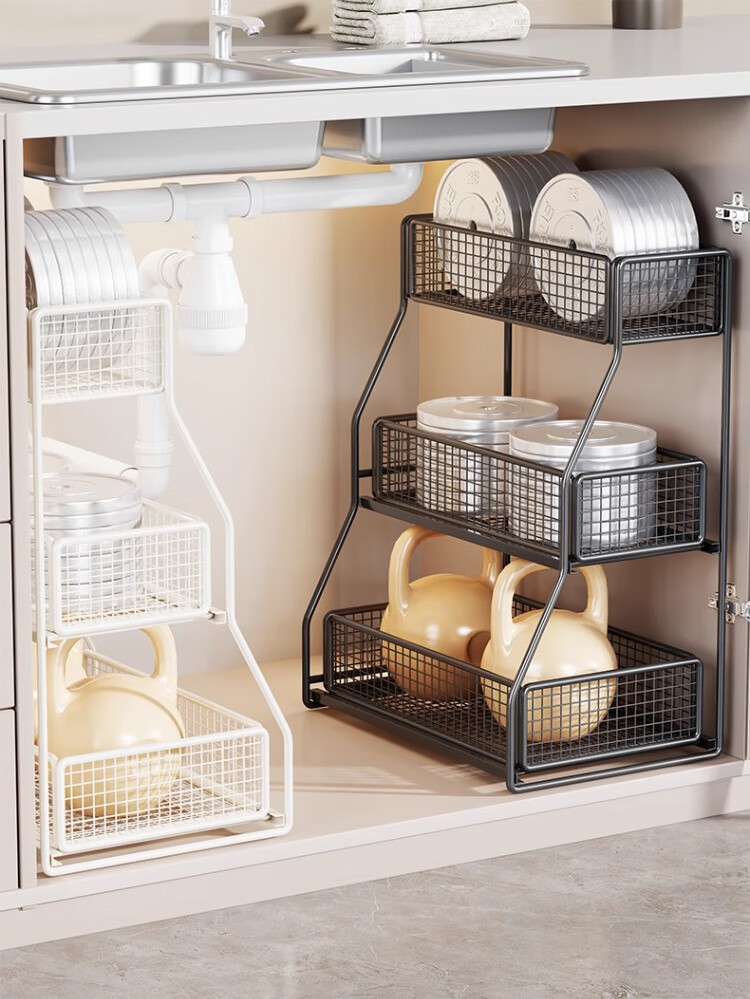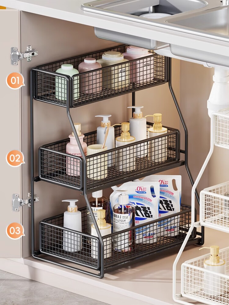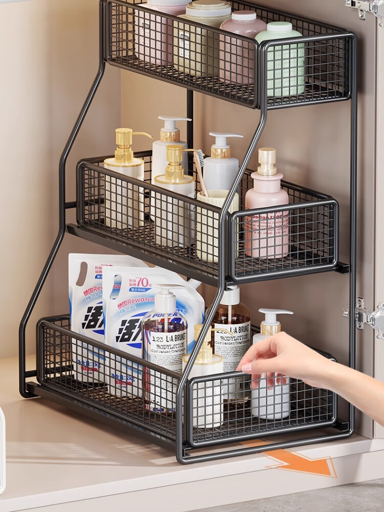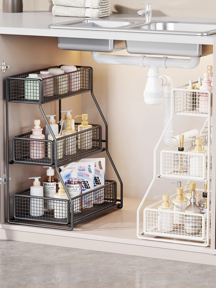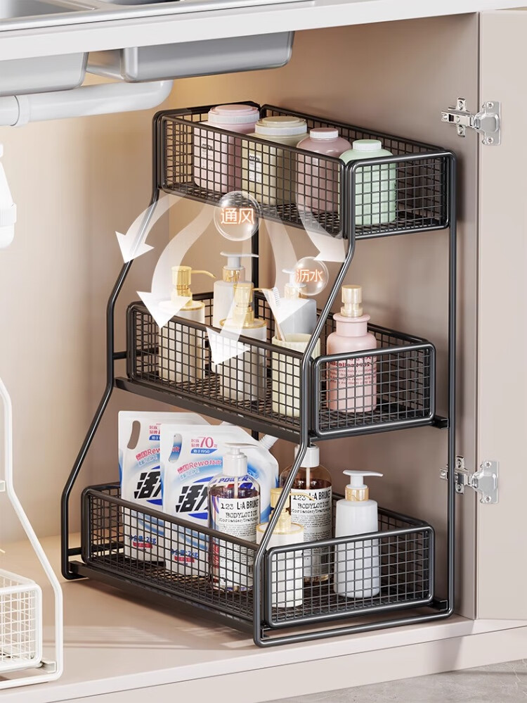 尔思家厨房架置物架下水槽橱柜下内置分层架落地一体靠墙免安装沥水架 黑色-三层_左抽屉