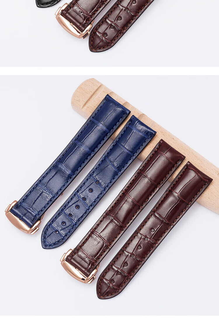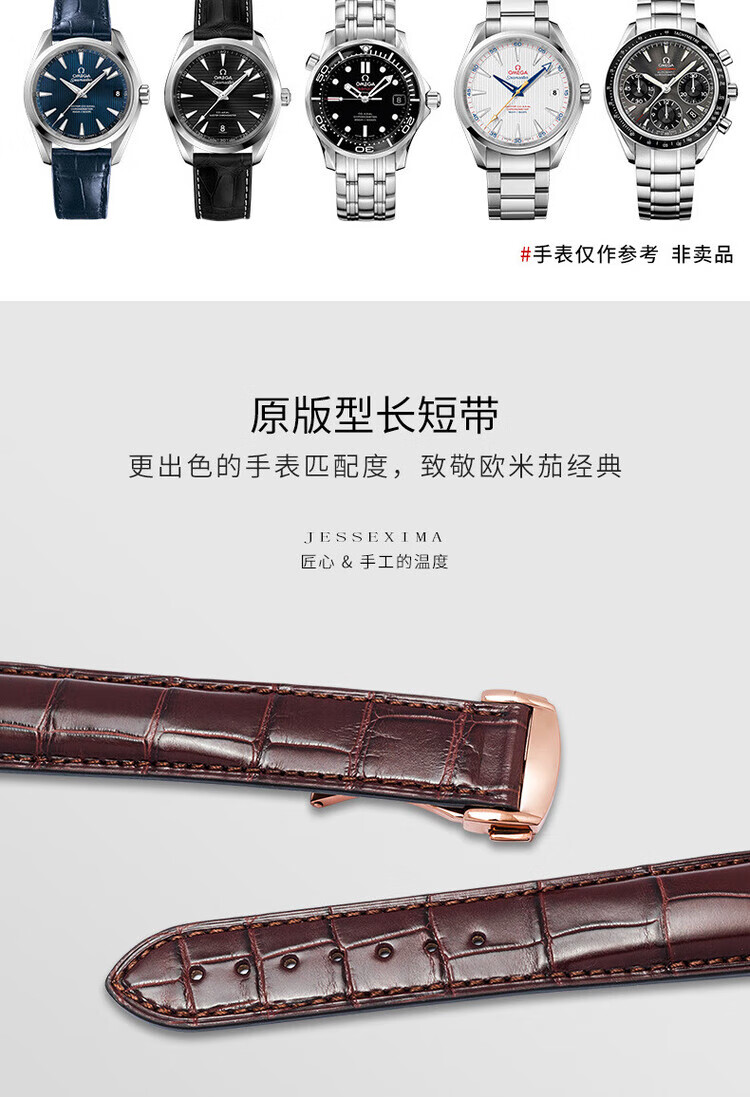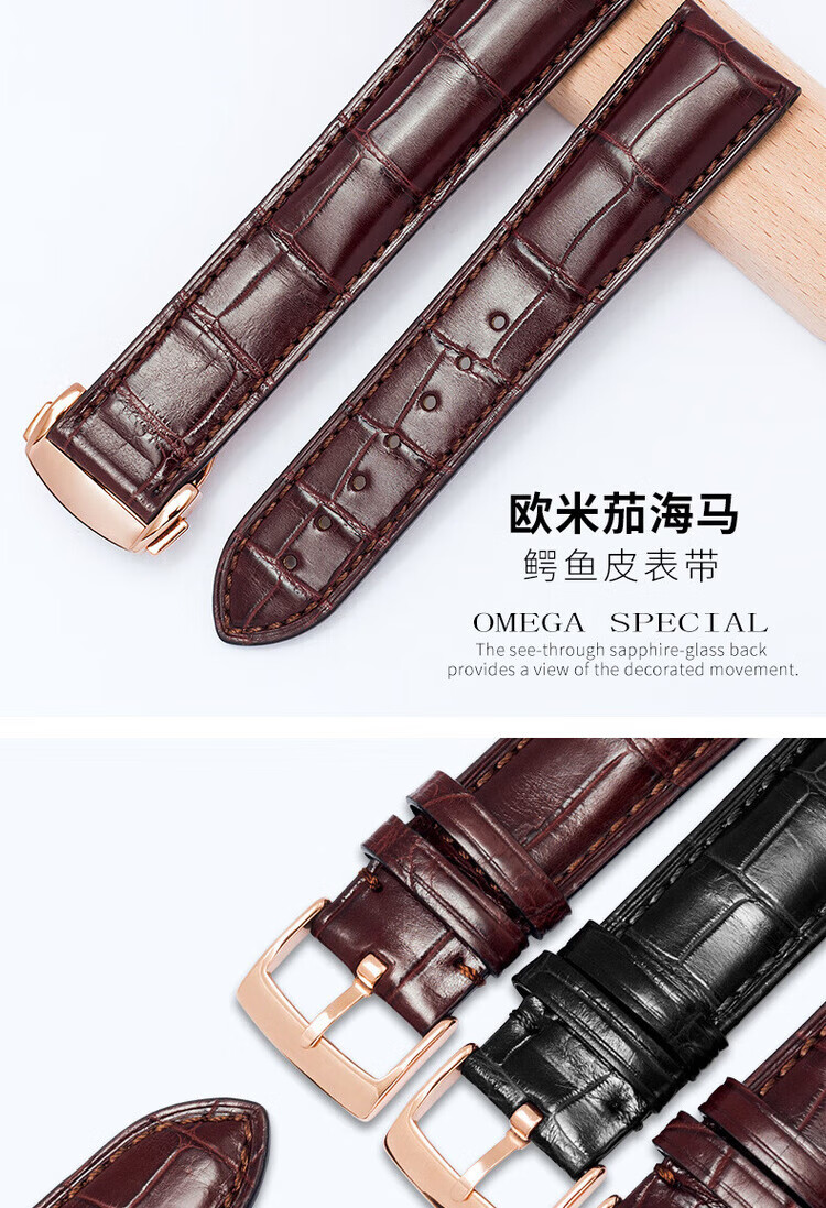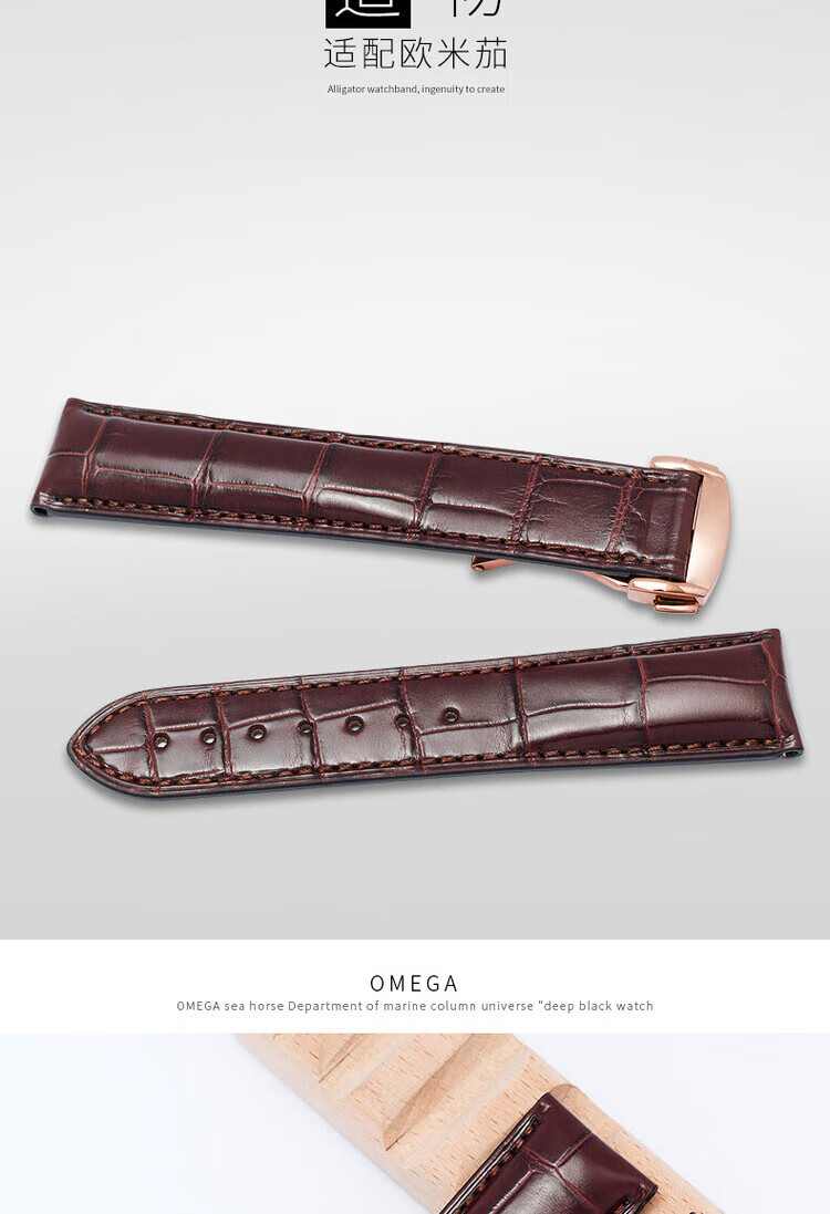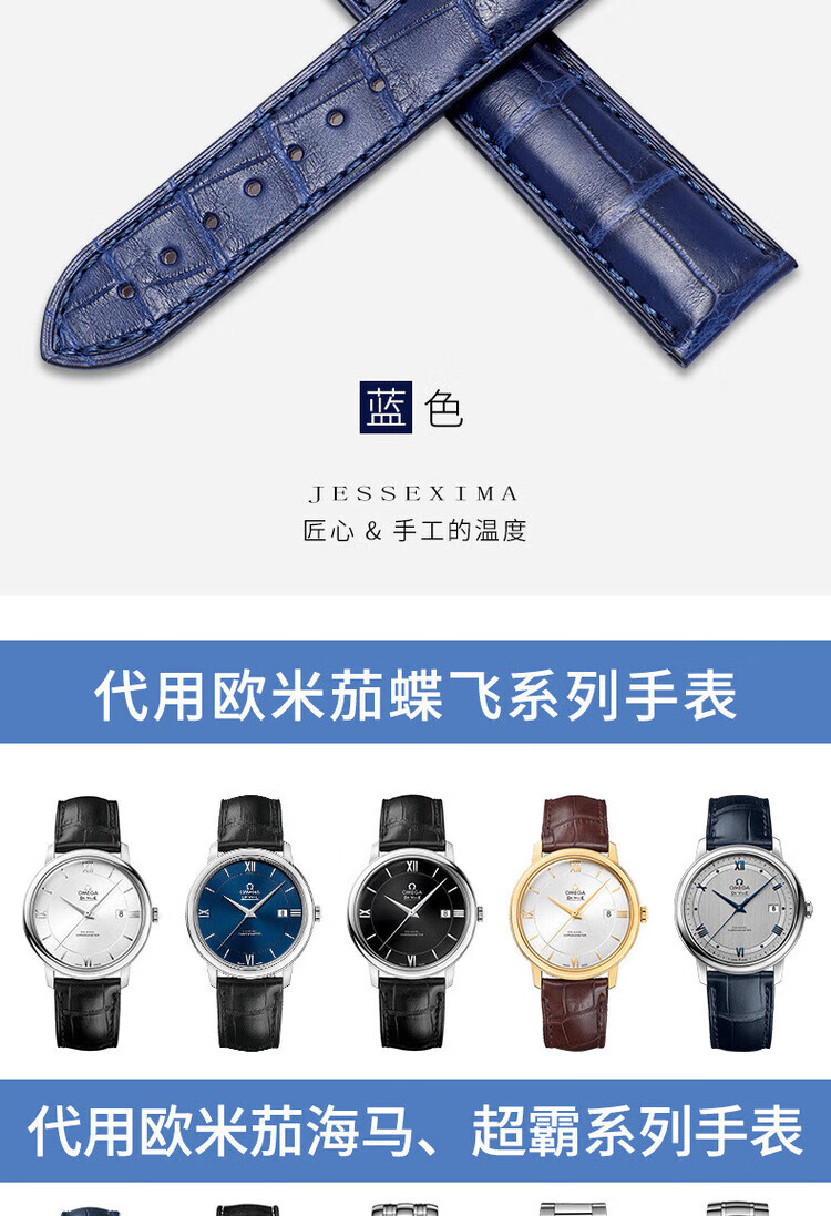 适用于OMEGA欧米茄表带男原装真皮鳄鱼皮蝶飞海马Omega手表带 蓝色-金扣【折叠款】 21mm【表盘接口】