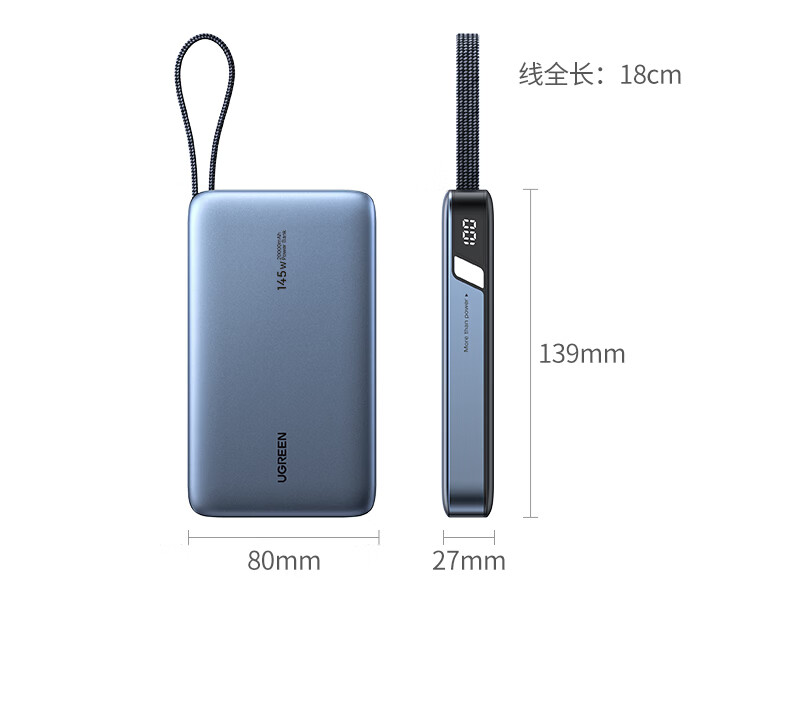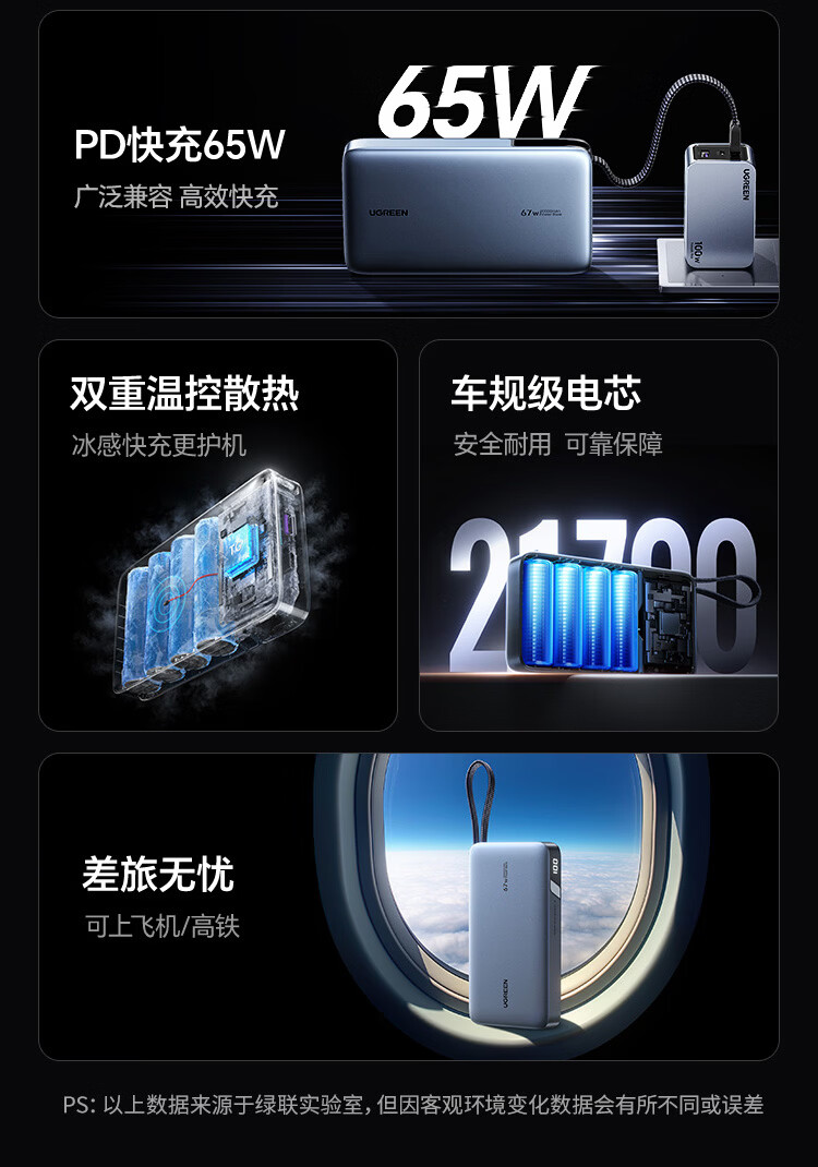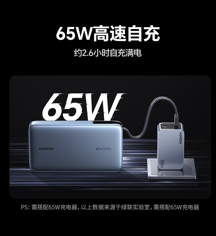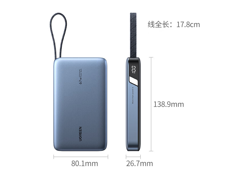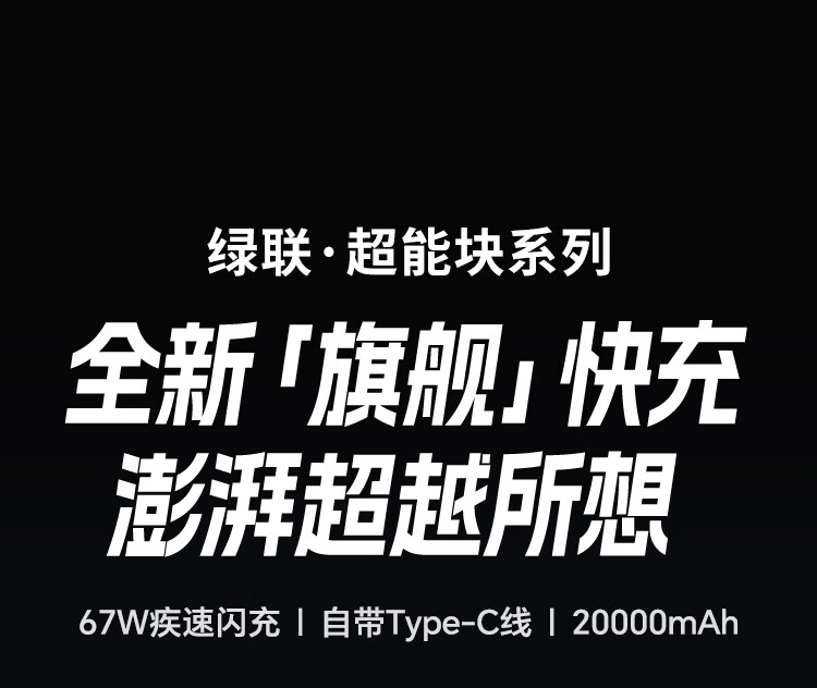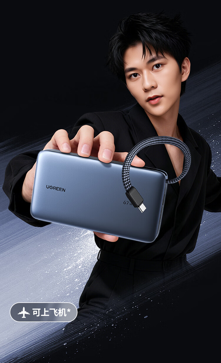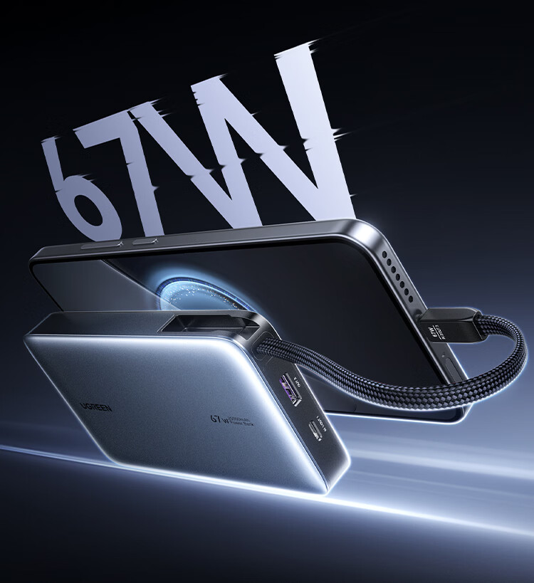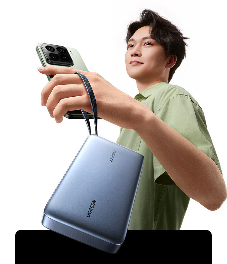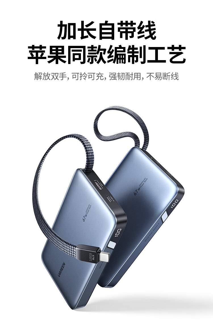 绿联【3C认证可上飞机】充电宝20000毫安67W自带线大功率快充 适用于苹果17小米华为笔记本电脑 【67W自带线】支持笔记本快充