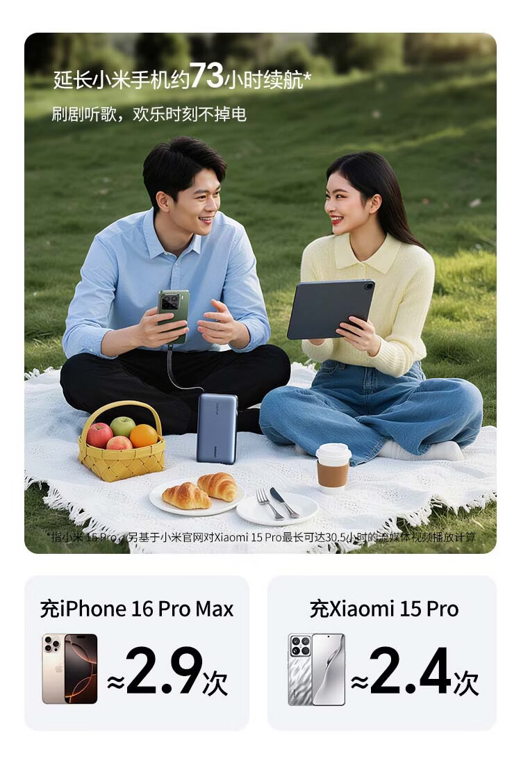 品胜【3C认证可上飞机】充电宝自带双线20000毫安大容量22.5W快充移动电源适用苹果17promax小米华为白