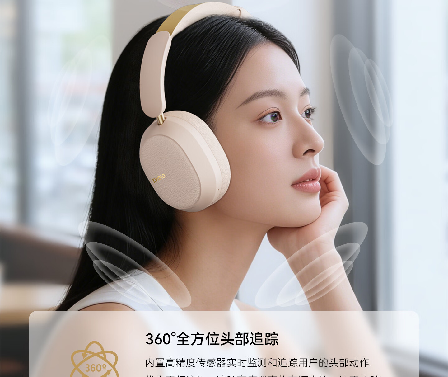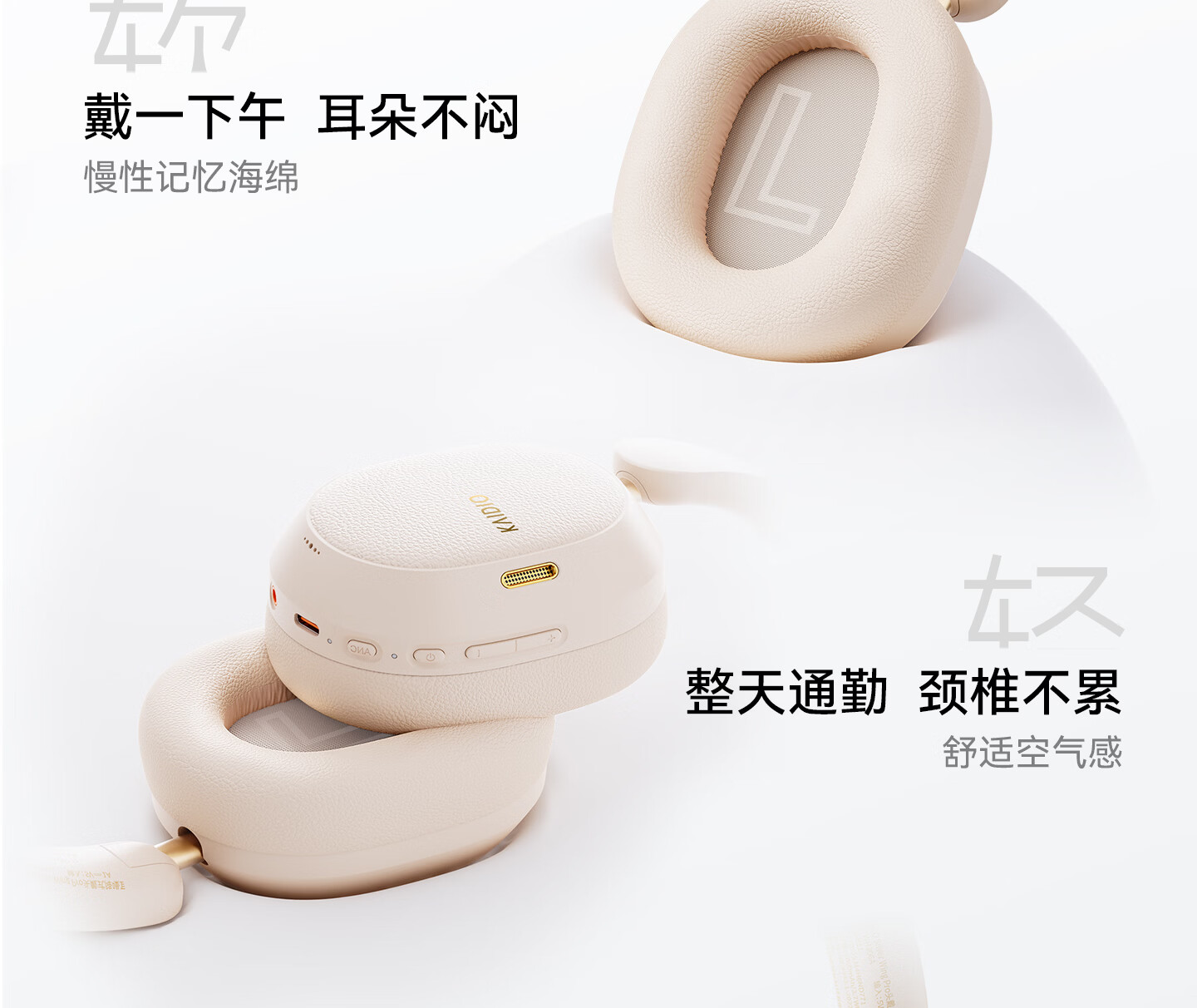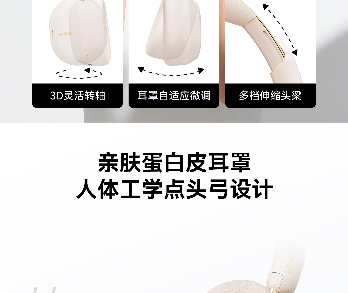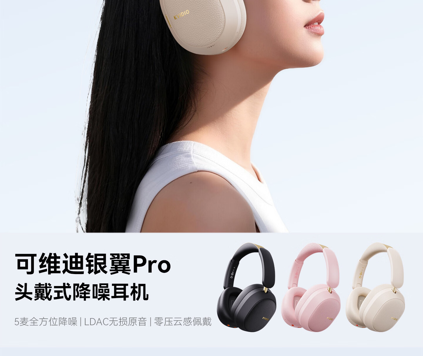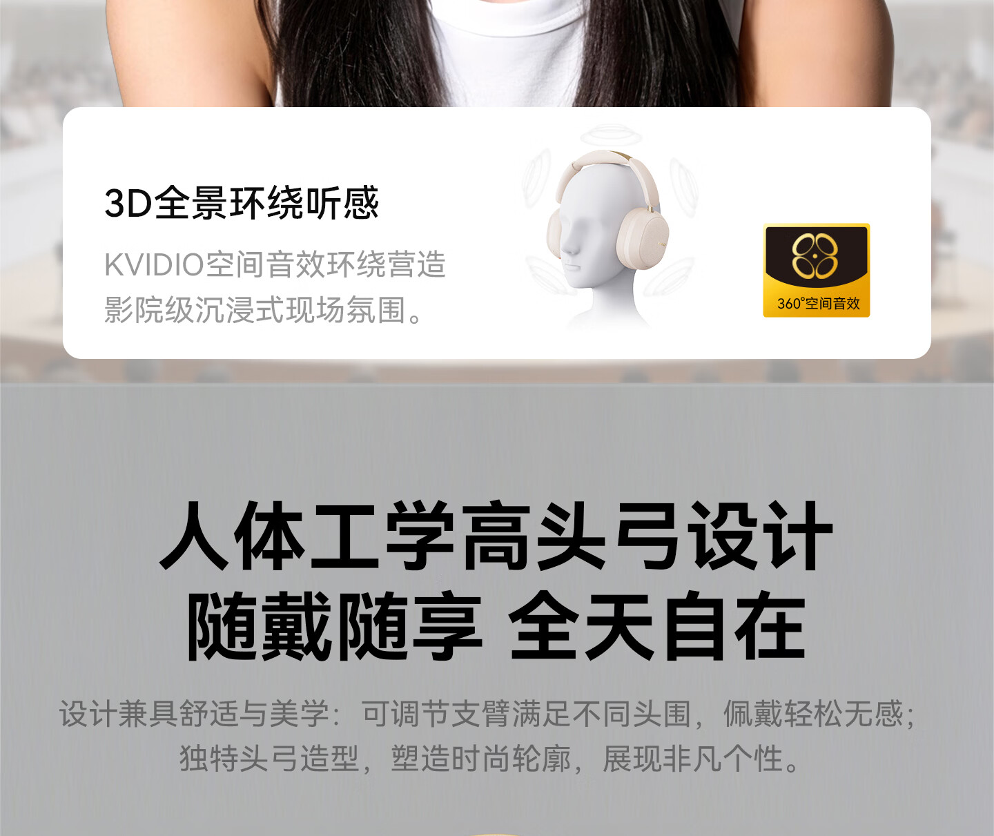 KVIDIO可维迪306A银翼PRO【头部追踪】蓝牙耳机头戴式主动降噪无线耳机长续航电脑音乐耳麦睡觉隔音神器 云岩白【48dB降噪|头部追踪|APP操控|蓝牙6.0】