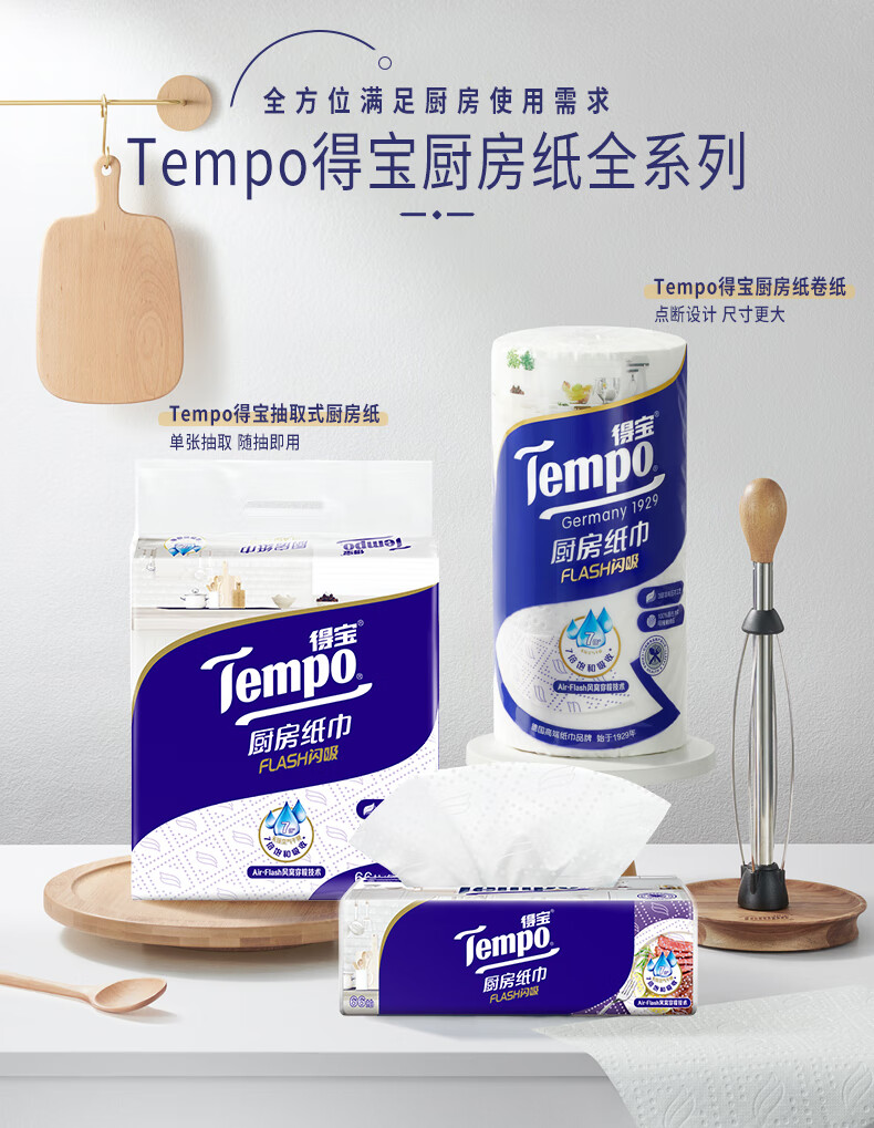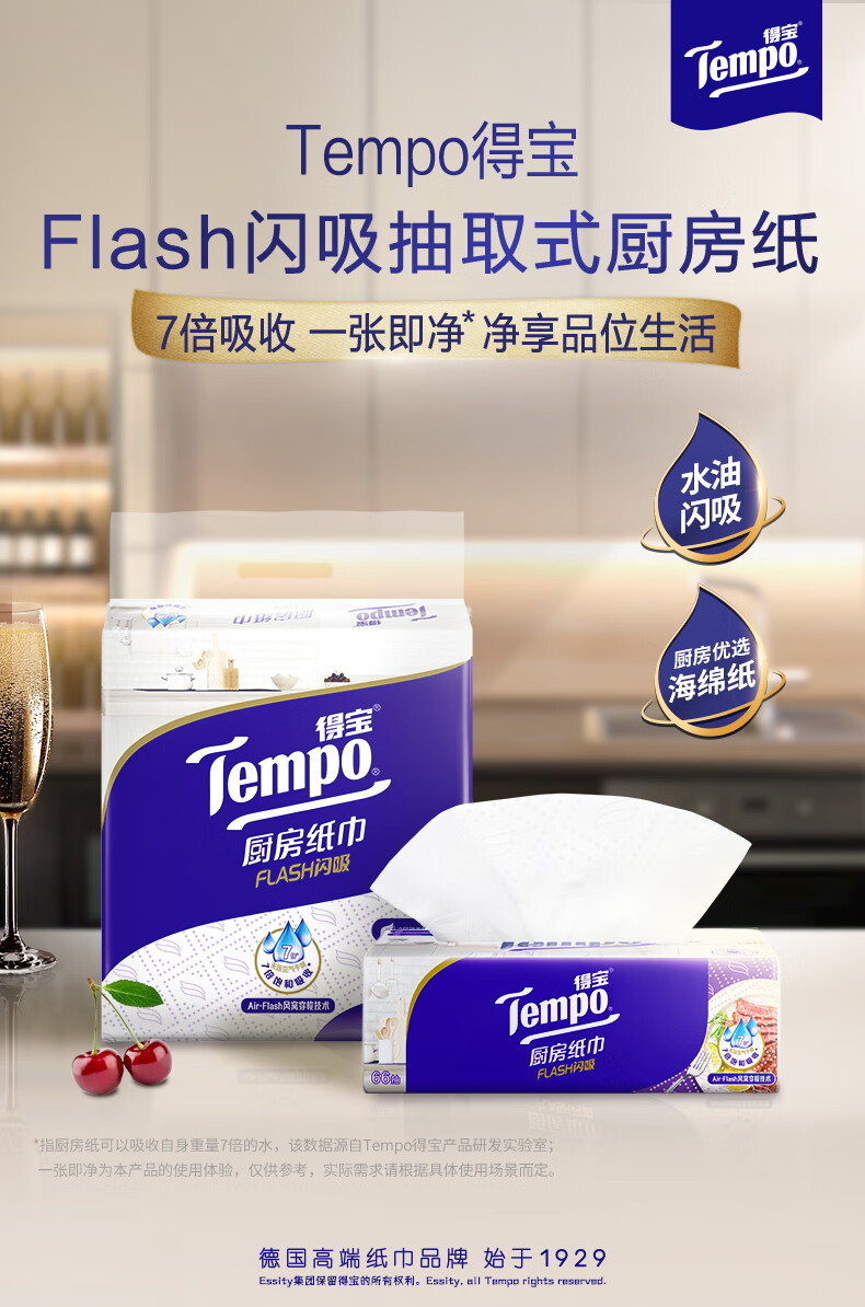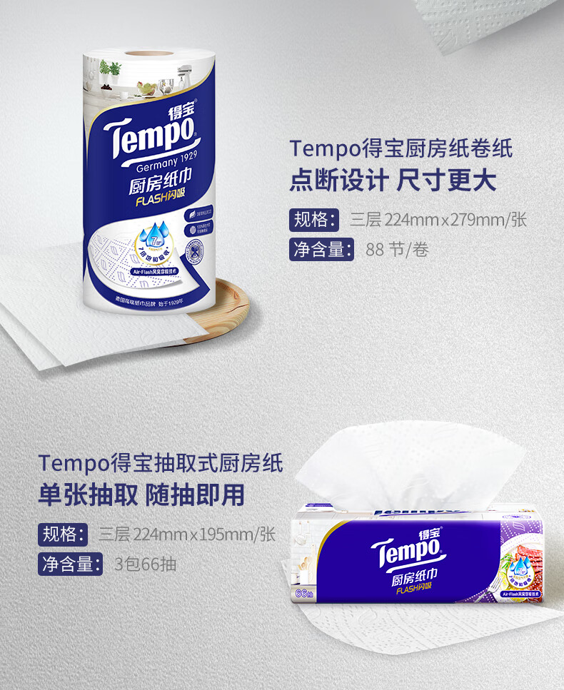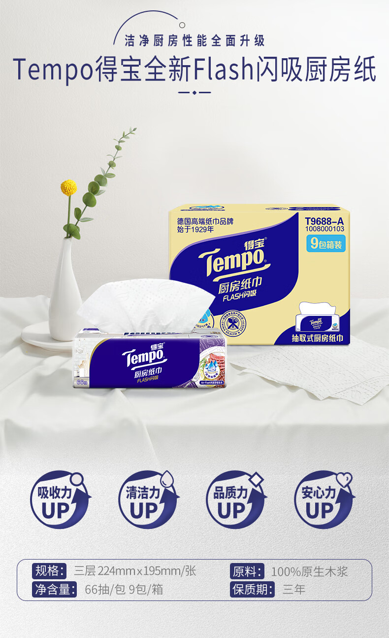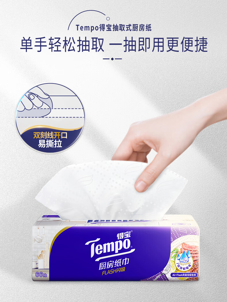 得宝(TEMPO)一博同款 厨房抽纸 66抽*9包 水油瞬吸 厨房用纸 吸油纸 懒人抹布