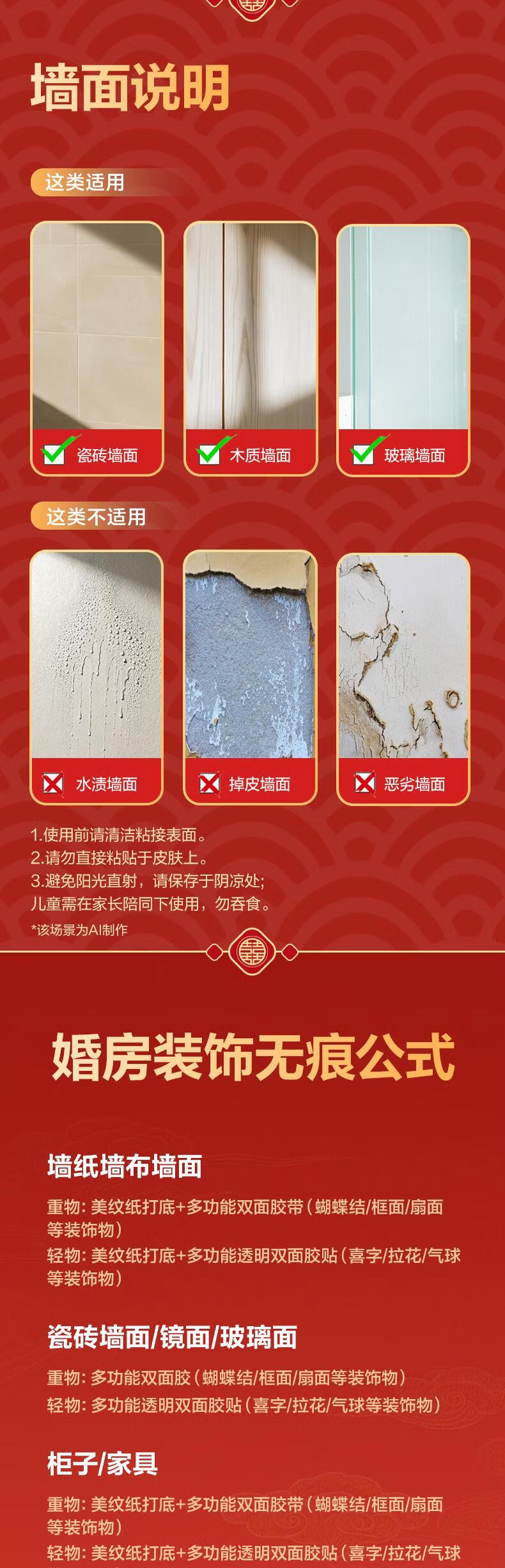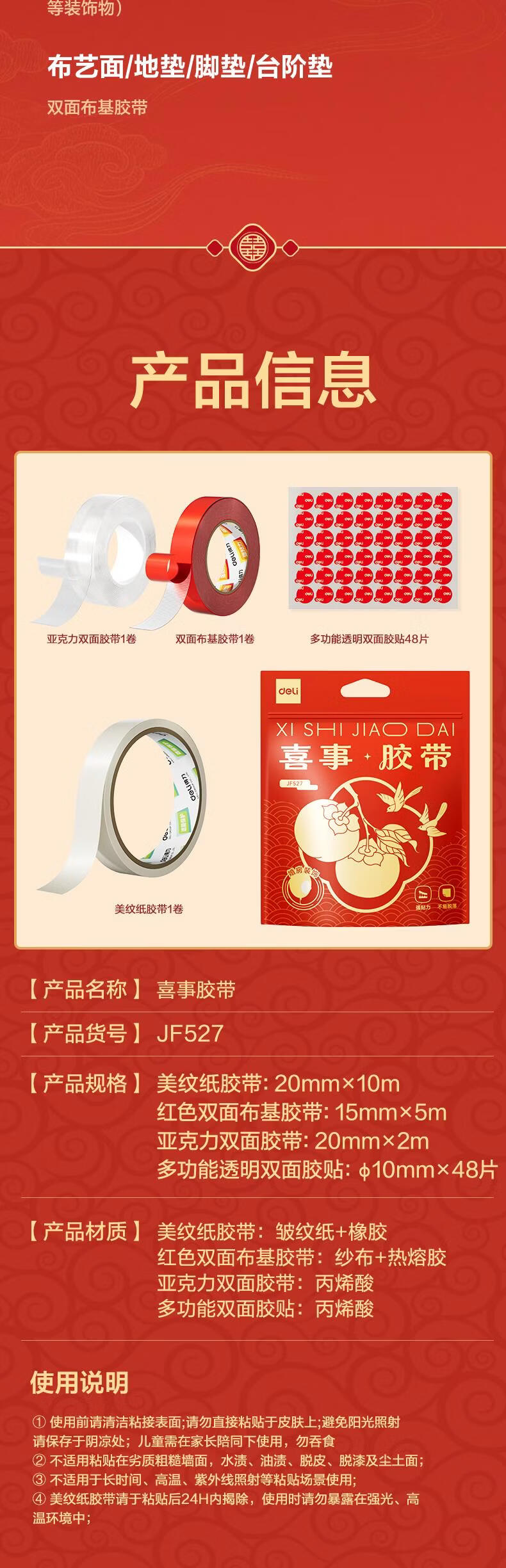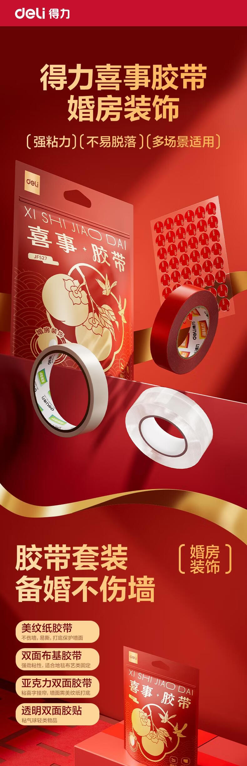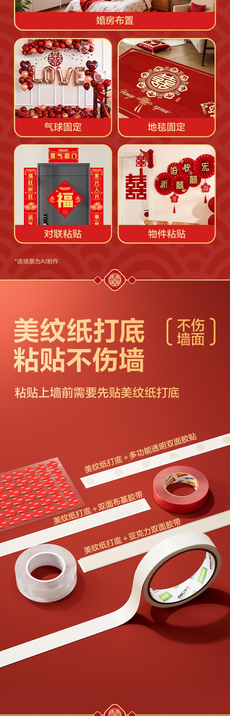 得力(deli)春联婚房装饰粘贴布置无痕胶无痕双面胶美纹纸加纳米胶多功能点点胶不伤墙易撕 四件套 JF527