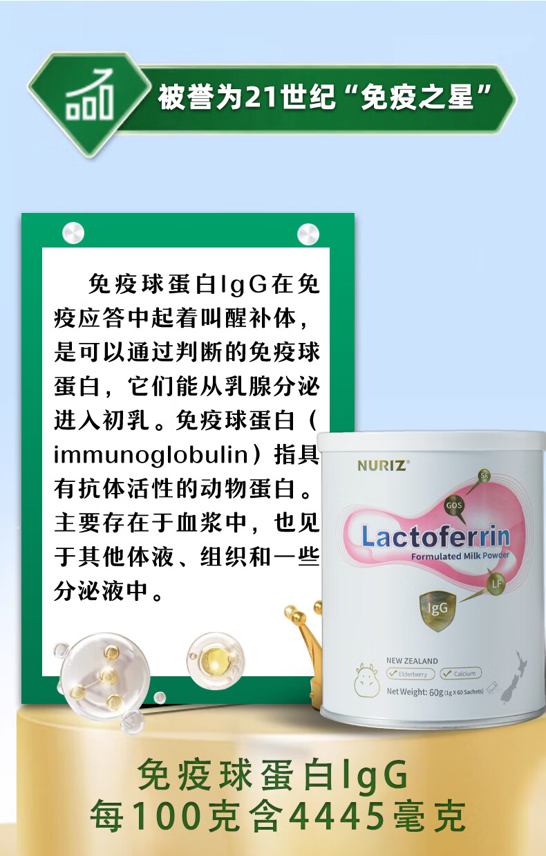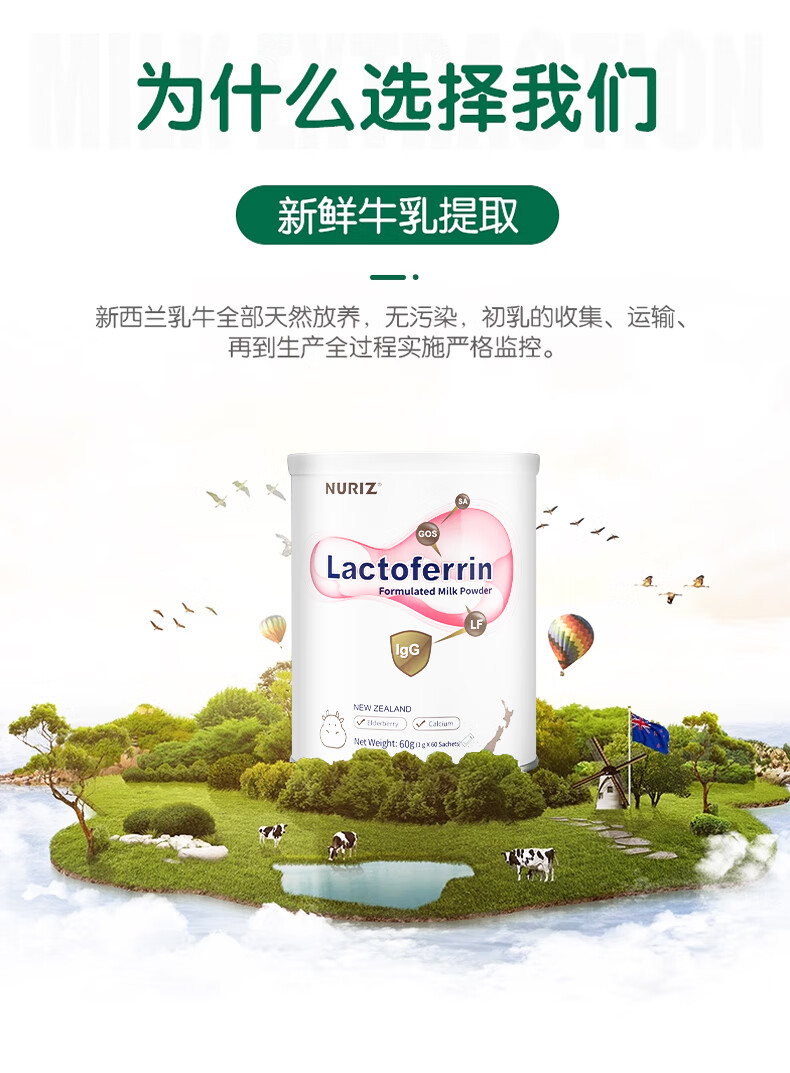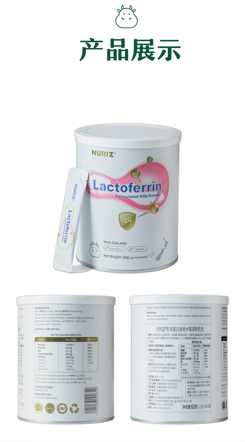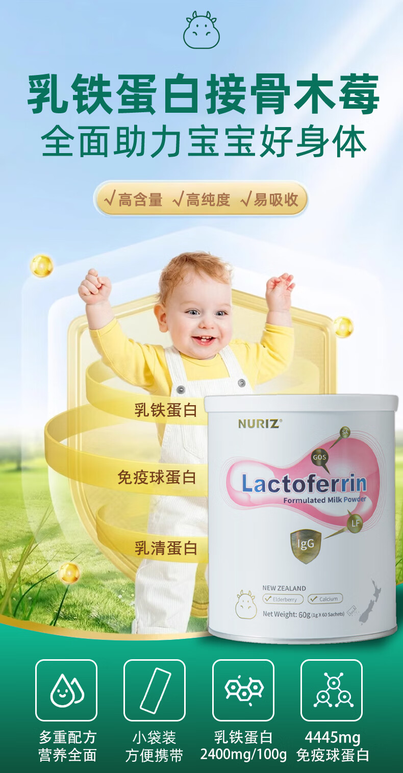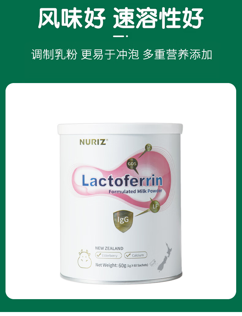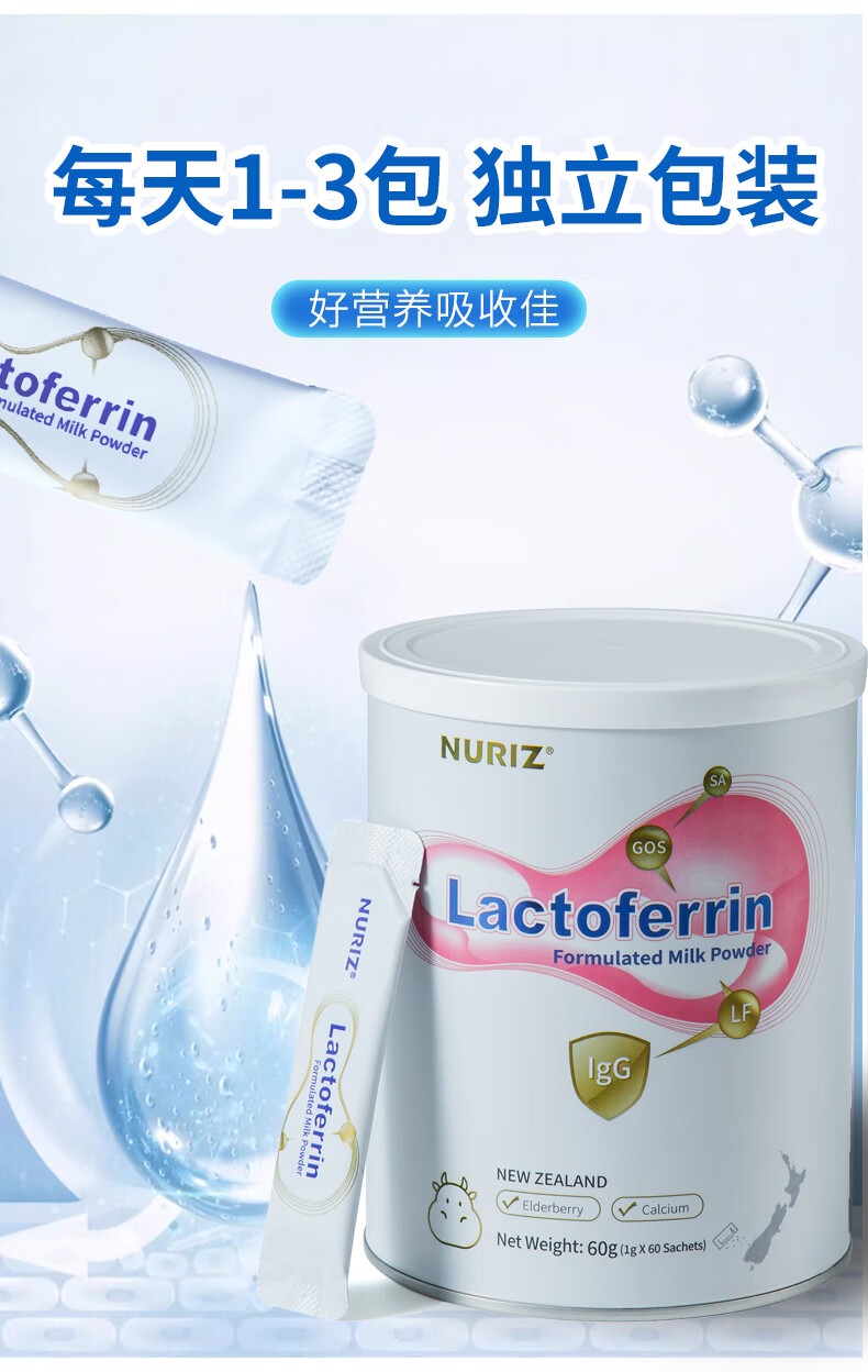 纽利兹nuriz新西兰原装进口乳铁蛋白乳清免疫球蛋白幼儿小宝宝接骨木莓 单盒60g罐装