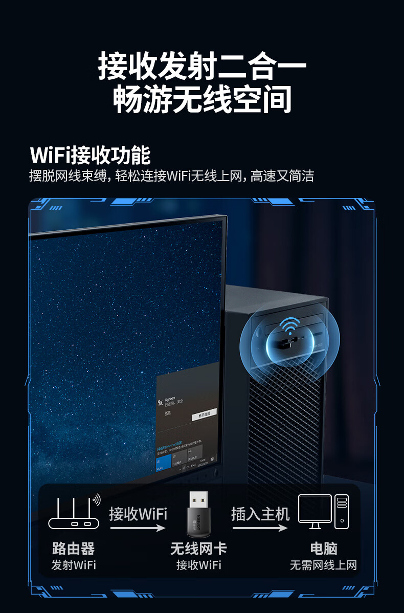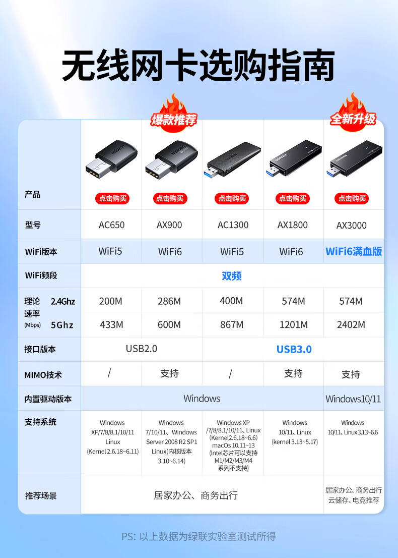 绿联USB无线网卡WiFi6免驱AX900 双频5G台式机专用WiFi接收器 内置天线 电脑笔记本网卡无线接收发射器