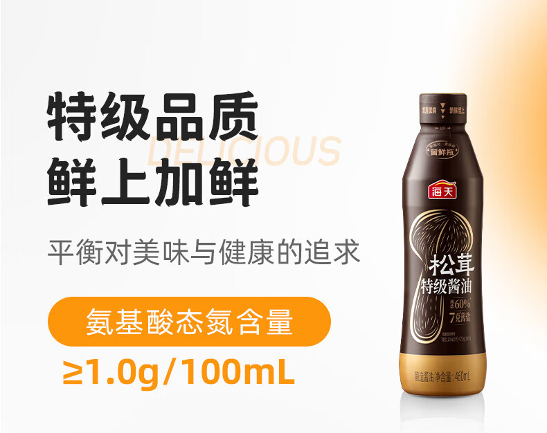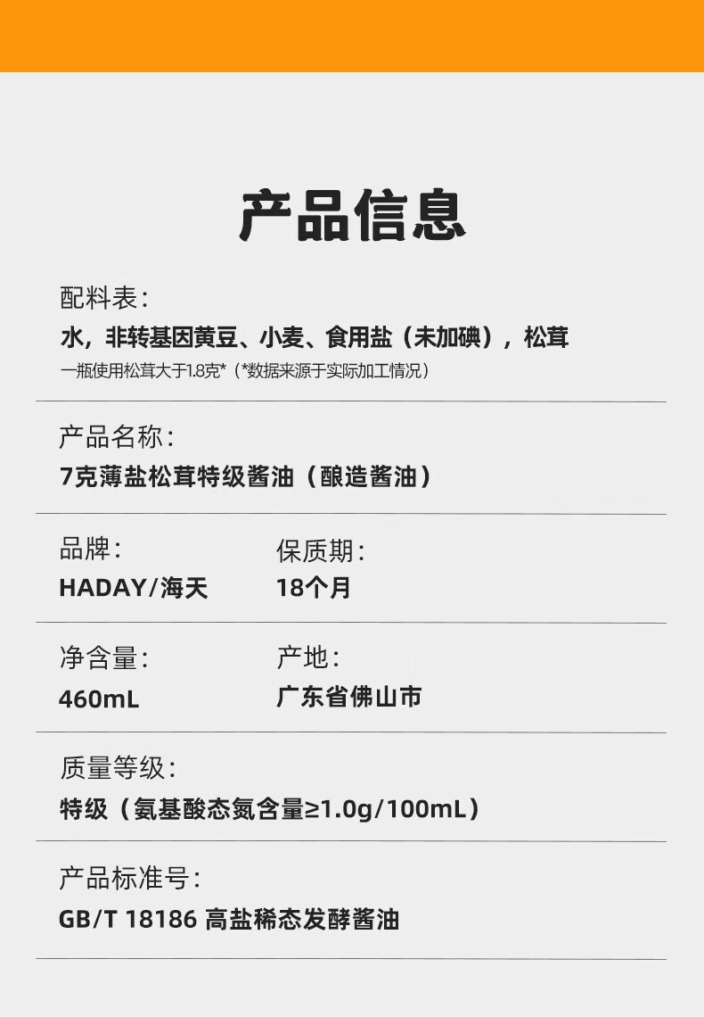 海天 7g薄盐松茸酱油460ml【0添加薄盐特级酱油】高端系列 挤挤瓶
