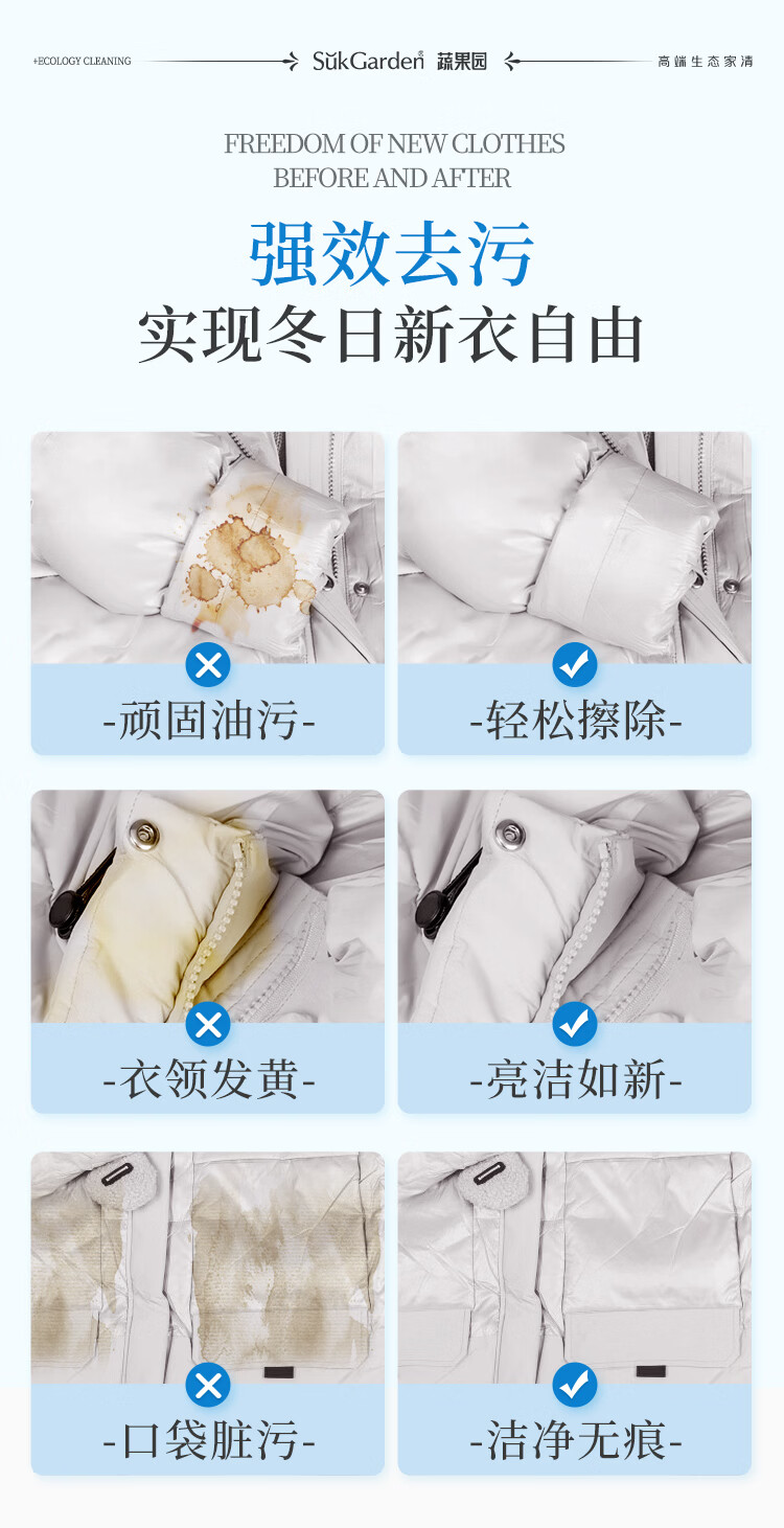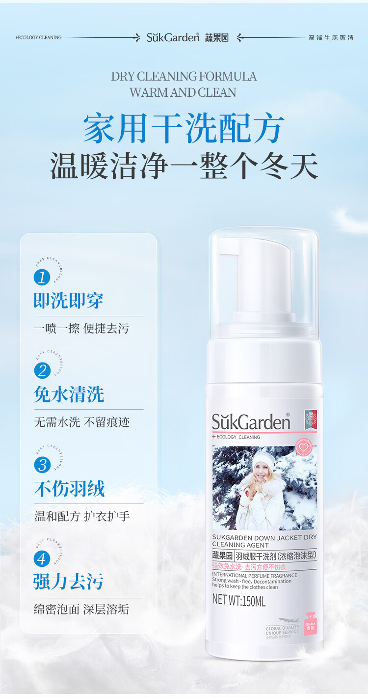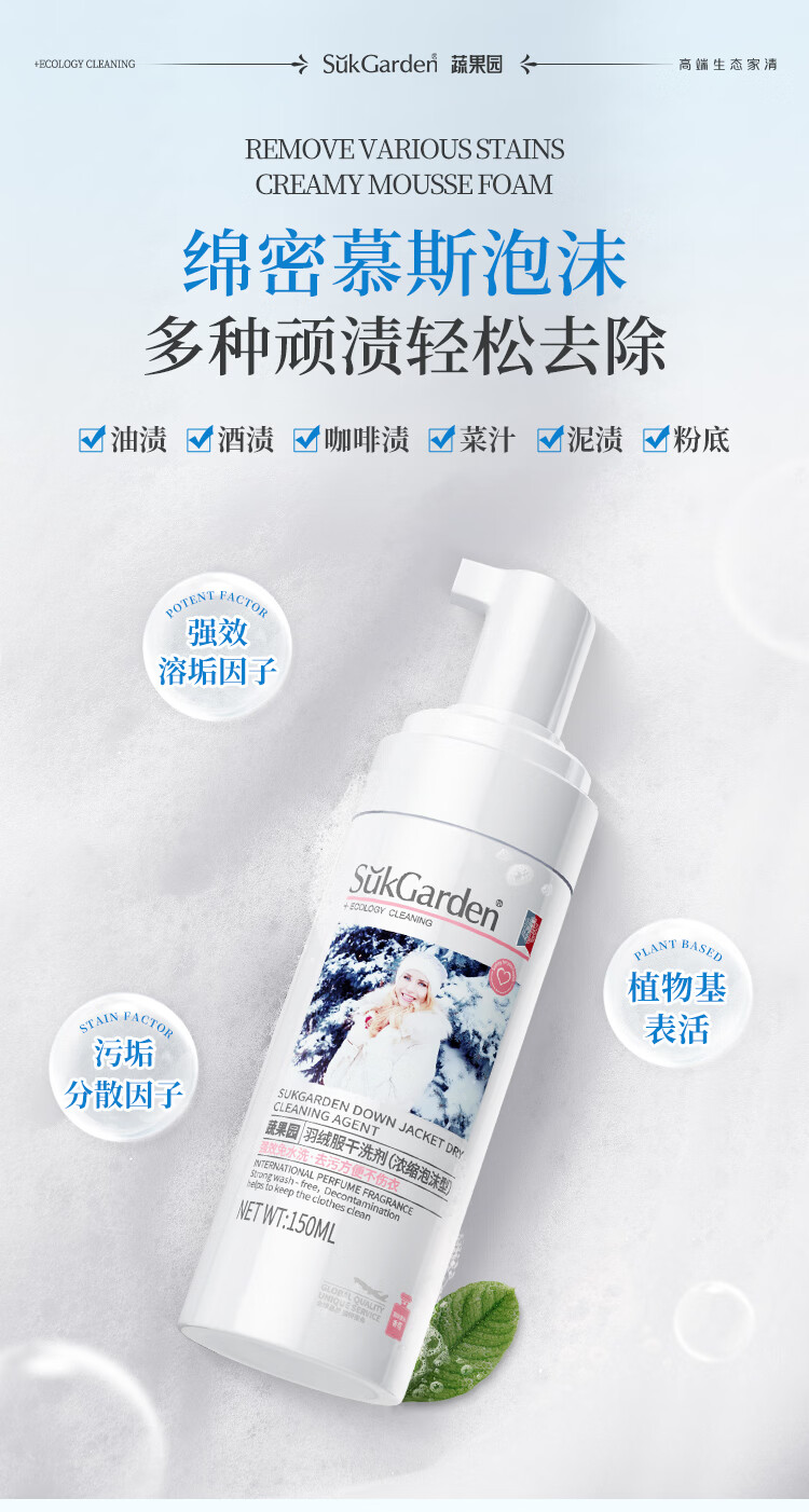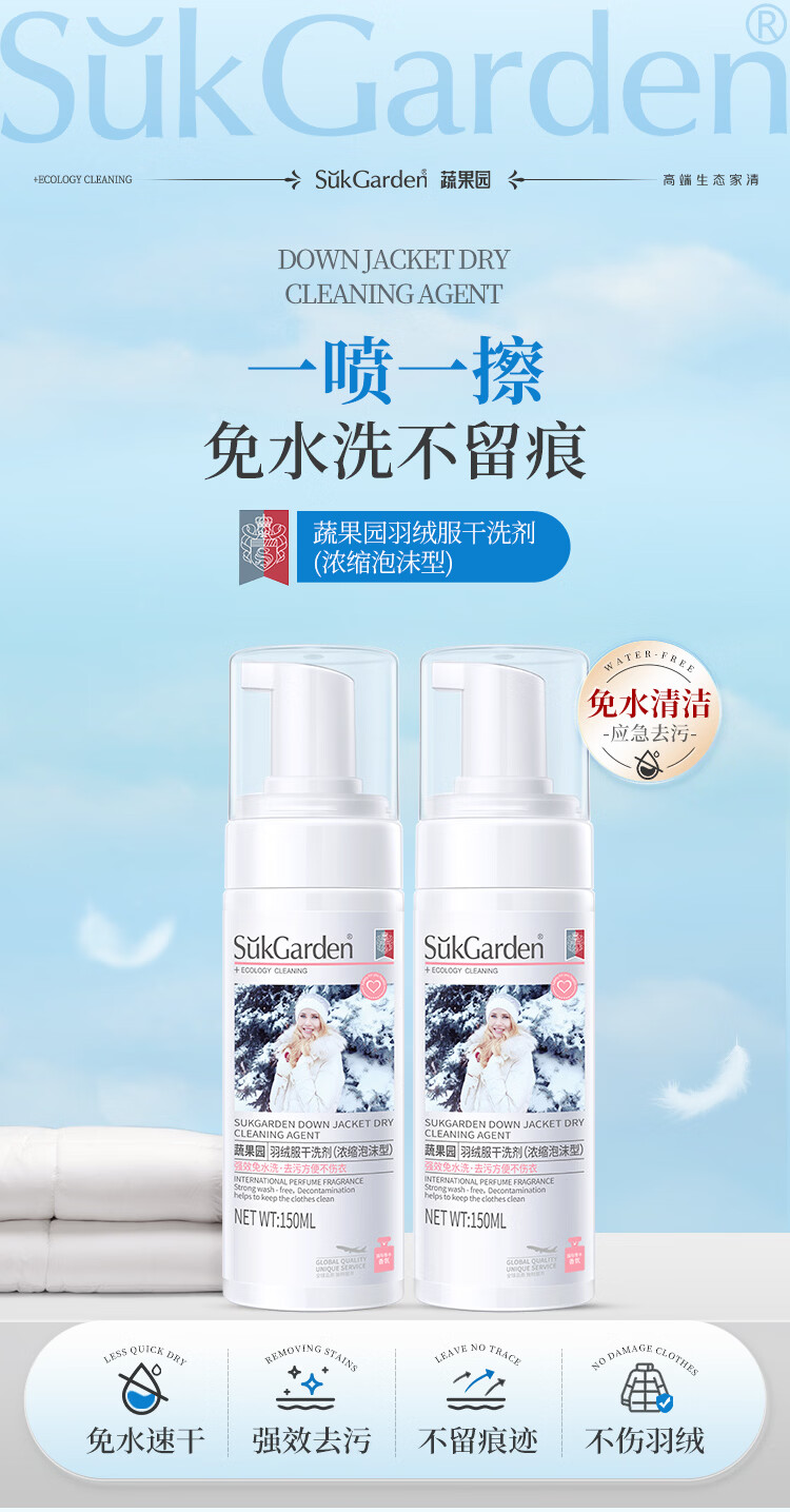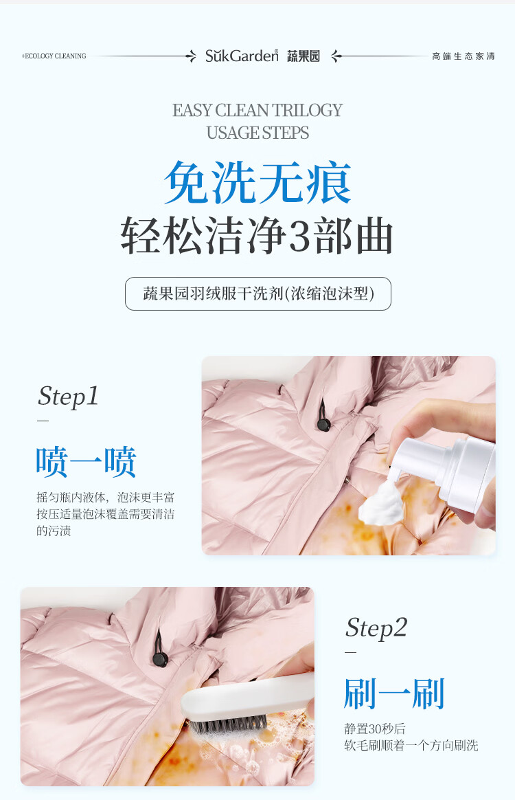 蔬果园羽绒服清洗剂 泡沫型免水洗去油渍污渍羽绒服专用洗衣液清洁剂 羽绒服干洗剂150ml*2