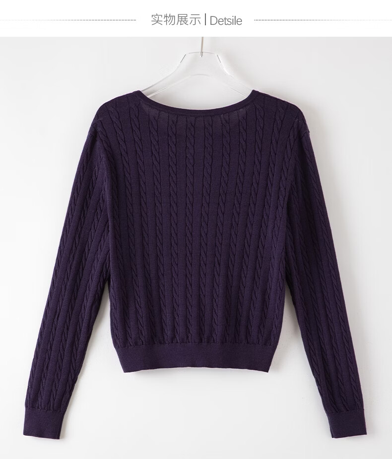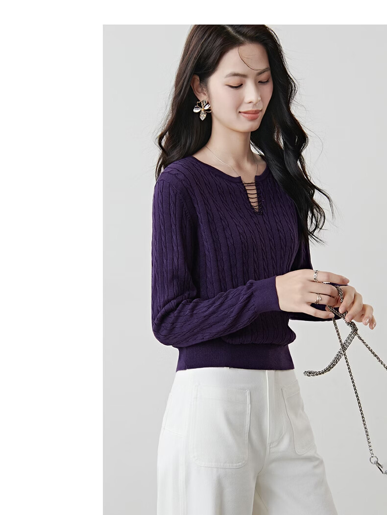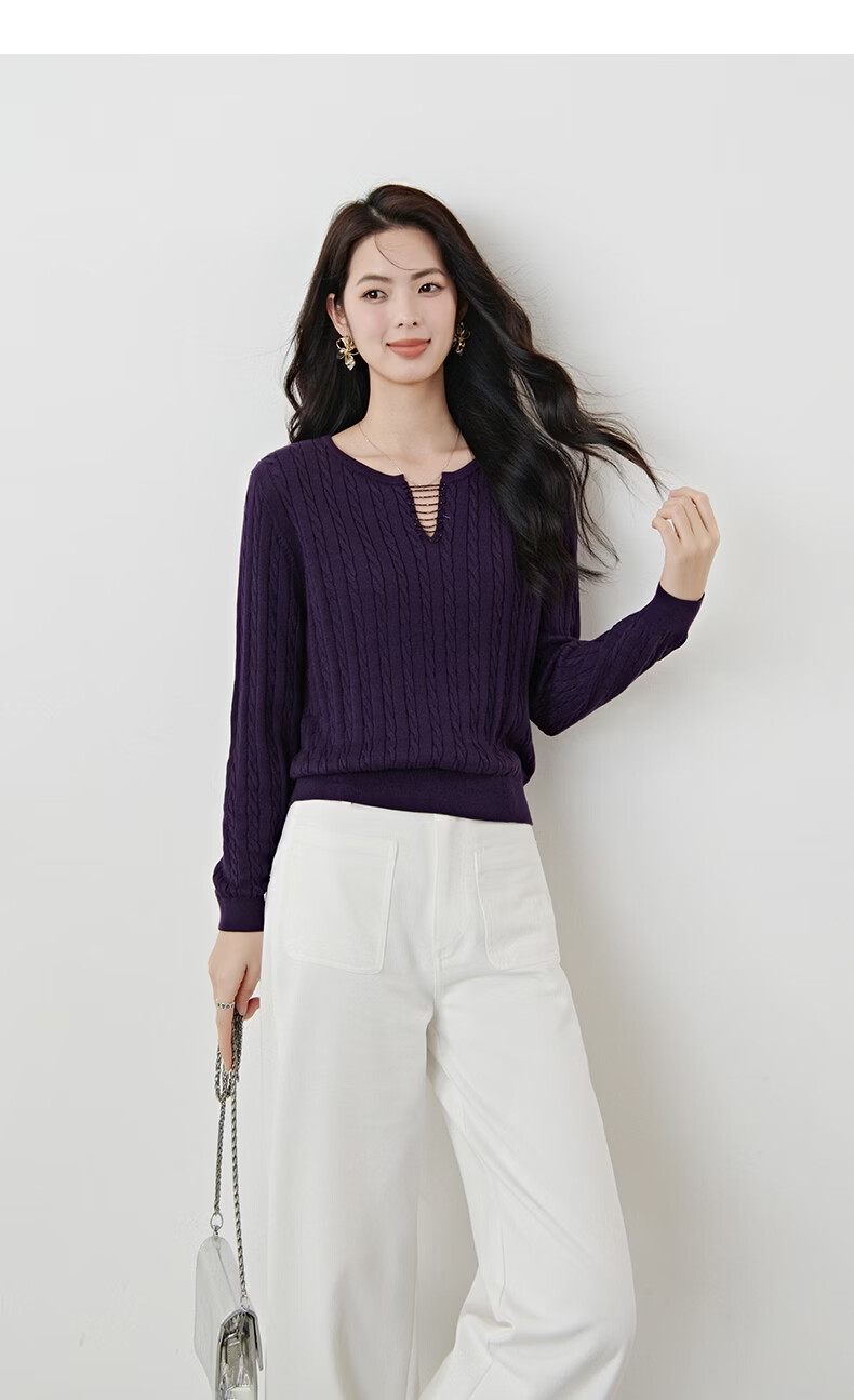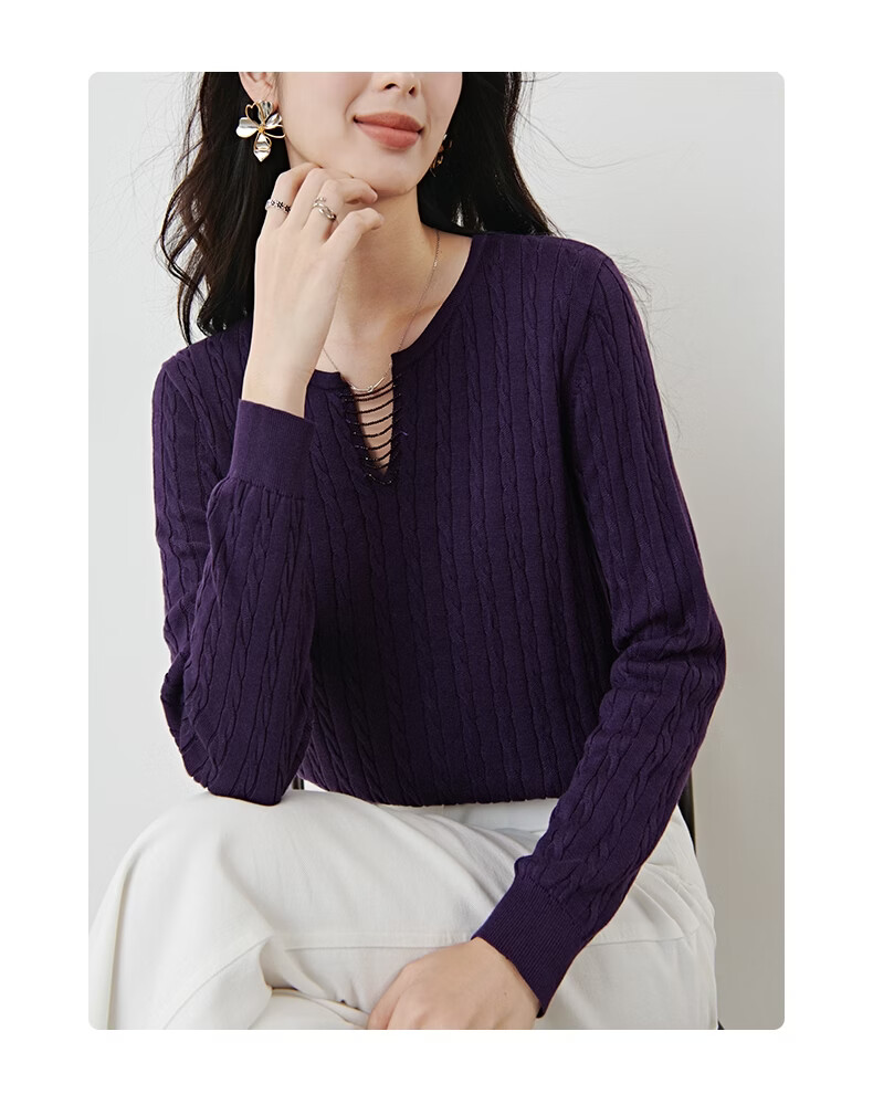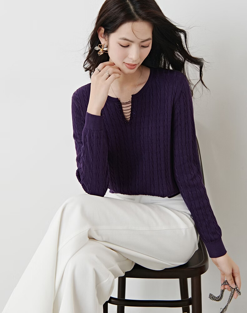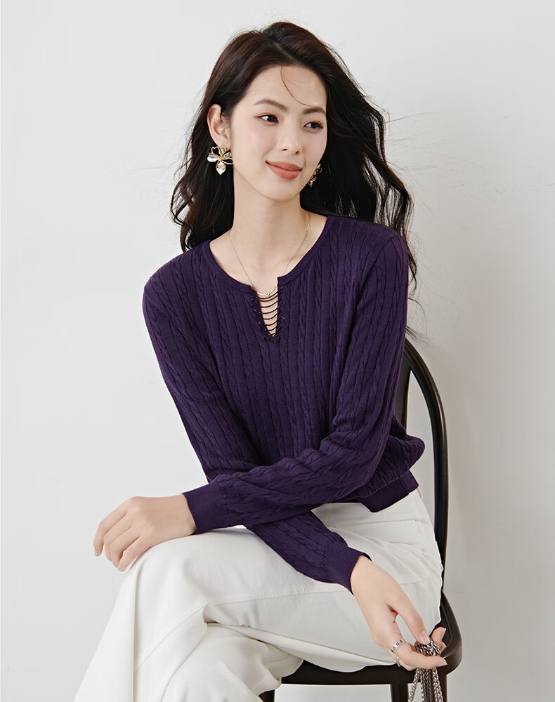 晚白2026年春款串珠小V领莱赛尔天丝棉亲肤宽松绞花针织衫女 紫色 L