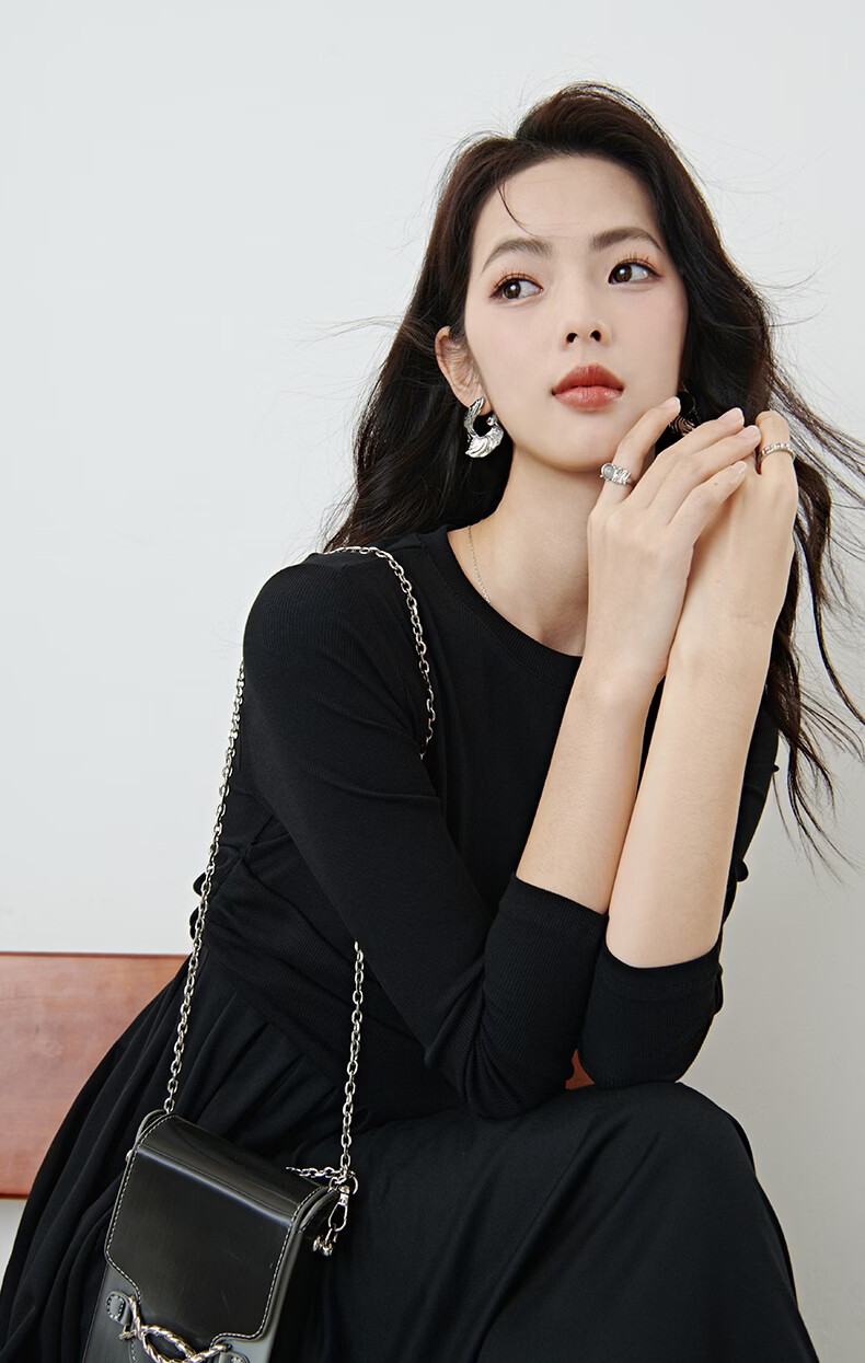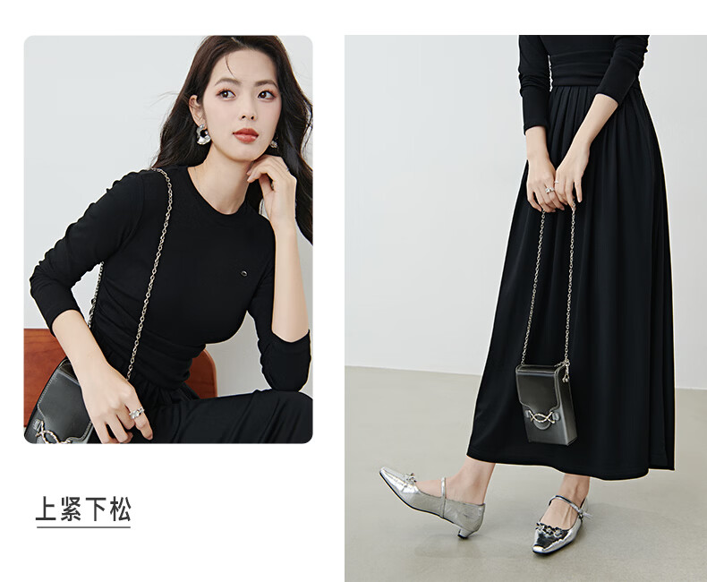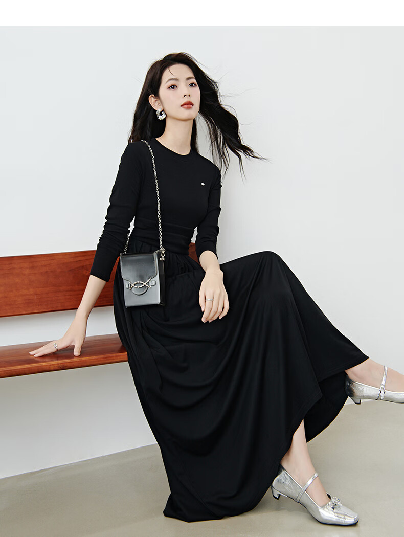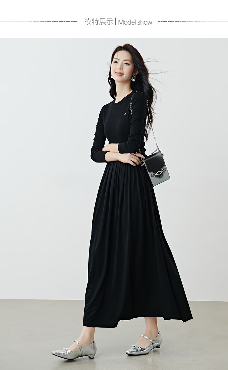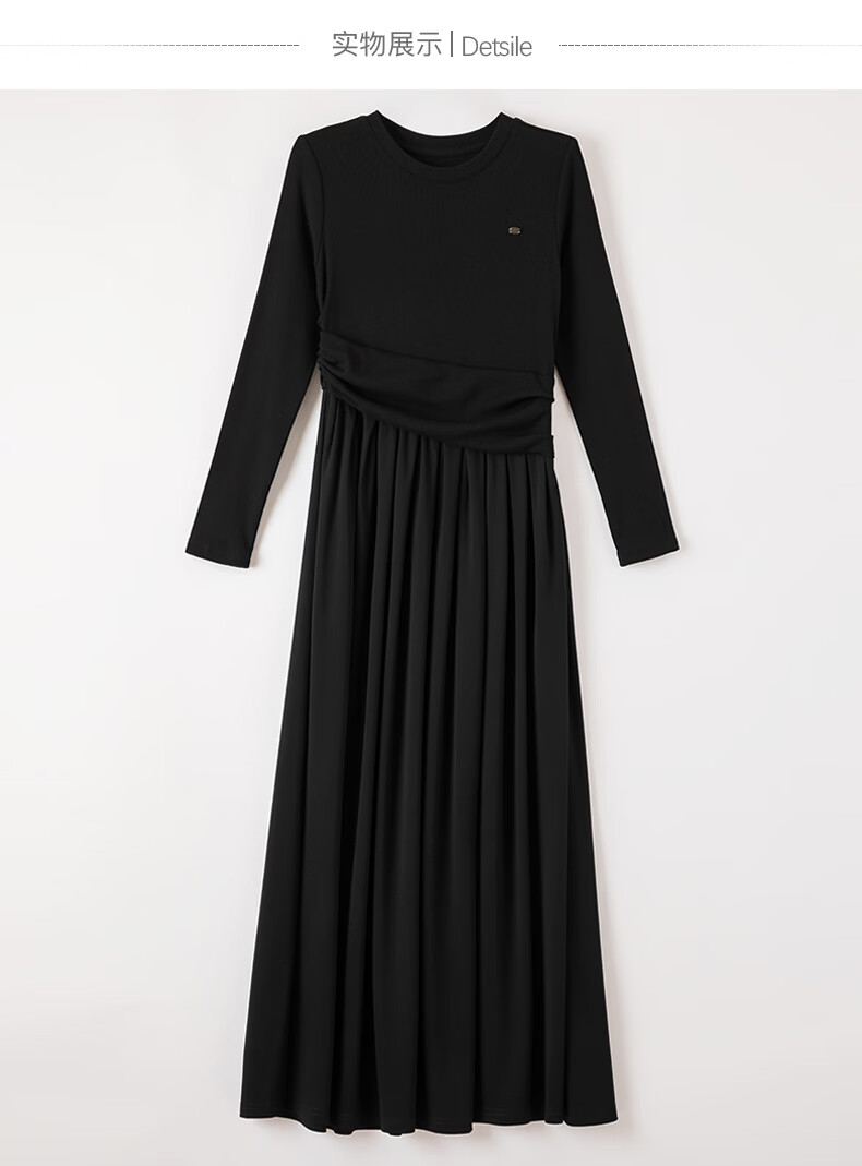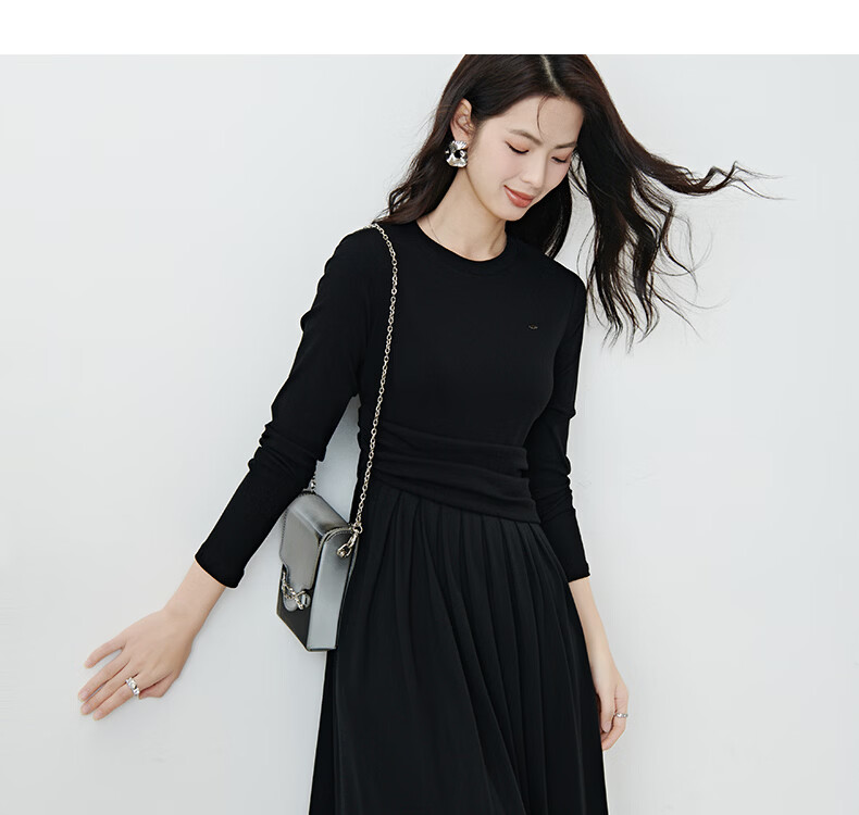 晚白【加长版】2026春气质假两件赫本风小黑裙高温压褶收腰显瘦连衣裙 黑色 S 建议158cm以上拍