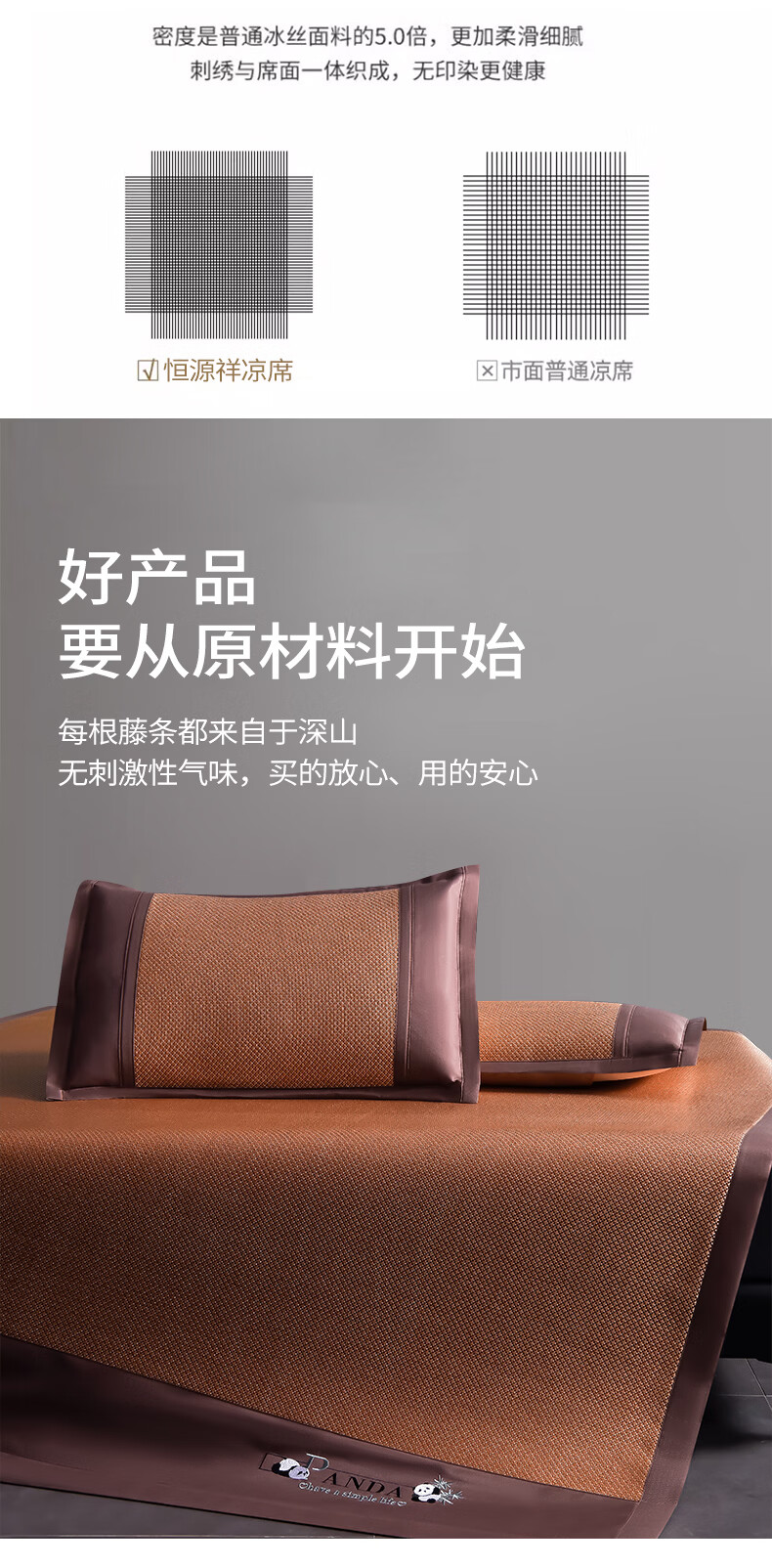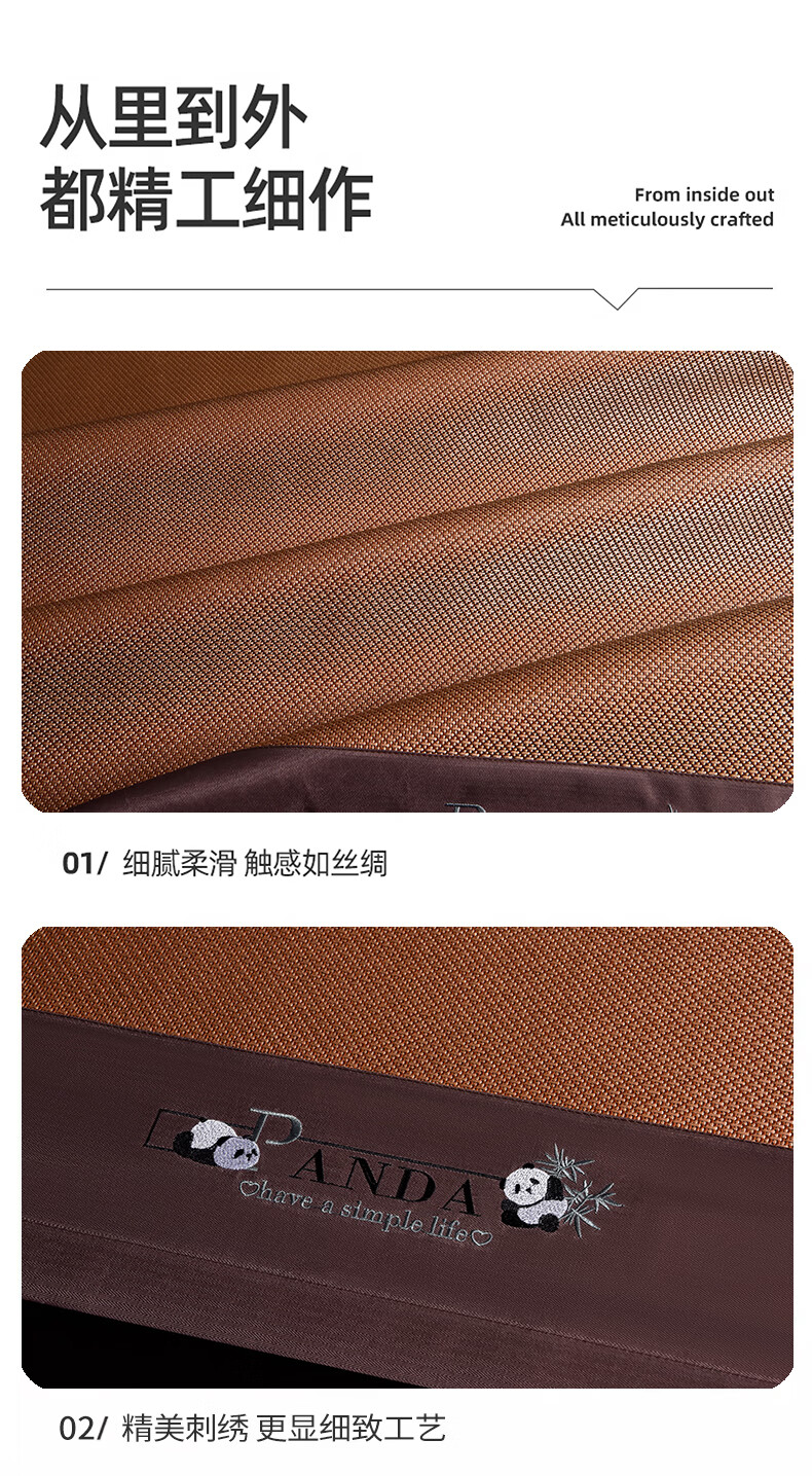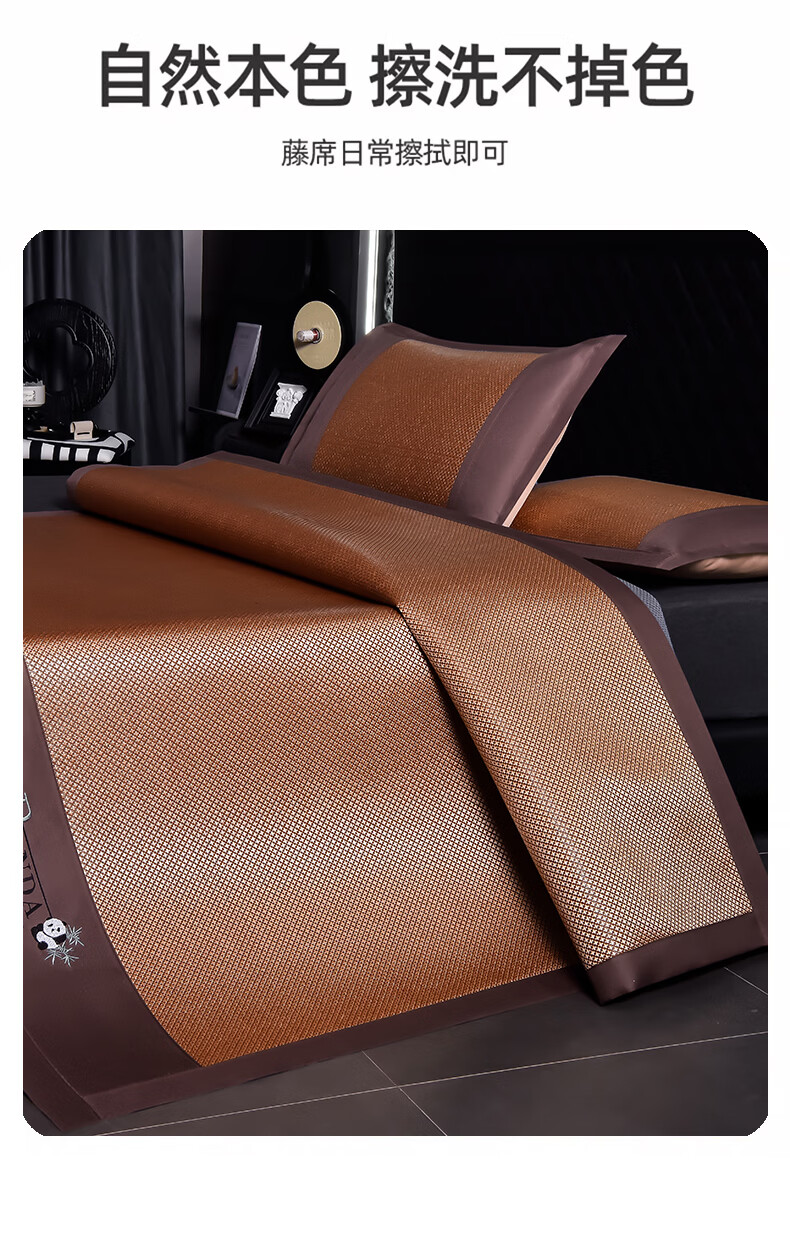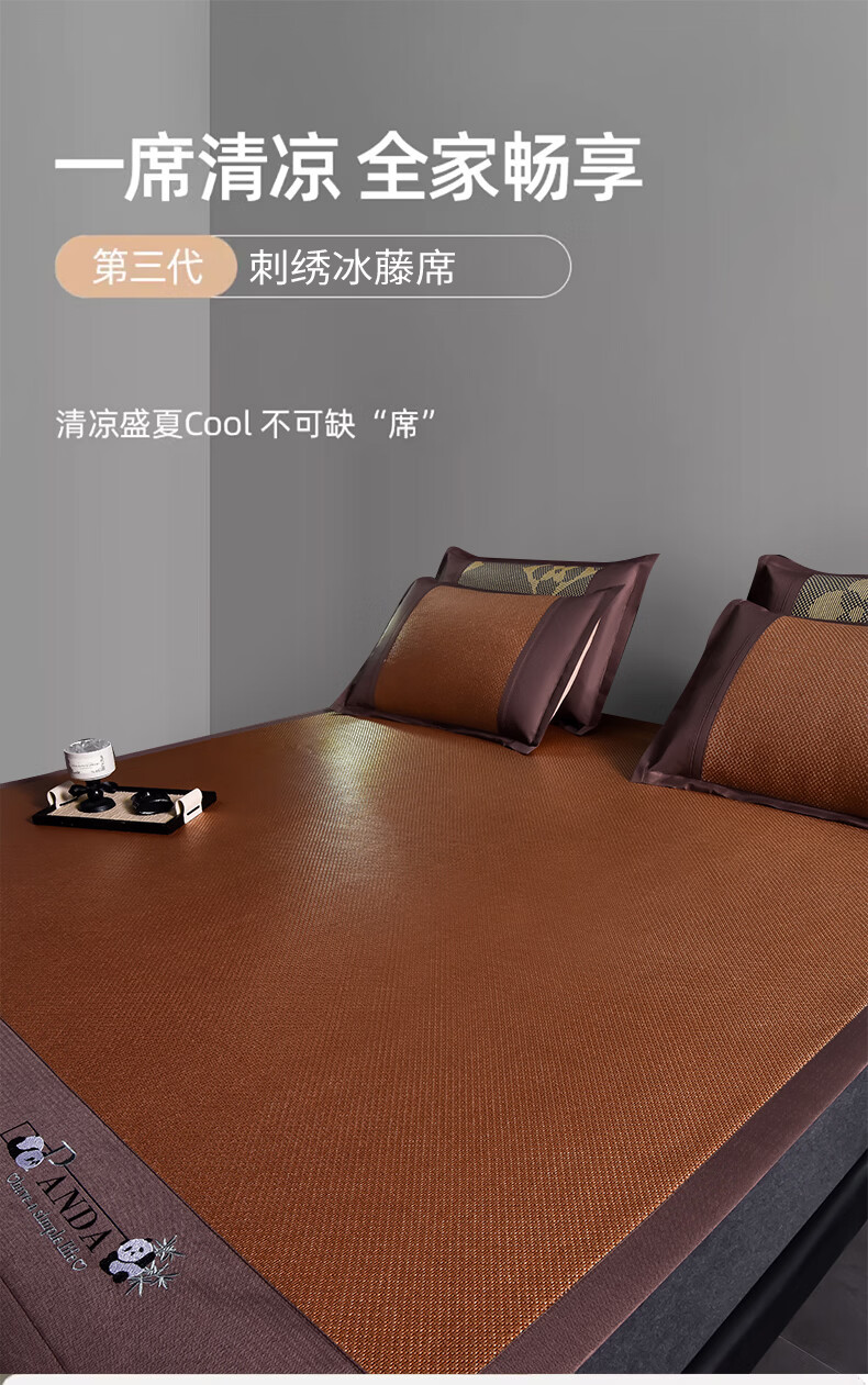 恒源祥刺绣冰藤席 夏季冰丝空调凉席10倍加密无毛刺不黏腻清爽透气藤席 熊猫灰色【10倍加密无毛刺】 90*190cm【单席】