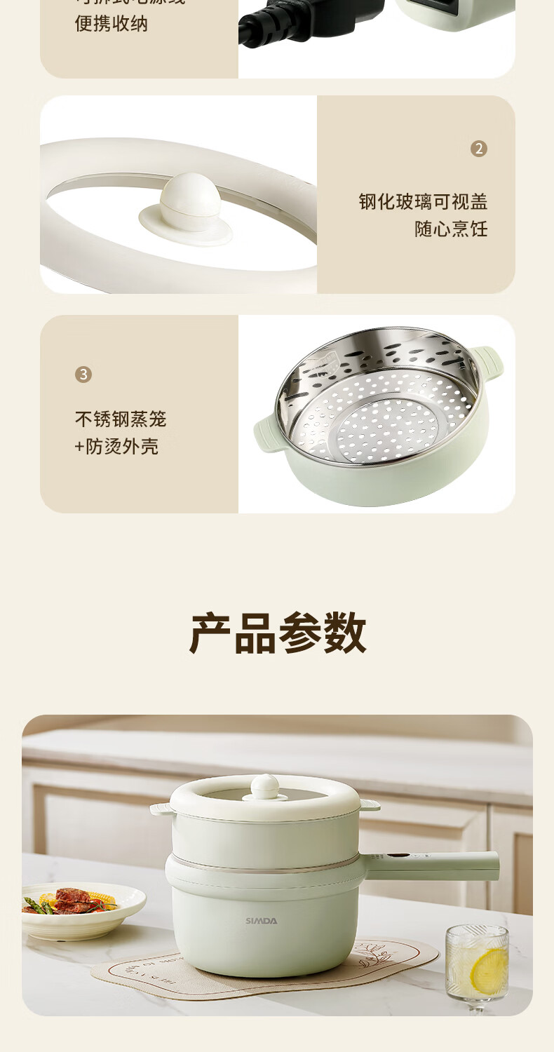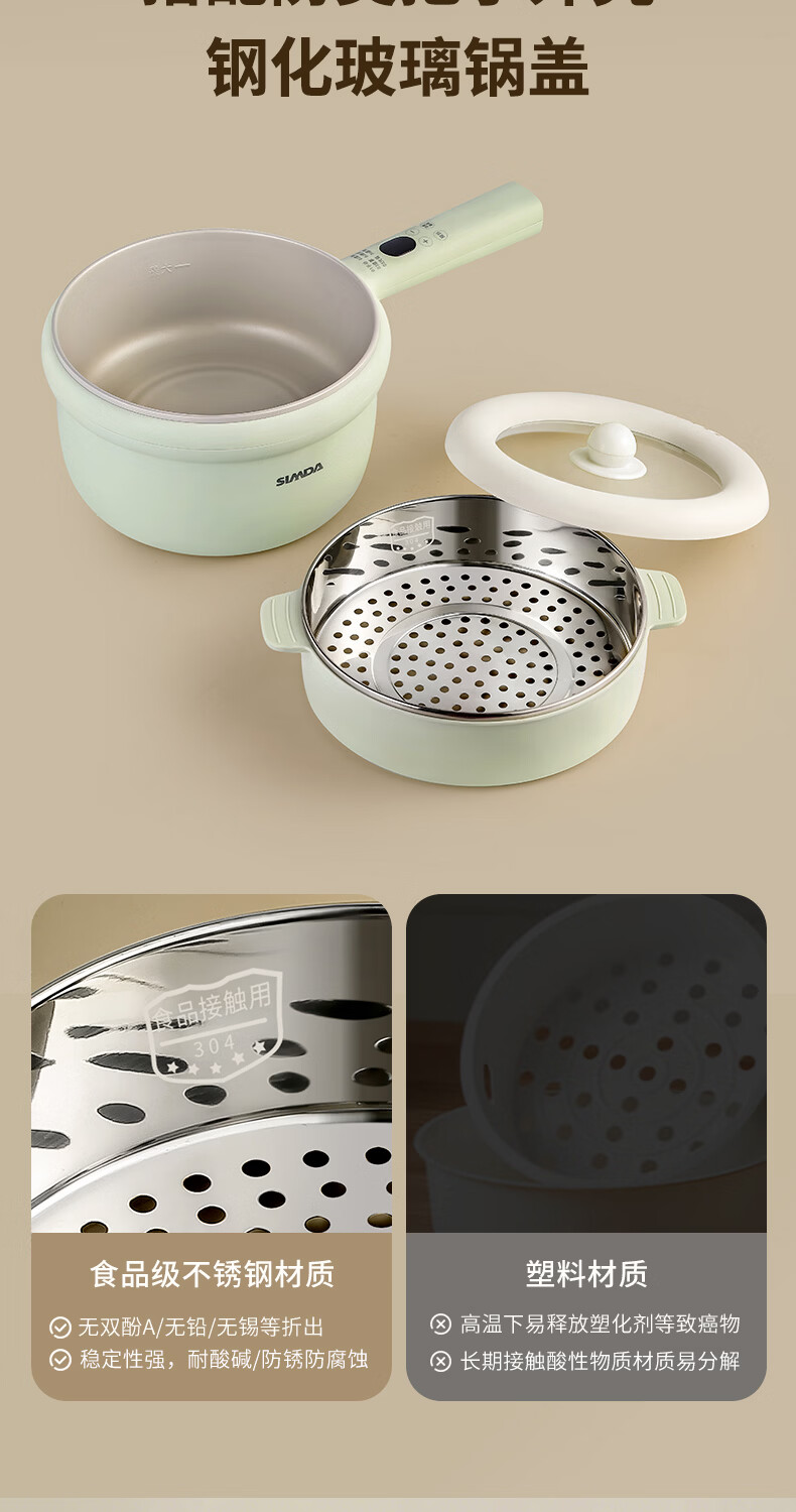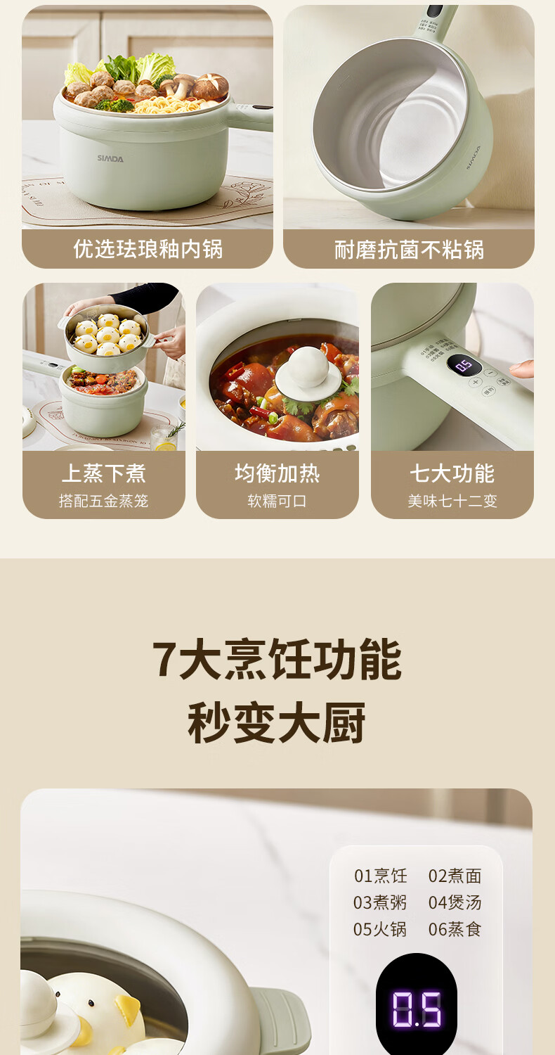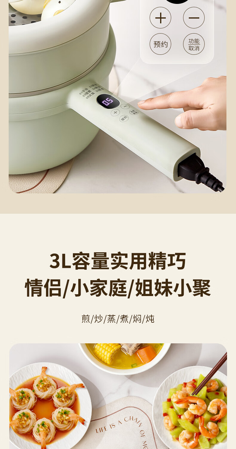 SIMDA斯密达电煮锅2-3人电火锅煎炒蒸煮一体电锅多功能锅珐琅釉电炒锅家用小型不粘锅智能款宝宝辅食锅带蒸笼新款 3L【珐琅釉内胆+12H预约】蒸笼款