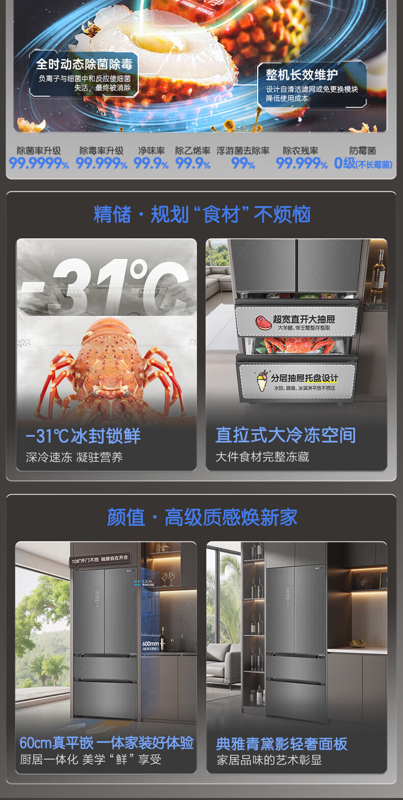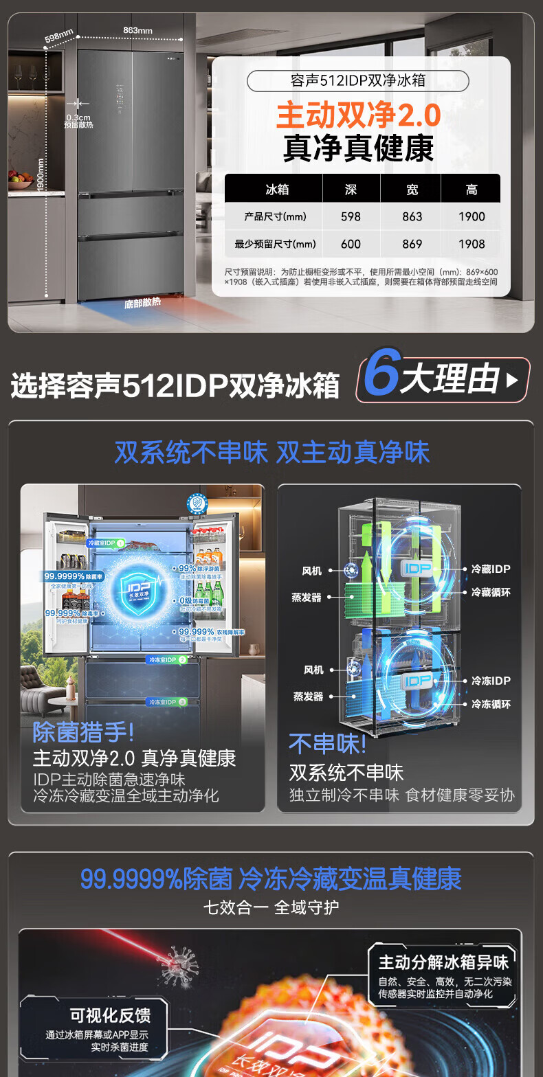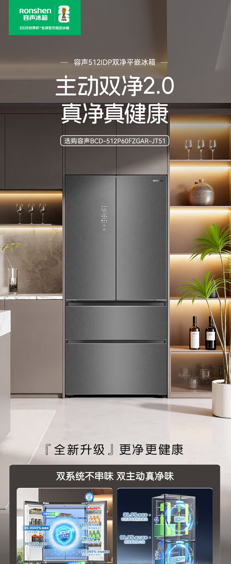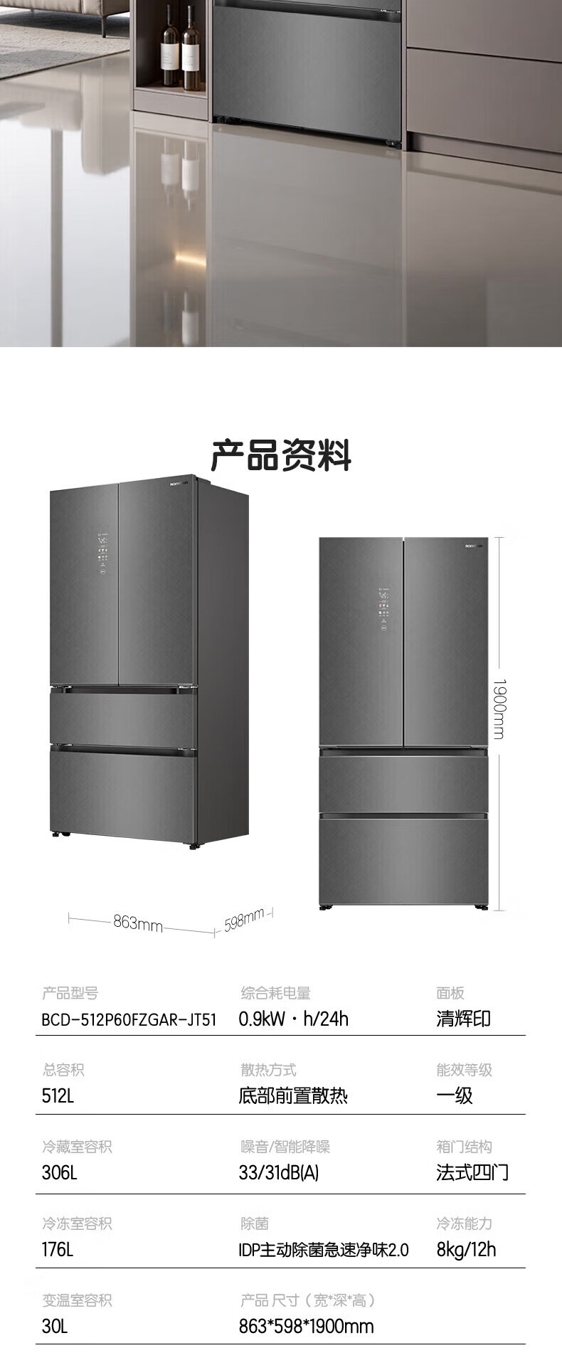 容声512升双系统三循环60CM平嵌十字四门家电冰箱一级能效变频风冷 BCD-512P60FZGAR清辉印