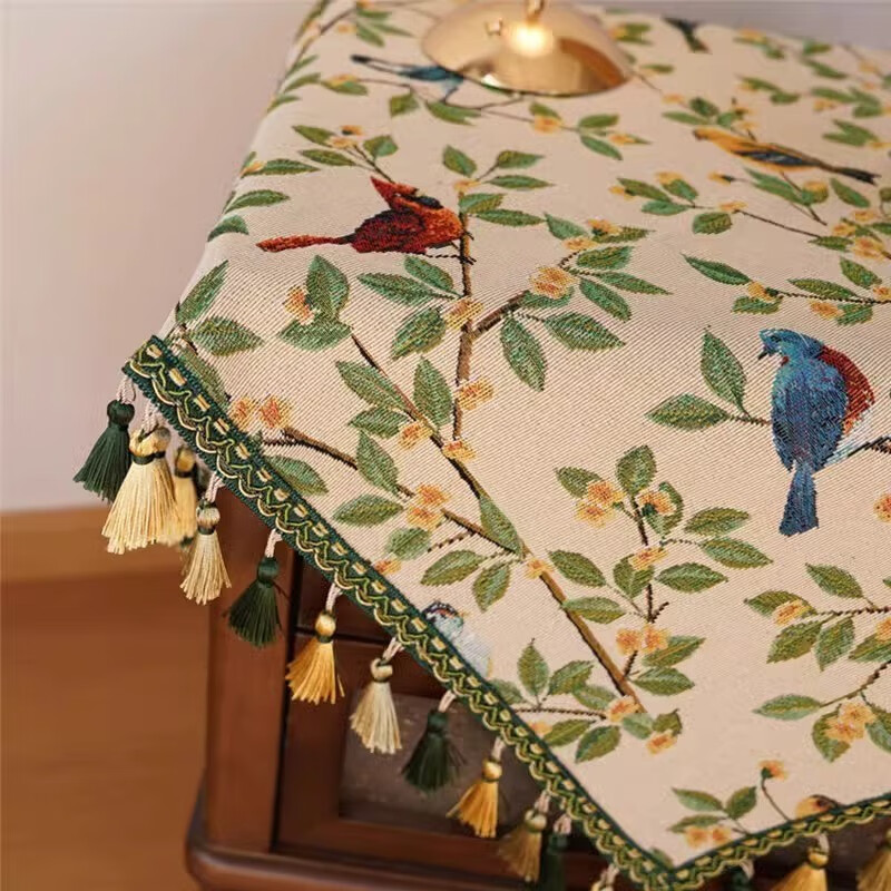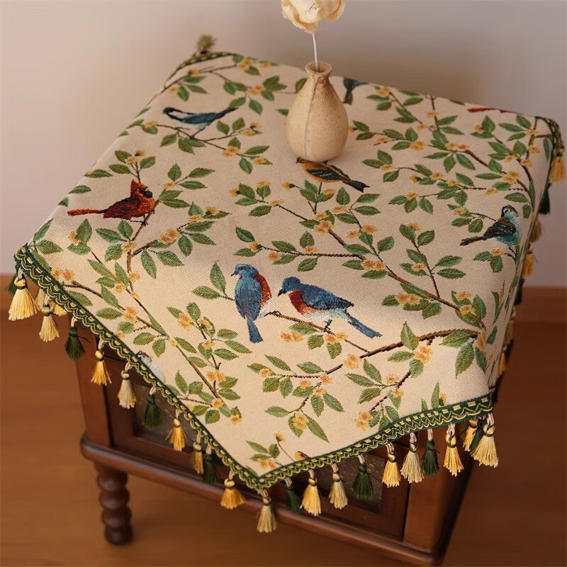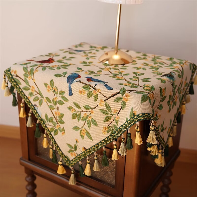 鹿婕法式复古风枝头鹦鹉桌布棉麻高级拍照氛围感床头柜保护垫防尘垫 枝头鹦鹉 四周绿色坠子【请勿机洗】 120*120cm
