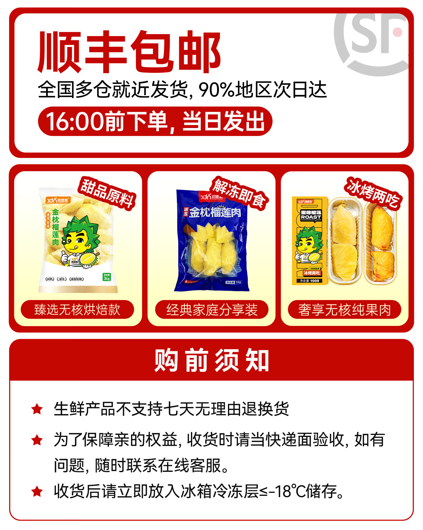 喜德农泰国金枕榴莲果肉无核1kg/袋树熟速冻新鲜冷冻榴莲肉水果顺丰包邮 【买10盒送2盒】无核果肉100g/盒【到手12盒】