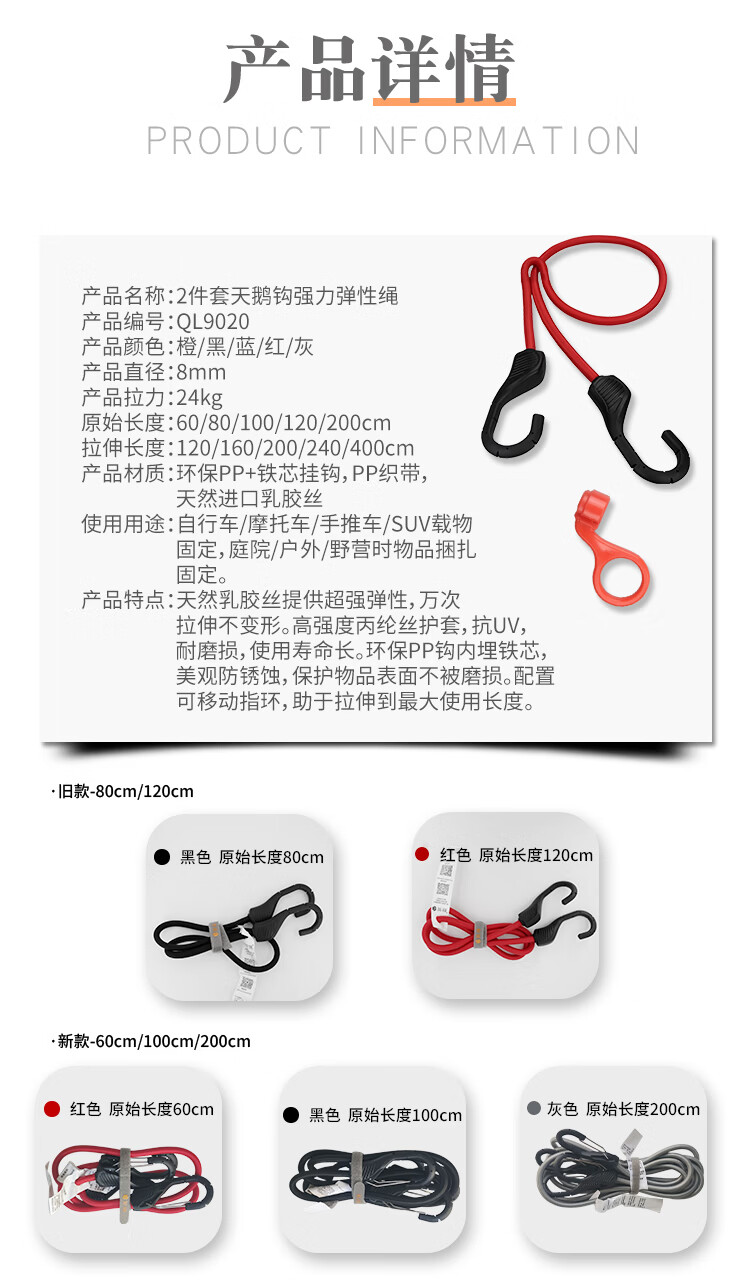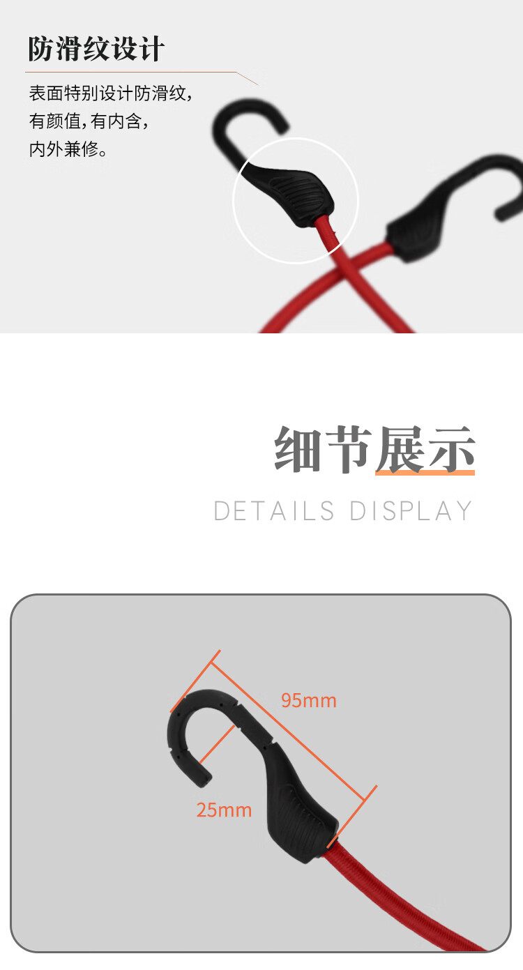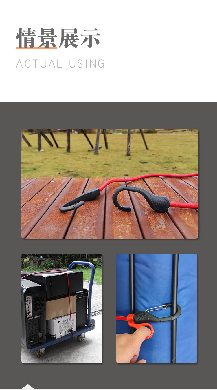 箭鎮箭镇2根装加大加粗包塑钢钩行李绳弹力自行车捆绑绳摩托车绑带 挡片款-灰色2根 200cm