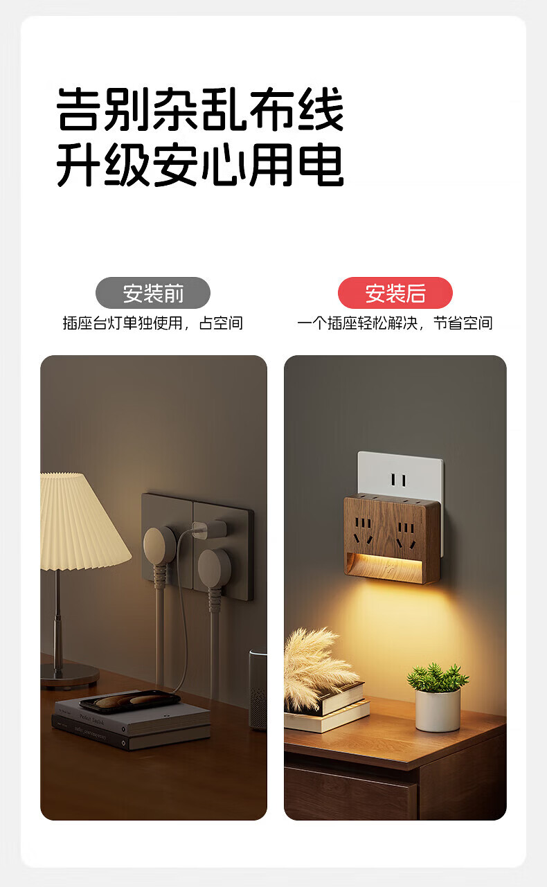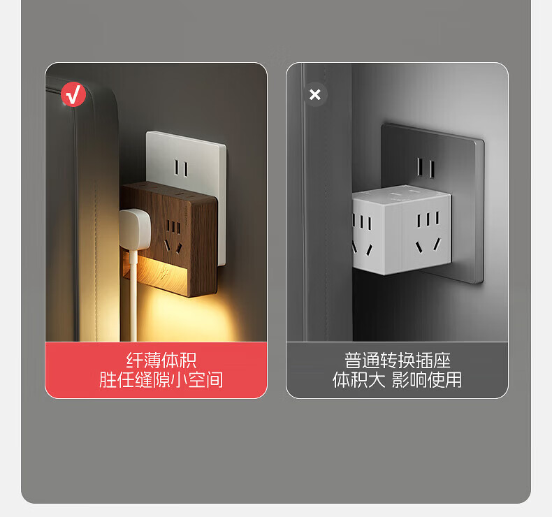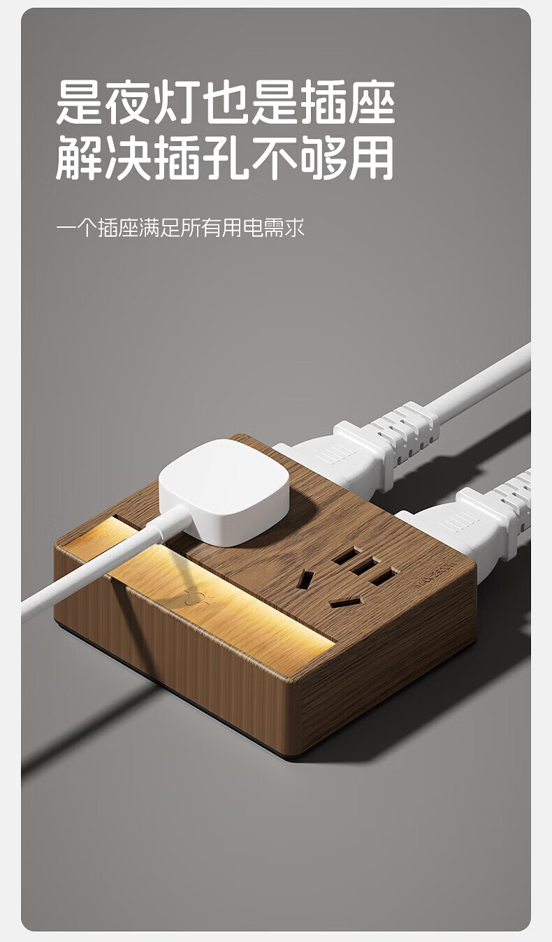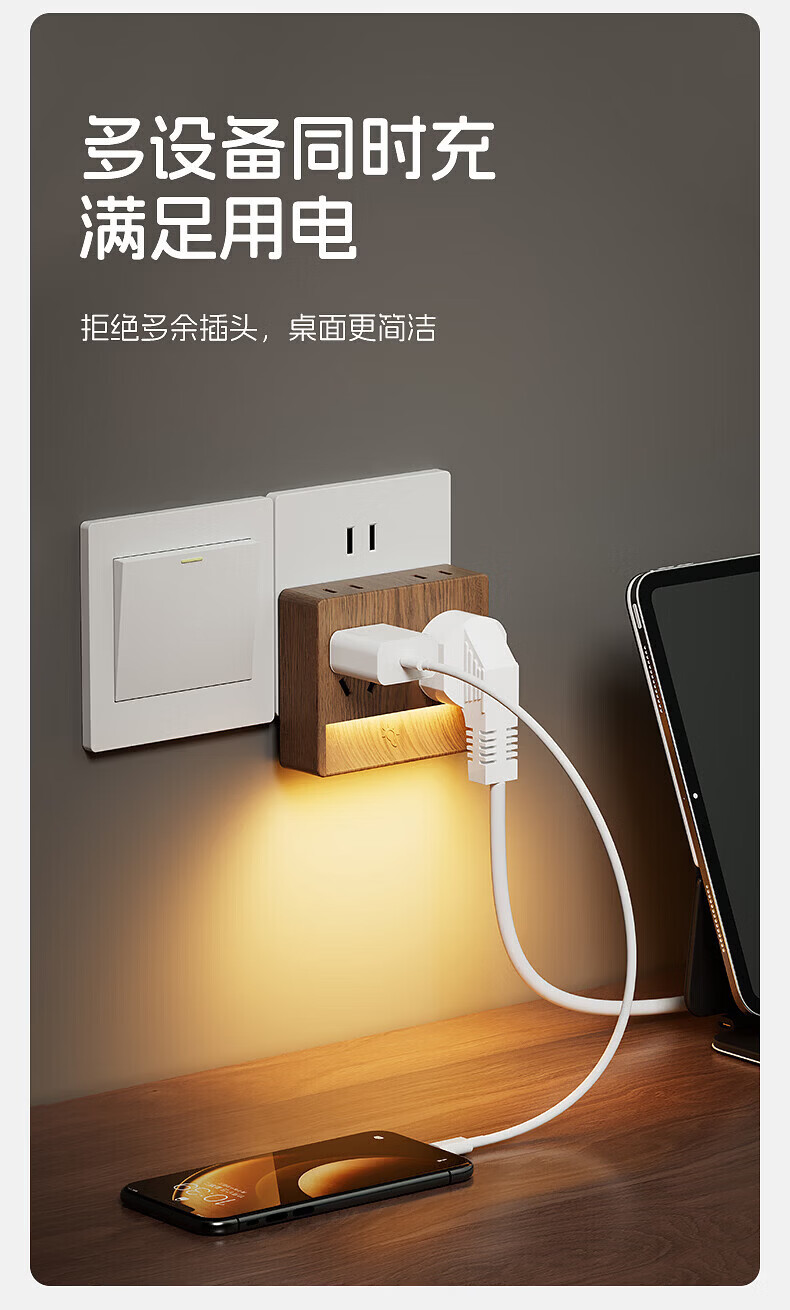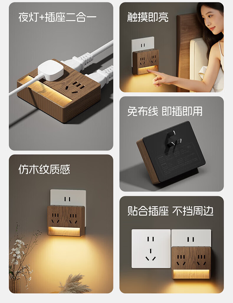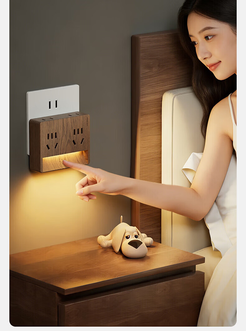 国际电工(FDD)无线插座转换器一转四扩展插座复古木纹床头小夜灯暖光护眼插排 【木纹触摸款】一转四夜灯插座