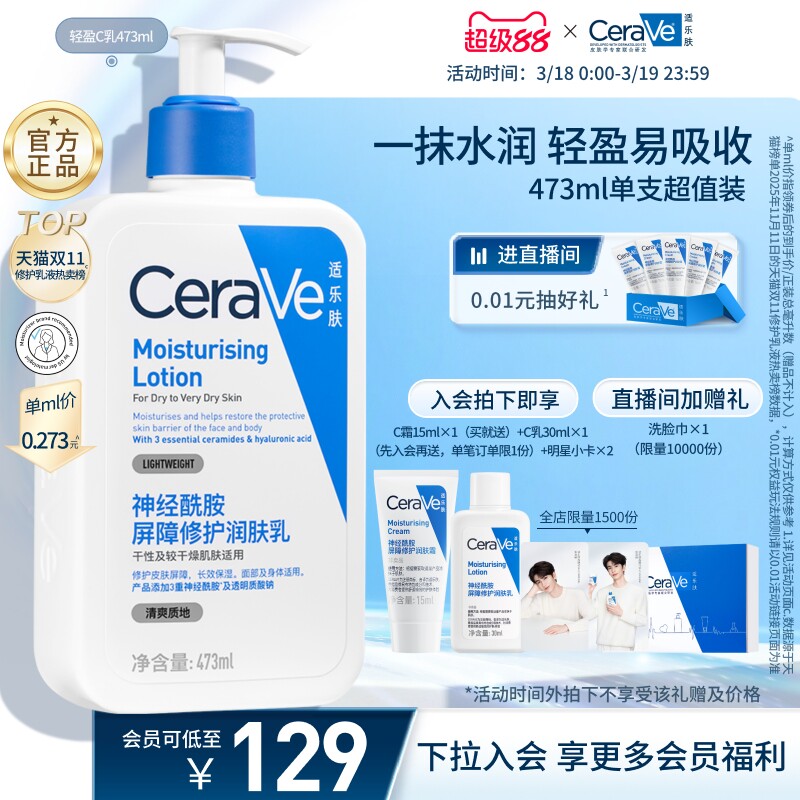 CeraVe适乐肤C乳修护身体乳液 【售价】:¥103.80 【券后】:¥78.80 【优惠券】:¥25 推荐理由:【到手236ml适乐肤C乳!】专业修护肌肤屏障,24小时保湿不闷痘,清爽好吸收,敏感肌必备!美国皮肤学配方,水润一整天! 👉复制这条信息打开【手机淘宝APP】即可领券购买:/