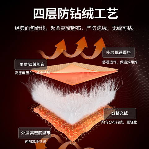 甄选胸腹之间绵密大朵鸭绒轻盈无梗,饱满有弹性。经去异味工艺处理,营造温暖舒适体感