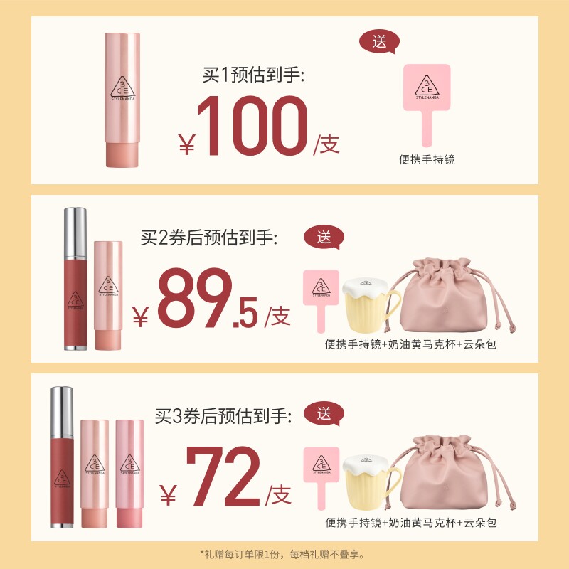 【直播间限时立减】3CE好气色润唇膏 裸色镜面唇釉口红滋润礼物 【售价】:¥300.00 【券后】:¥206.00 【优惠券】:¥94 推荐理由:拍3支原价357-立减57-商品券94-淘金币抵扣2-限时红包4-满200减25消费券到手每支58.33元!!! 👉复制这条信息打开【手机淘宝APP】即可领券购买:/