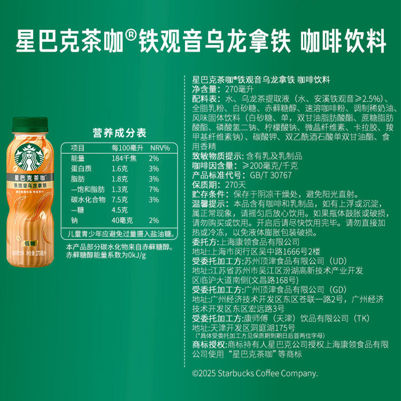 Starbucks/星巴克茶咖铁观音乌龙拿铁270ml*15瓶低糖即饮咖啡饮料