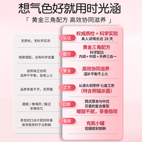 时光涵元气茶,红参西洋参配方,专为女士设计,补气养血养颜,改善宫寒,口感醇香,养生必备!