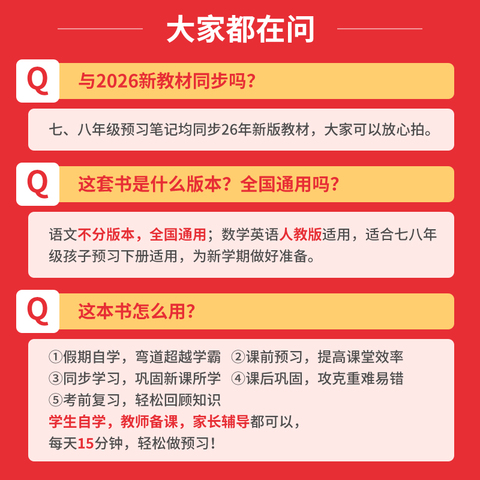 送三步预习单!一本七八年级下册课本预习笔记,7-8年级下册,课本预习笔记,语文、数学、英语任选,同步课本内容,名师笔记批注,440节音视频,180套期中期末卷,课后习题全解,寒假每天3件事,领跑新学期