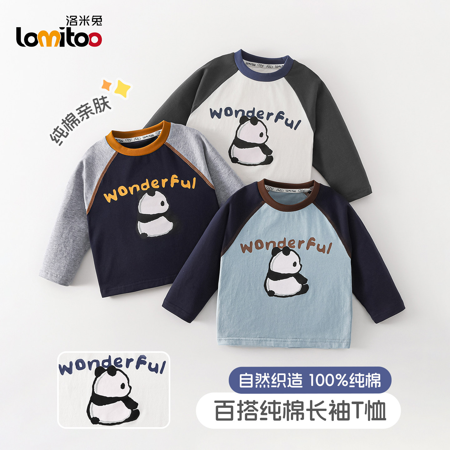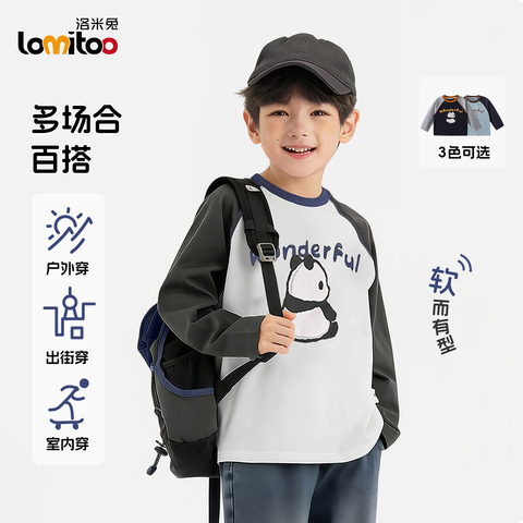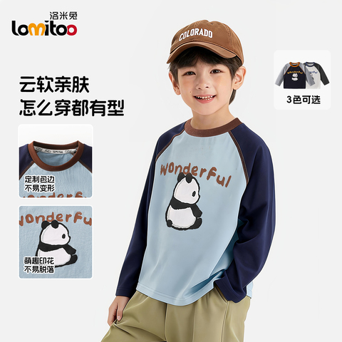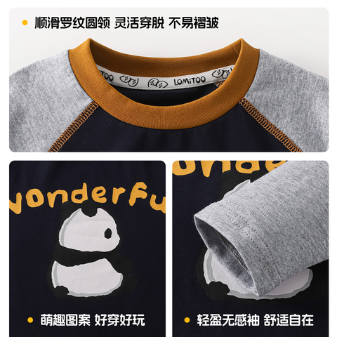 洛米兔2026春季新款儿童纯棉长袖T恤男童卡通熊猫插肩袖打底衫潮