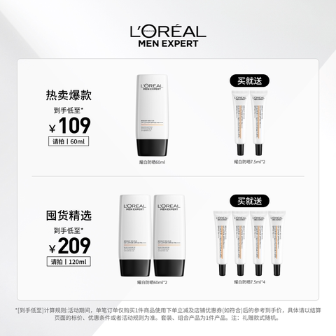 户外高倍防晒天花板!! 【欧莱雅】男士耀白防晒霜 赠美白防晒7.5ml*②支[礼物] 共75ml,88vip[\u1f4b0]80.4亓 防晒实力派[\u1f967]变黑长斑不可能