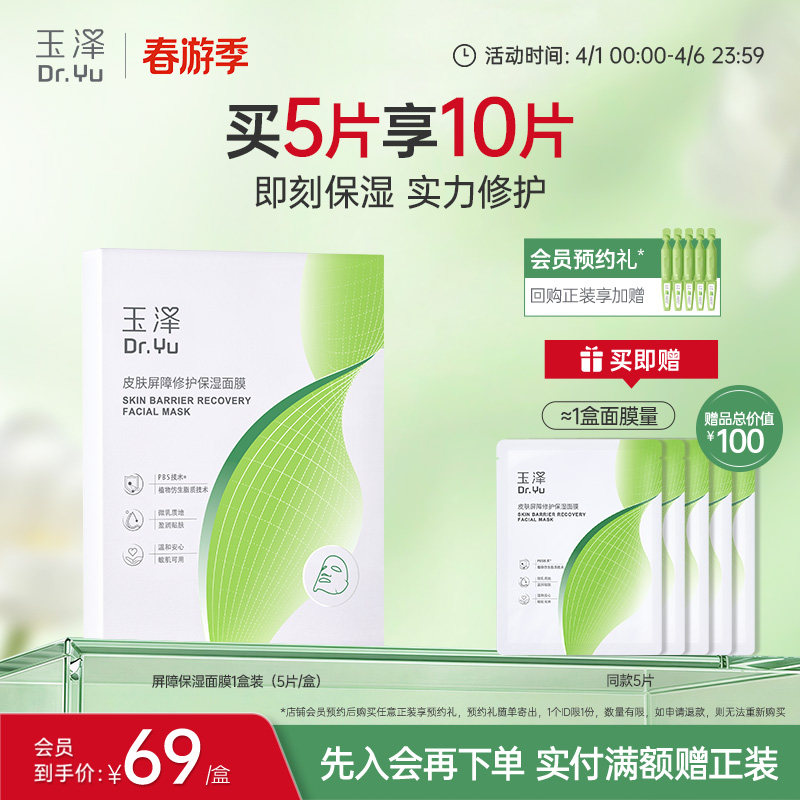 【原价124-商品券55-88vip95折减3.45-淘金币抵扣2.48到手63.07】玉泽屏障修护保湿面膜5片,敏感肌专属,舒缓干燥泛红,深层补水维稳,温和修护,肌肤更健康!