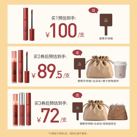 3CE水雾唇露雾面持久乌龙奶茶色 【售价】:¥94.05 【券后】:¥89.05 【优惠券】:¥5 推荐理由:标价357到手三支153单支51(357-57立减-94淘客券-15.69淘金币-15品类券-21.9消费券)赠送玻璃吸管杯+云朵包+便携手持镜轻透露水质地,一抹瞬间水光变哑光,一抹成膜,持久不脱色,轻若无感,宛如天生唇色~【赠运费险】 👉复制这条信息打开【手机淘宝APP】即可领券购买:/