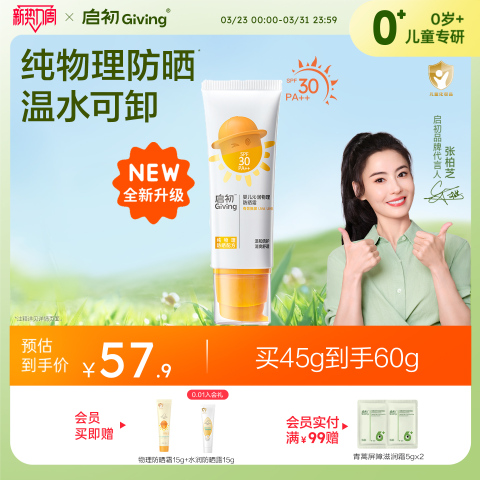 券后叠加淘金币+88vip到手45.06,启初婴儿沁润物理防晒霜宝宝防晒乳防晒乳(SPF30PA++)45G