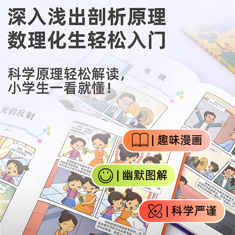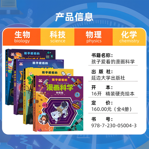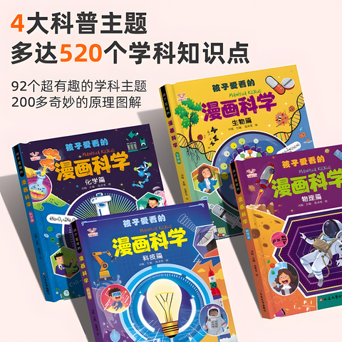 单本96页!老师推荐,漫画科学精装硬壳4册,4大科普主题多达520个学科知识点,92个超有趣的学科主题200多奇妙的原理图解,科学原理轻松解读,小学生一看就懂!