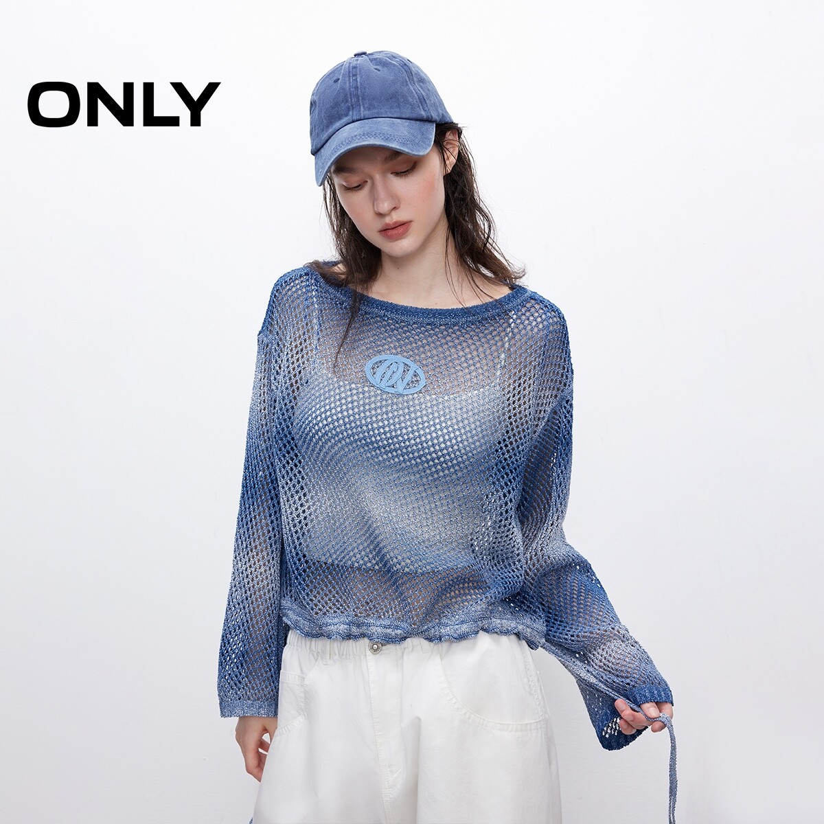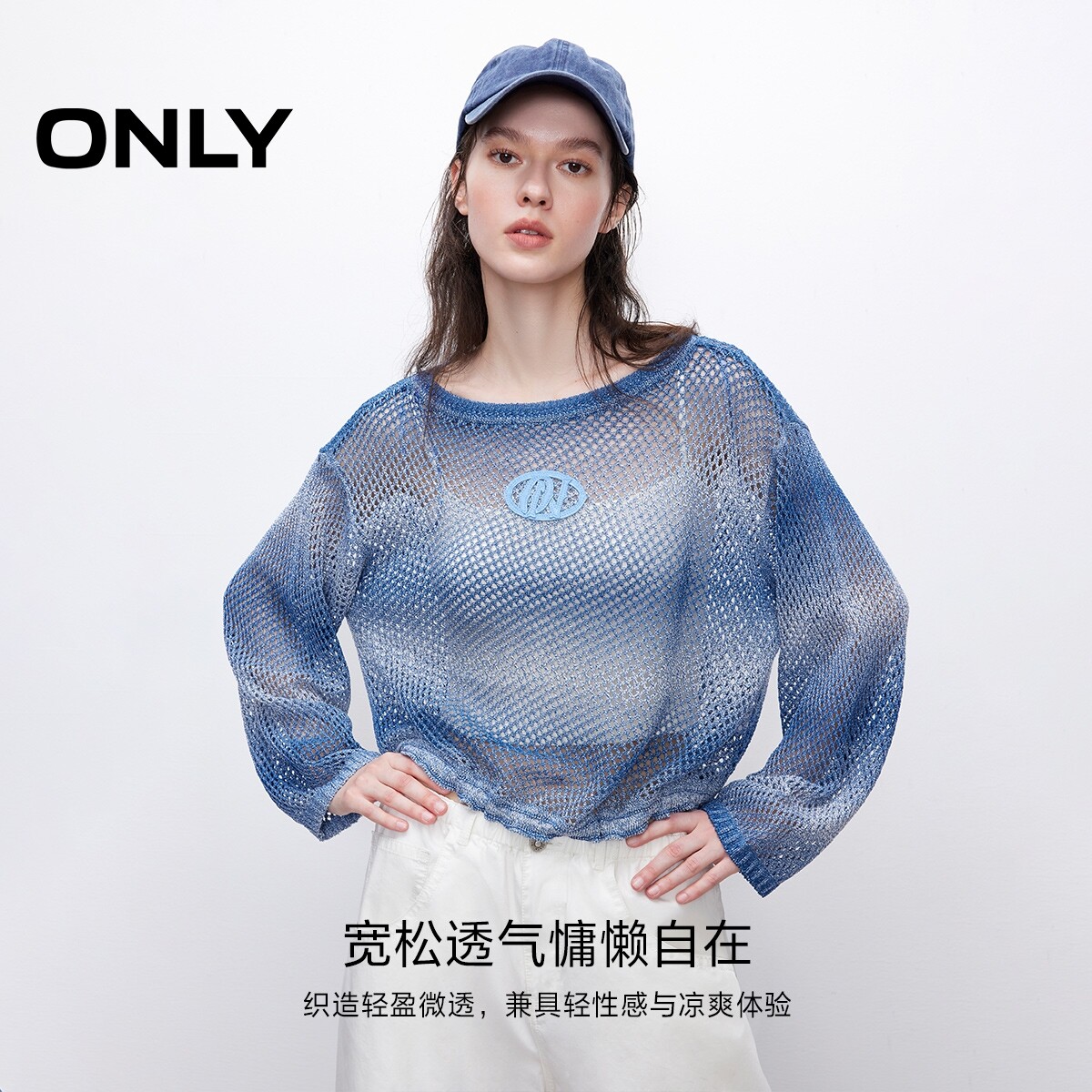 【ONLY奥莱】春季新款个性渐变时尚抽绳设计落肩圆领宽松针织衫女
