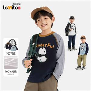 洛米兔2026春季新款儿童纯棉长袖T恤男童卡通熊猫插肩袖打底衫潮