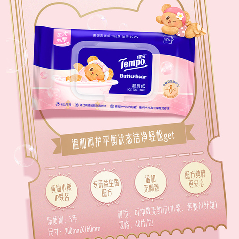 Tempo/得宝黄油小熊联名益生菌湿厕纸加大加厚0添加