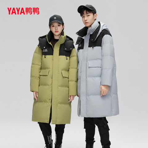 鸭鸭羽绒服男女冬季新品过膝情侣连帽时尚百搭拼色中长款保暖外套!!