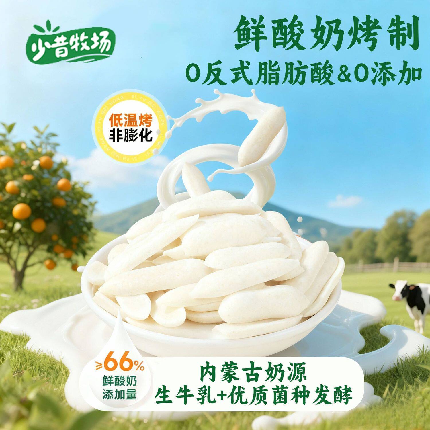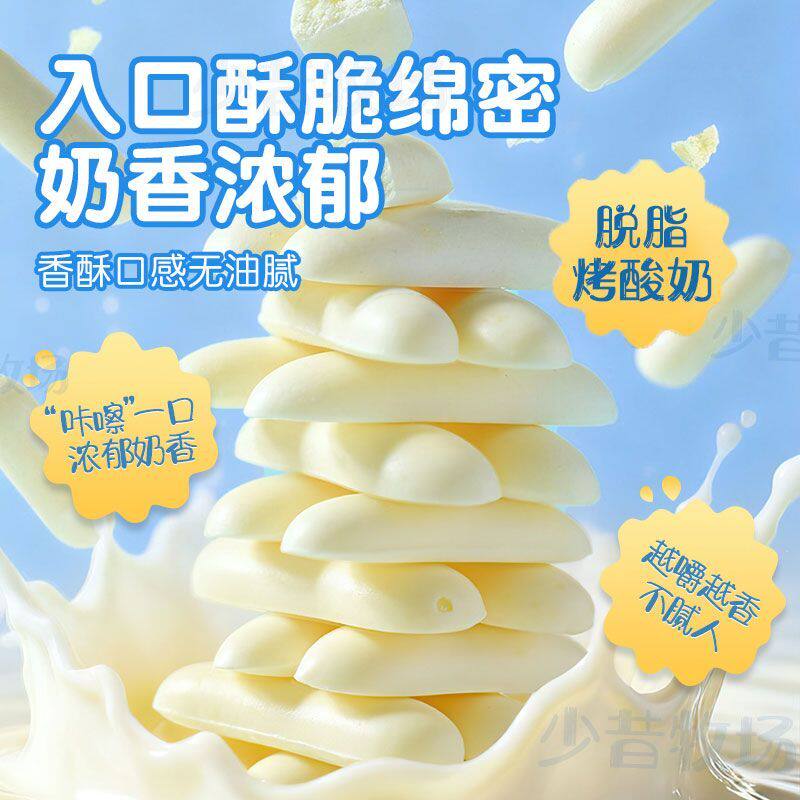 少昔牧场烤酸奶皮脆片,全新升级,不加一滴水,内蒙优质奶源,7.1倍牛乳蛋白+7.4倍牛乳钙,钙和蛋白质轻松吃,入口酥脆绵密,奶香浓郁,越嚼越香不腻人,0反式脂肪酸,非油炸制作,营养更健康,速抢