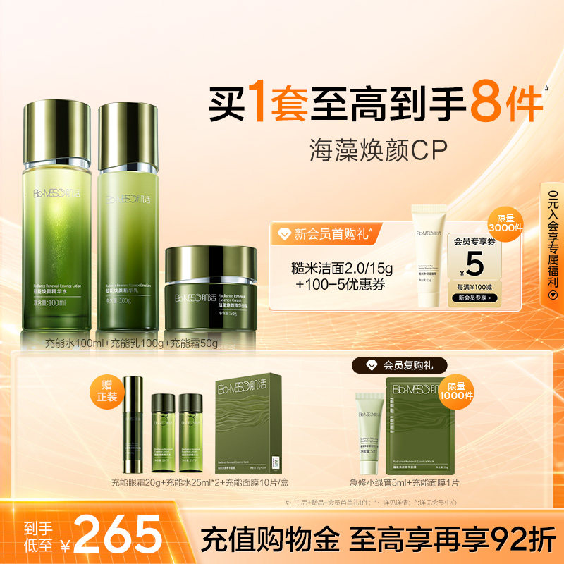【赠充能水25ml+充能乳15g+充能面膜1片;新会员首购礼:糙米洁面2.0(15g)+100减5元券(限量3000件);会员复购礼:急修小绿管5ml+充能面膜1片(限量1000件);首单礼金15元,淘金币抵扣1.52元,到手92.48元】抗老紧致护理推荐——BM肌活焕能套组,肌肤干燥暗沉?这套水乳霜组合来帮忙!海藻成分逐层赋能,保湿同时紧致提亮。水润质地易吸收,日常护理很安心。