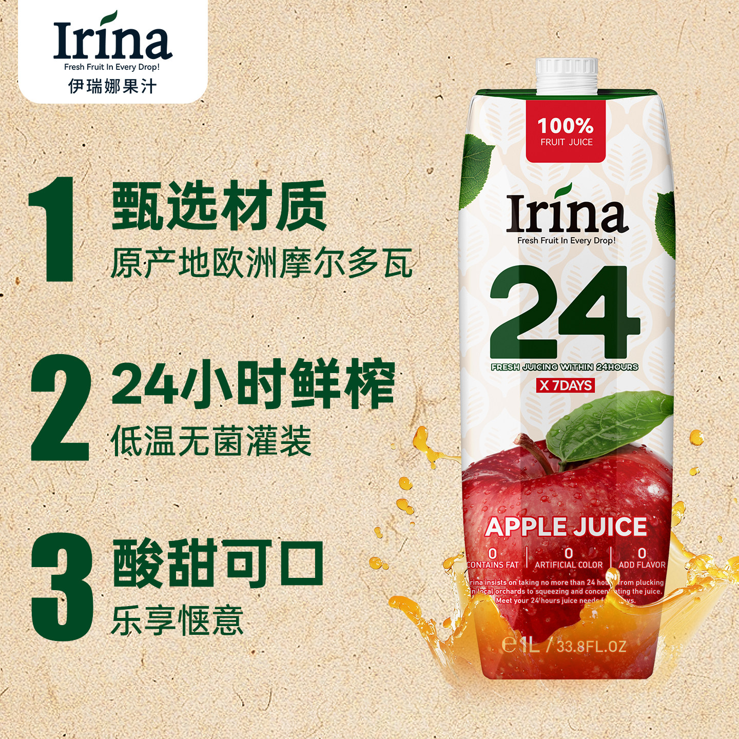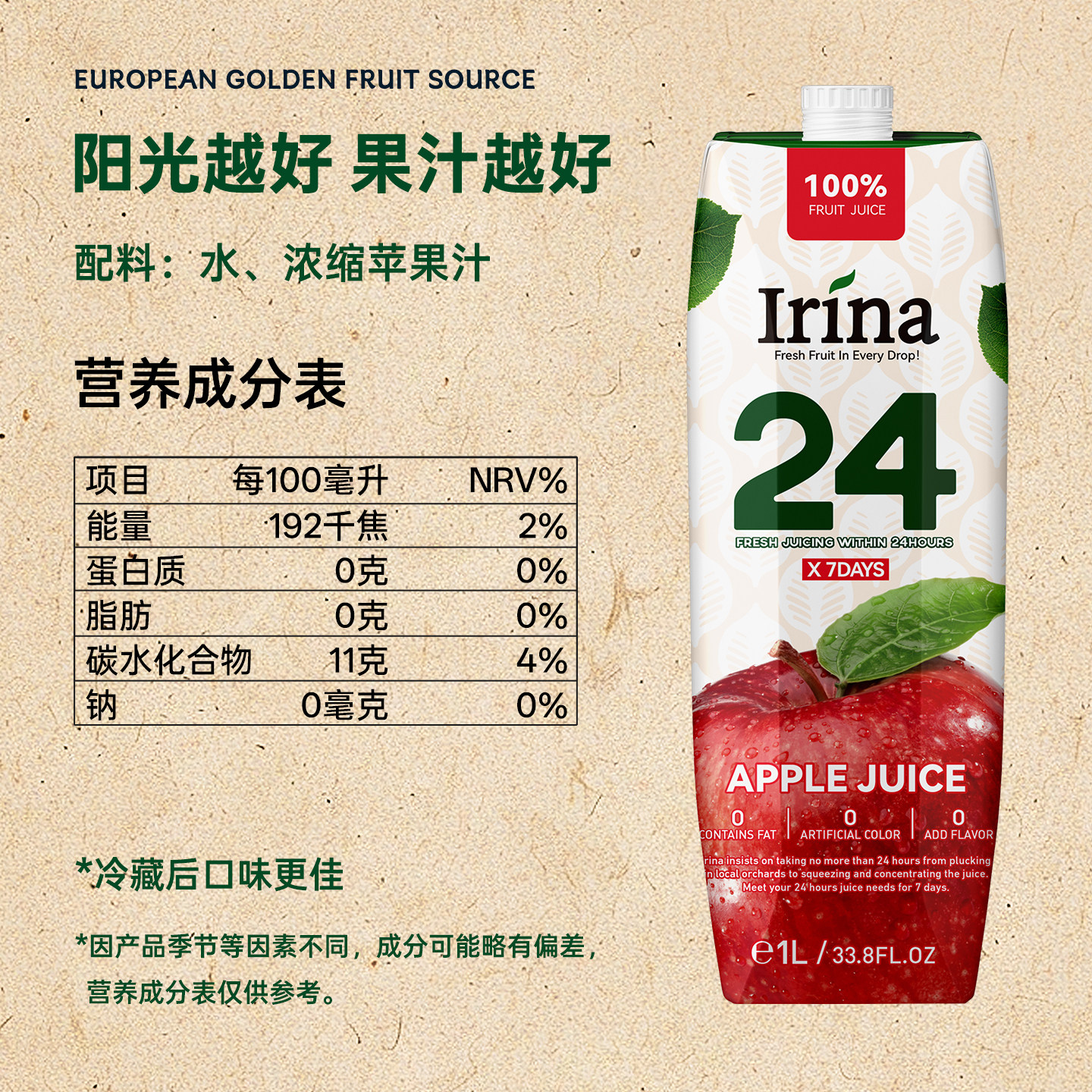 伊瑞娜进口果蔬汁苹果汁桃子汁胡萝卜木梨混合口味饮料液体沙拉1L