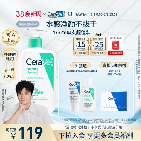 CeraVe氨基酸洗面奶236ml,温和清洁不刺激,泡沫细腻易冲洗,含神经酰胺修护屏障,适合敏感肌。现拍1件仅需64.9元,赠品丰富,详情页可领券叠加优惠!