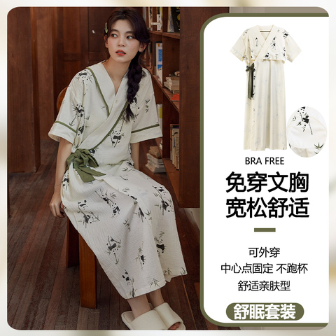 云朵棉系带睡袍女夏季甜美短袖睡裙和服中长款带胸垫睡衣家居服