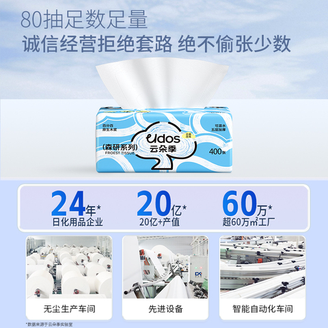 云朵季这款森研年轮抽纸,采用5层加厚工艺,实实在在的400张大容量,韧性强不易破,湿水后依然紧实耐用,吸水性表现优异。精选优质原生木浆制作,纸质细腻亲肤,不含荧光增白剂,呵护全家肌肤健康。/plain 抽式设计方便取用,无论是居家日常、餐饮清洁还是个人护理都能轻松应对。环保无香配方,清新自然无异味。超高性价比的实惠装组合,大量囤货提升家庭生活品质
