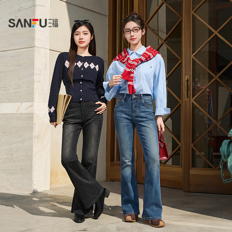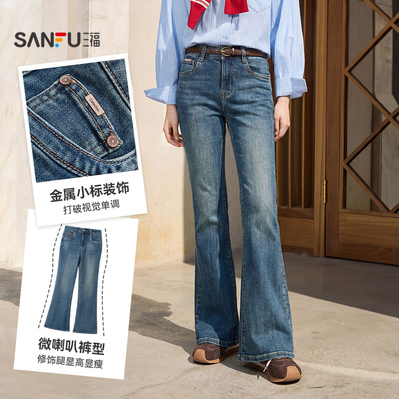 三福牛仔长裤2026新款春季时尚气质微喇裤复古喇叭裤子女装514405