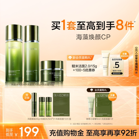 【赠充能水25ml+充能乳15g+充能面膜1片;新会员首购礼:糙米洁面2.0(15g)+100减5元券(限量3000件);会员复购礼:急修小绿管5ml+充能面膜1片(限量1000件);首单礼金4元,淘金币抵扣1.17元,到手88.83元】抗老紧致护理推荐——BM肌活焕能套组,肌肤干燥暗沉?这套水乳霜组合来帮忙!海藻成分逐层赋能,保湿同时紧致提亮。水润质地易吸收,日常护理很安心。